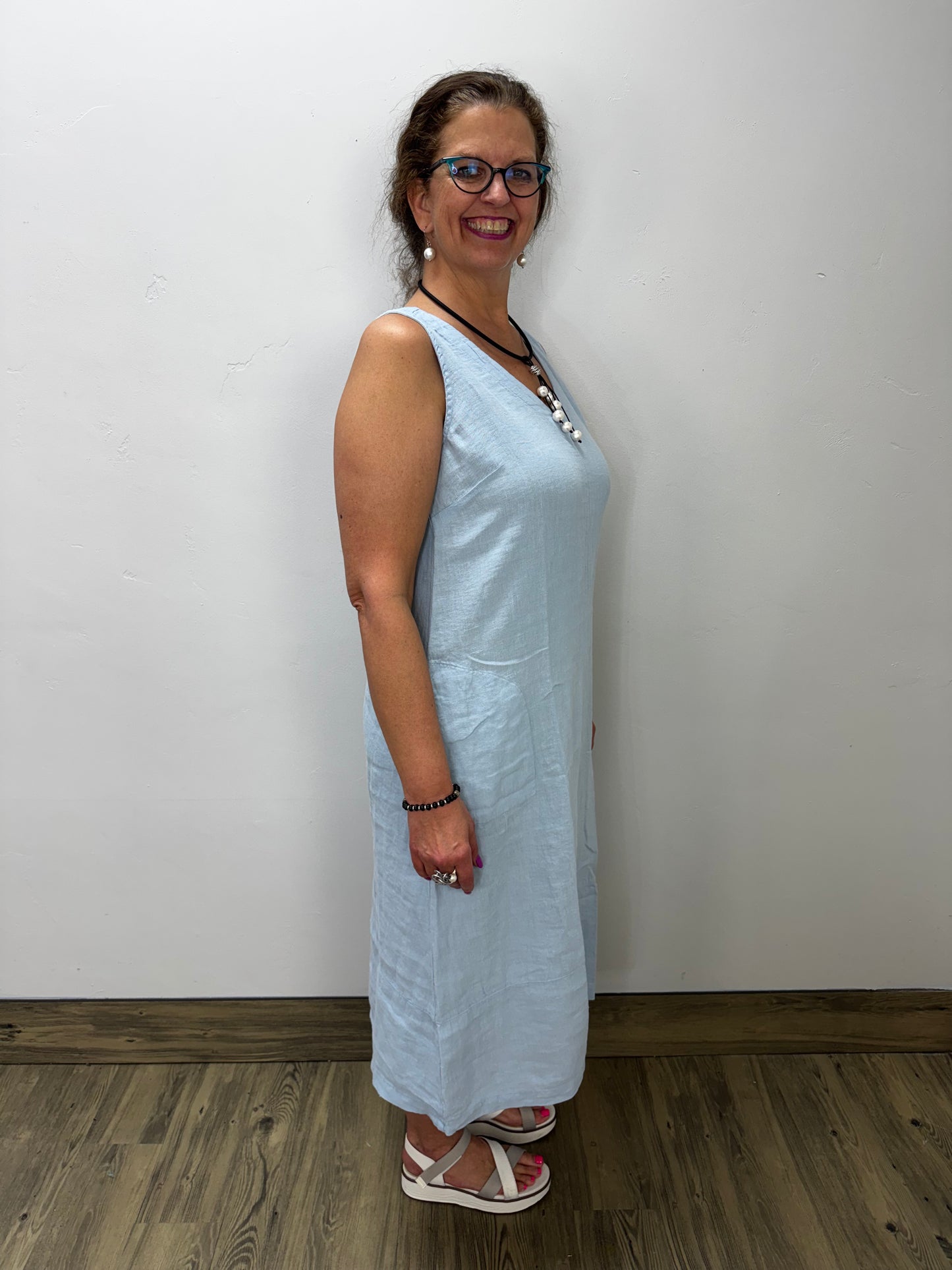 Blue Whimsical Pattern Sleeveless Dress with Slip