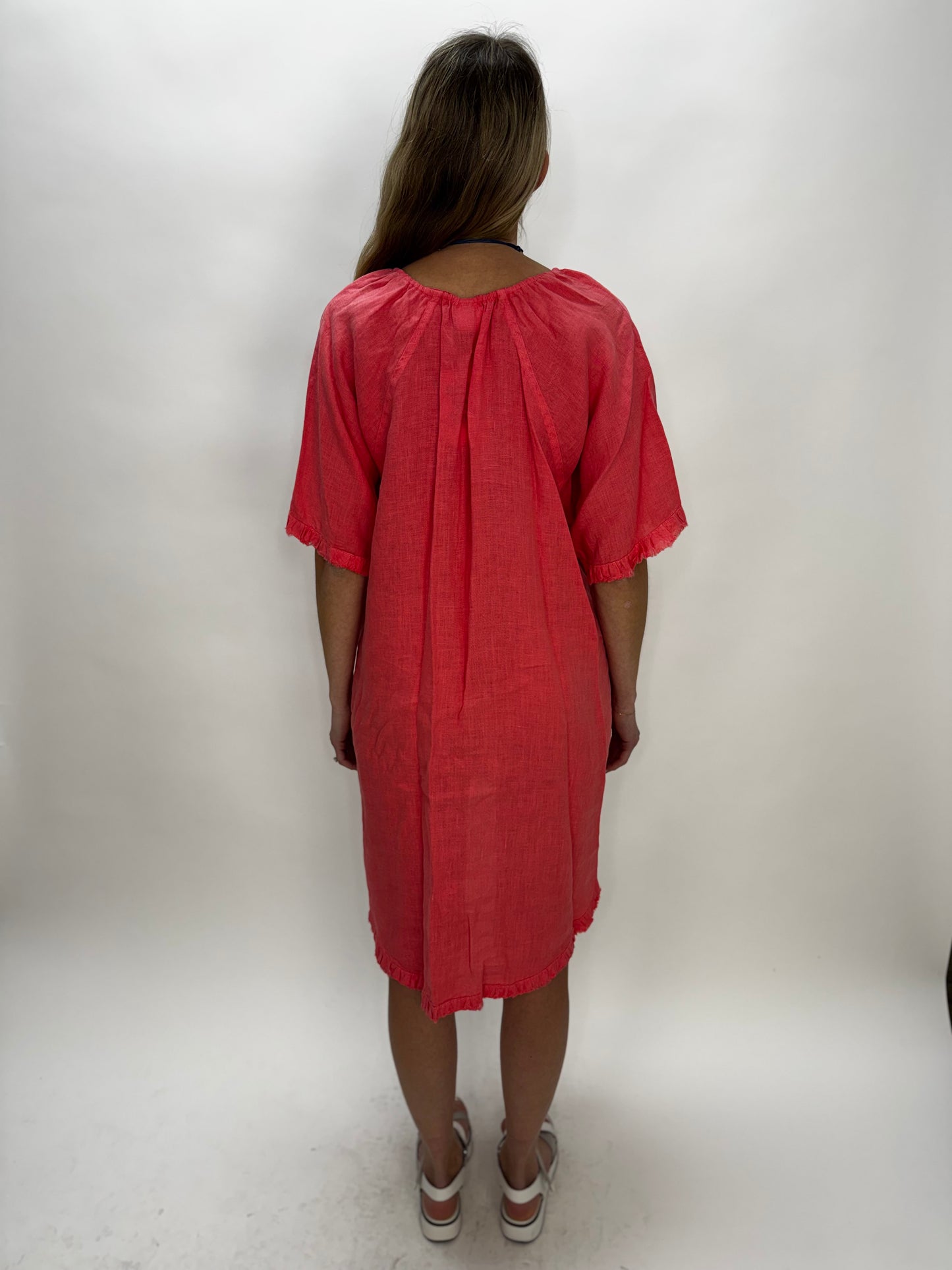 Effortless elegance meets everyday comfort in this peachy orange cotton linen blend dress. Designed with short elbow sleeves and a flattering hi-low hemline, it transitions seamlessly from day to night. The elastic back neckline offers a relaxed fit while two generous side pockets keep your essentials within reach. Perfect for warm weather styling with its breathable fabric and modern seam detailing.