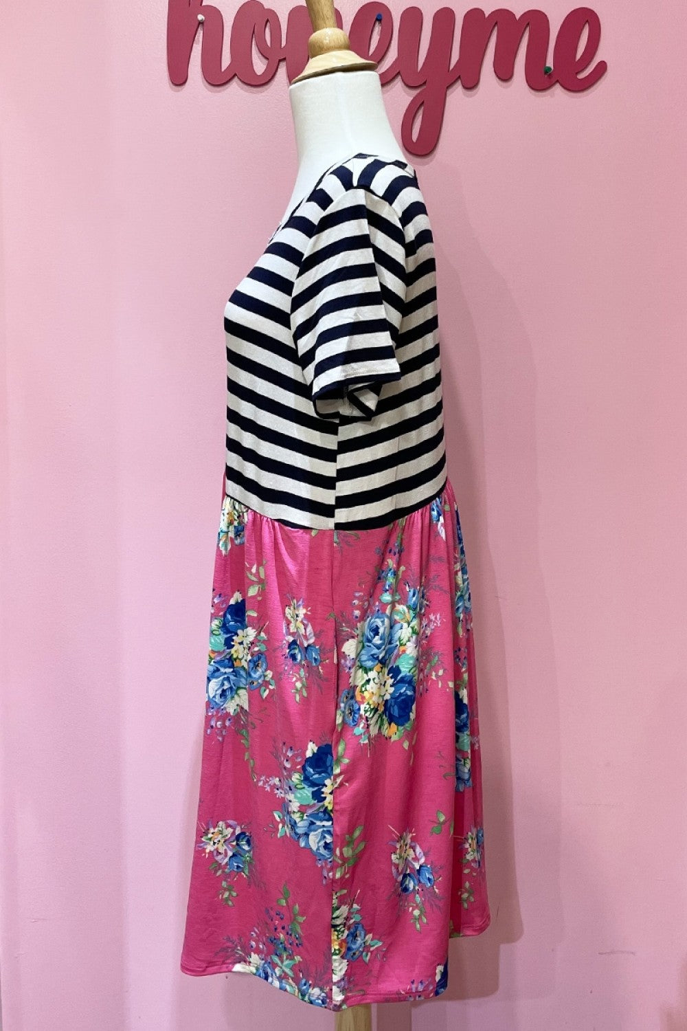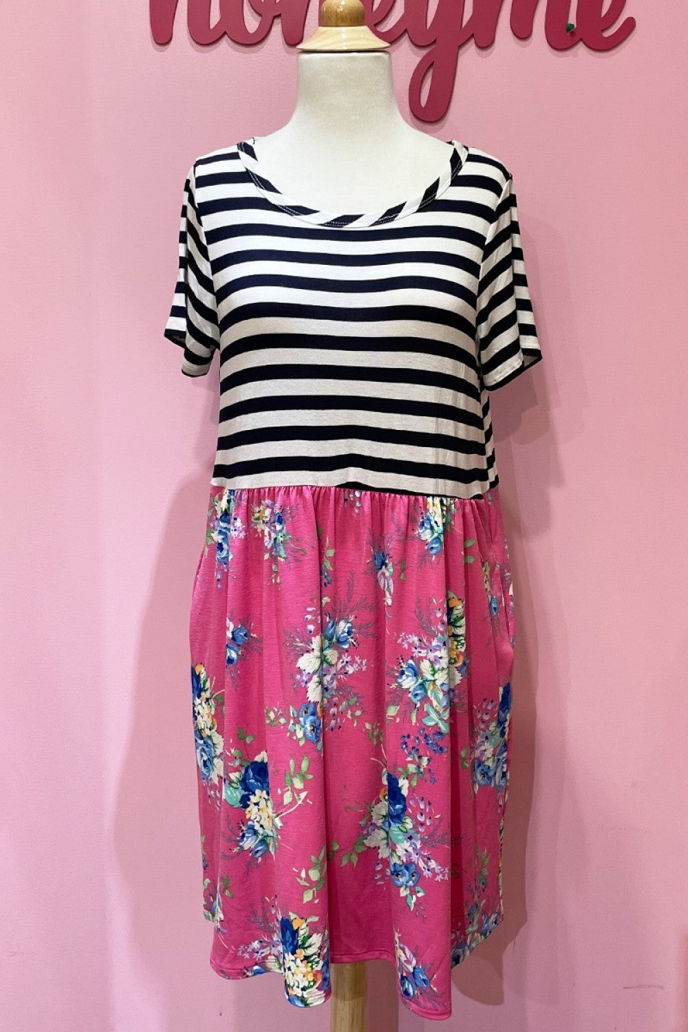 Regular price $24.50Look effortlessly cute in this super fun babydoll dress! Featuring a stripe top and floral print bottom, this dress is perfect for any occasion. With soft fabric and a knee length cut, you'll be both comfortable and stylish!