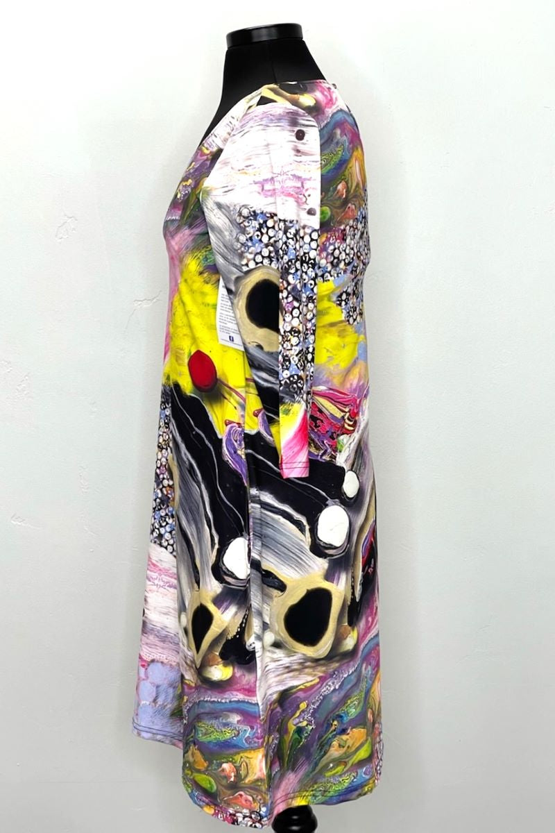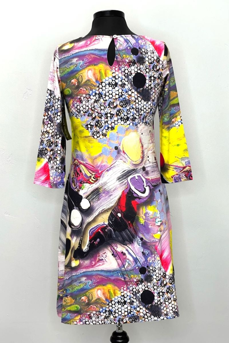 Twist Boutique owner, Trish Bosman, worked with Tango Mango to design this Tango Mango shift dress. Cut with a scoop neckline, 3/4 sleeves and splashes of vibrant colors.