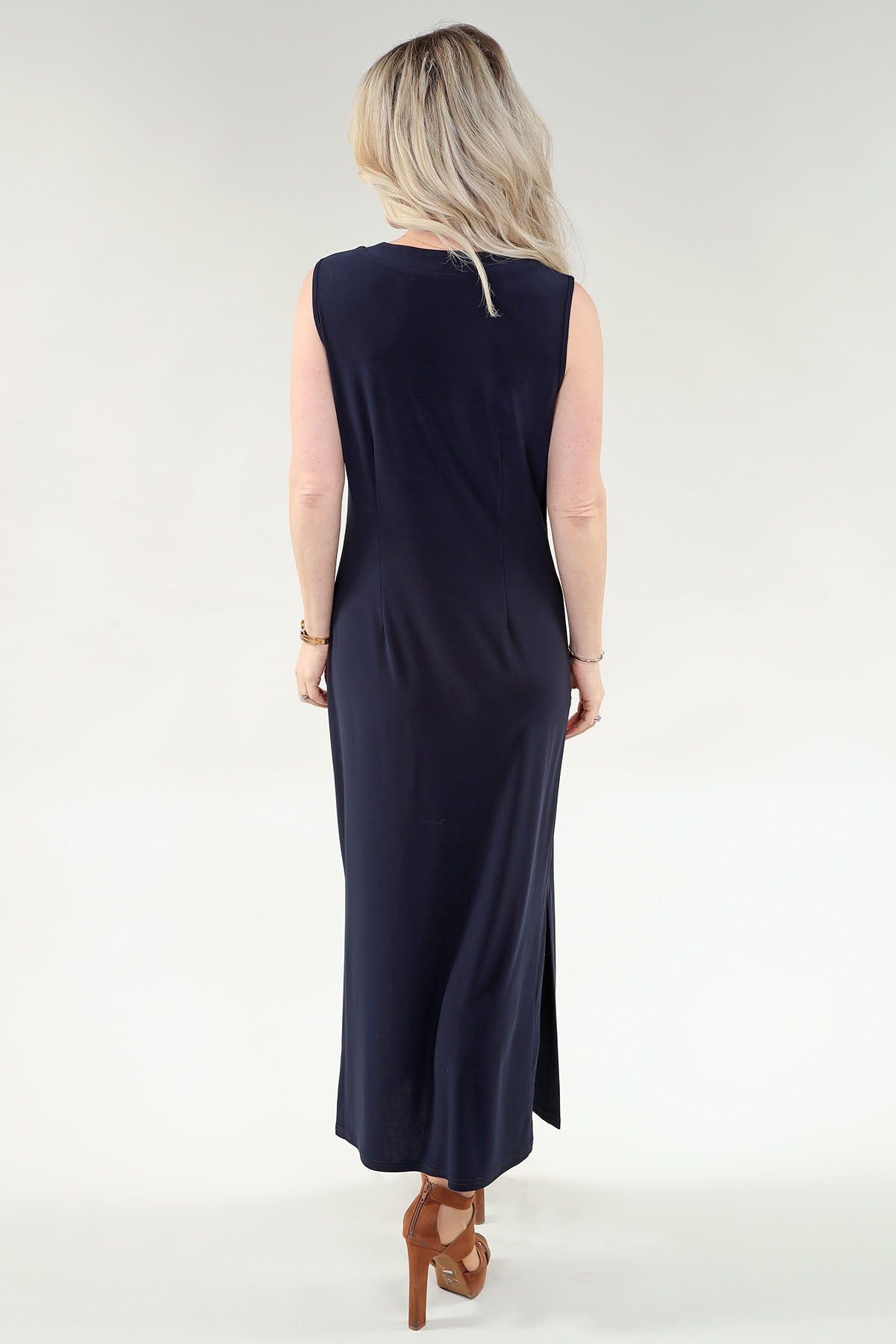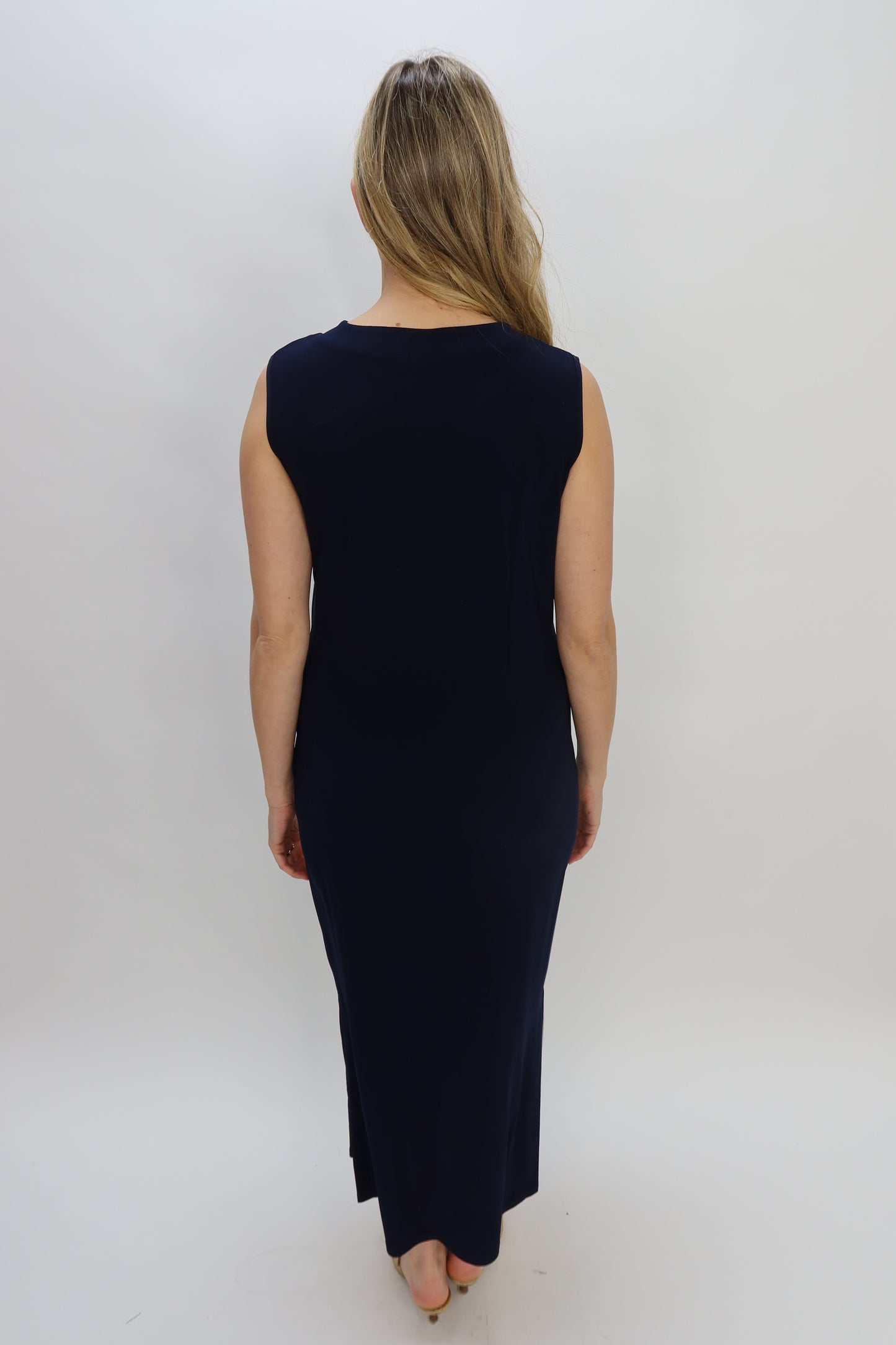 A timeless essential that transitions effortlessly from day to night. This navy sleeveless maxi dress features a luxurious ITY fabric with a fluid drape and flattering scoop neckline. The versatile silhouette pairs beautifully with sneakers and a blazer for casual elegance, or dress it up with heels and statement jewelry for evening sophistication. A wardrobe and timeless staple!