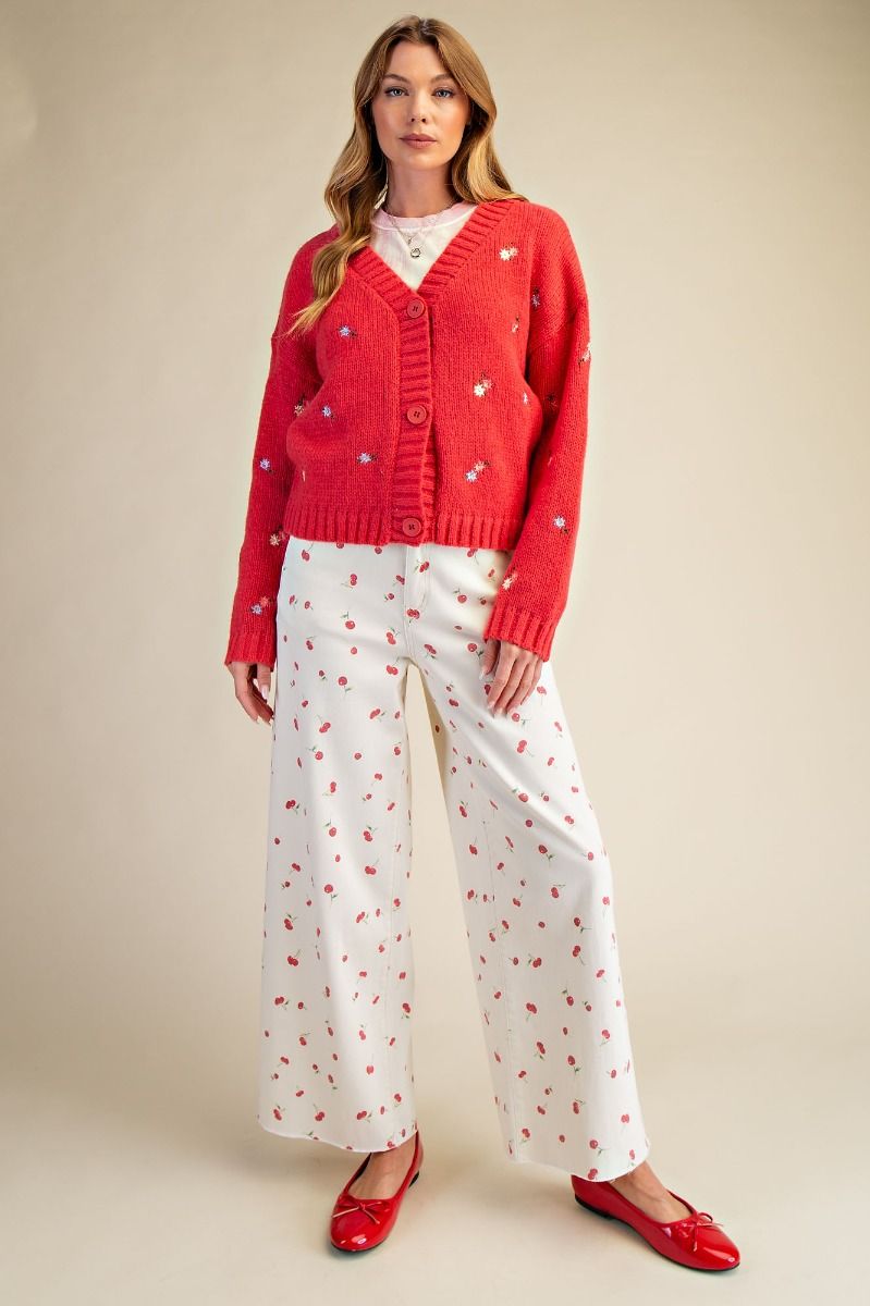 Flower Patch Cream French Terry Knit Wide Leg Pants