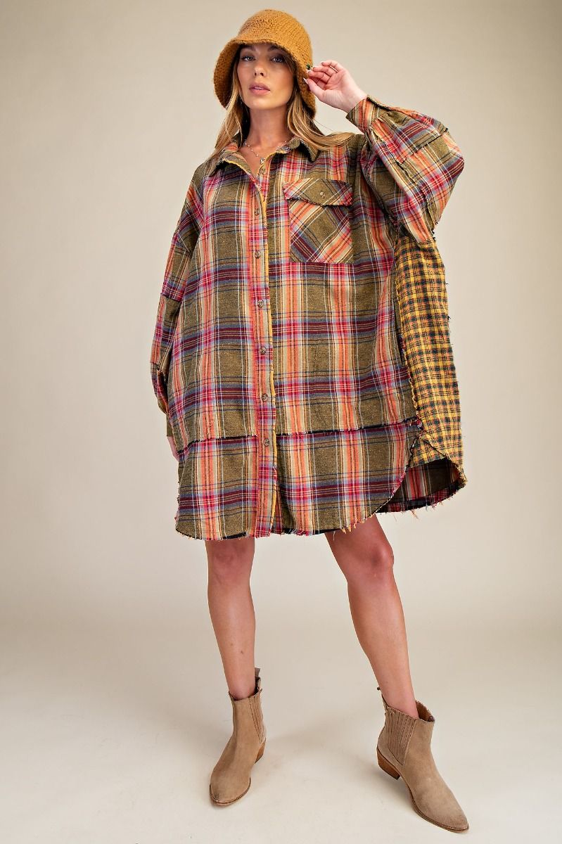 Mineral Washed Plaid Button Down Flannel Tunic Dress