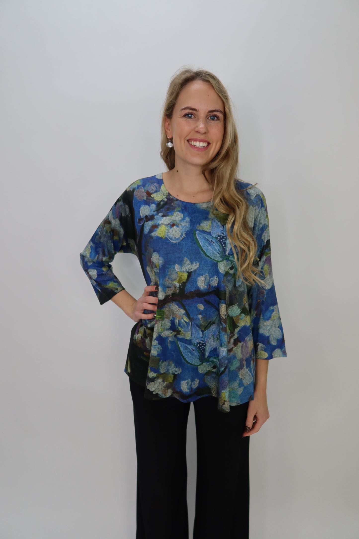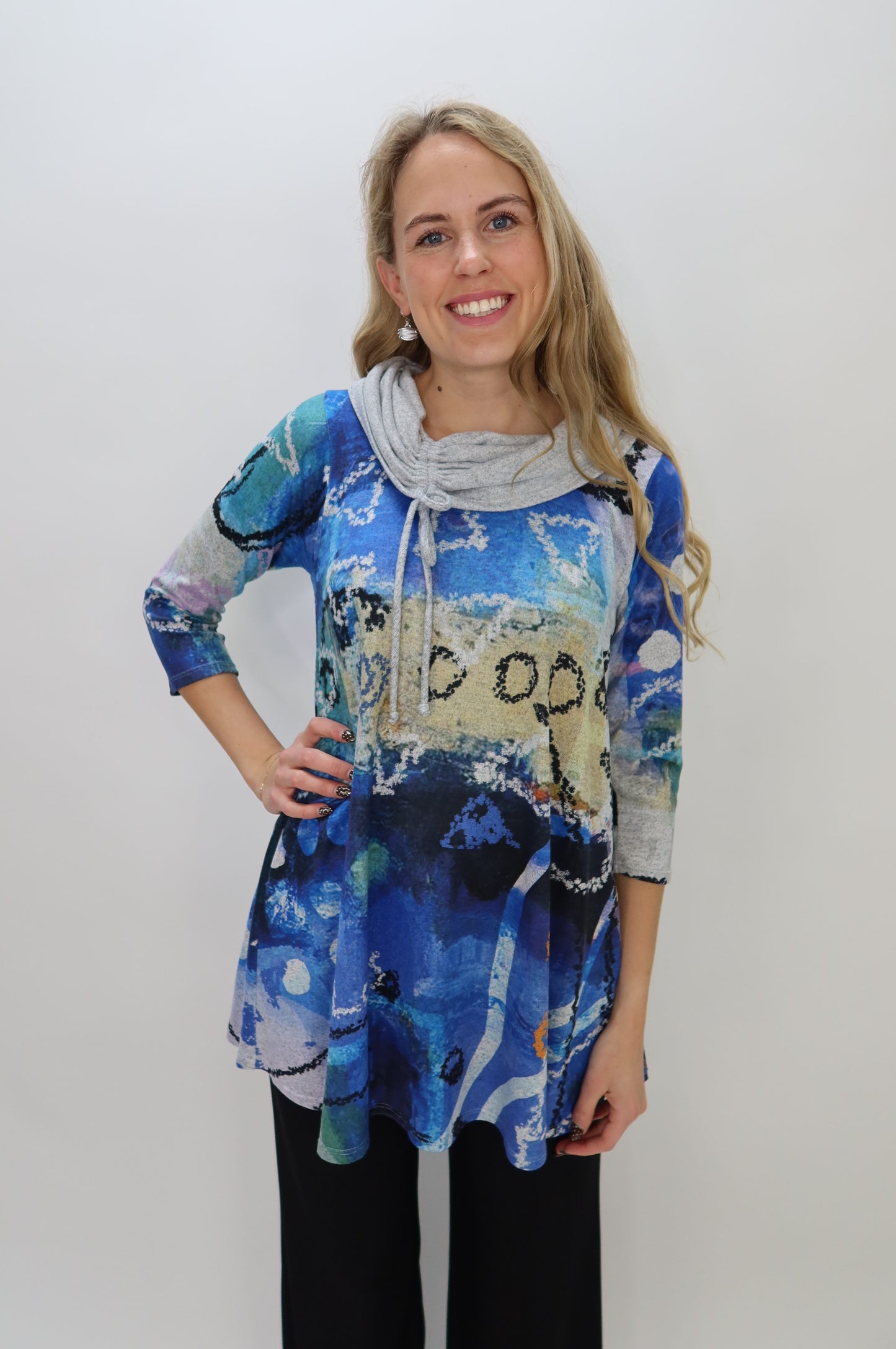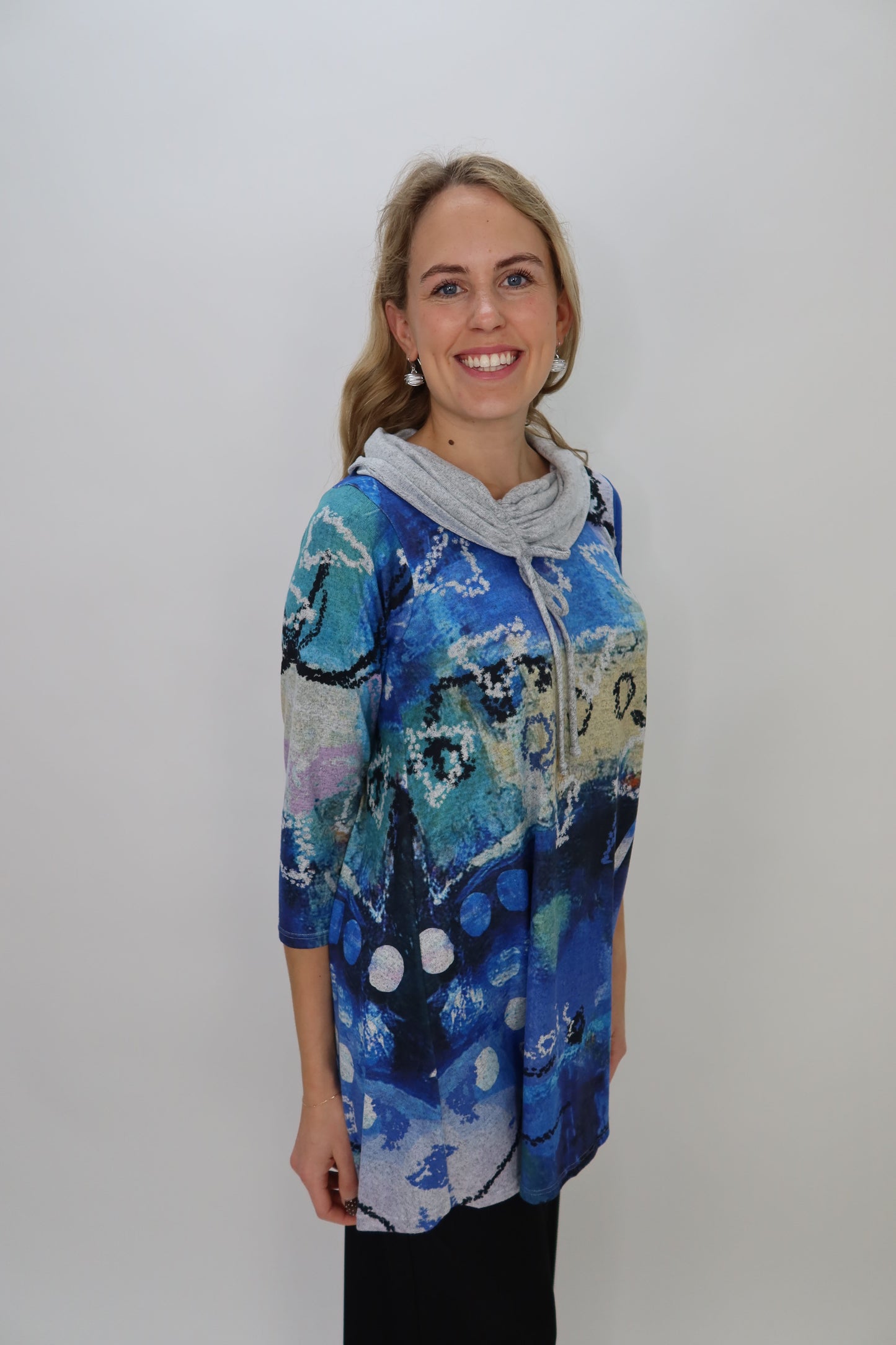 Blue Pattern Nancy Tunic Cowl Neck with Draw String
