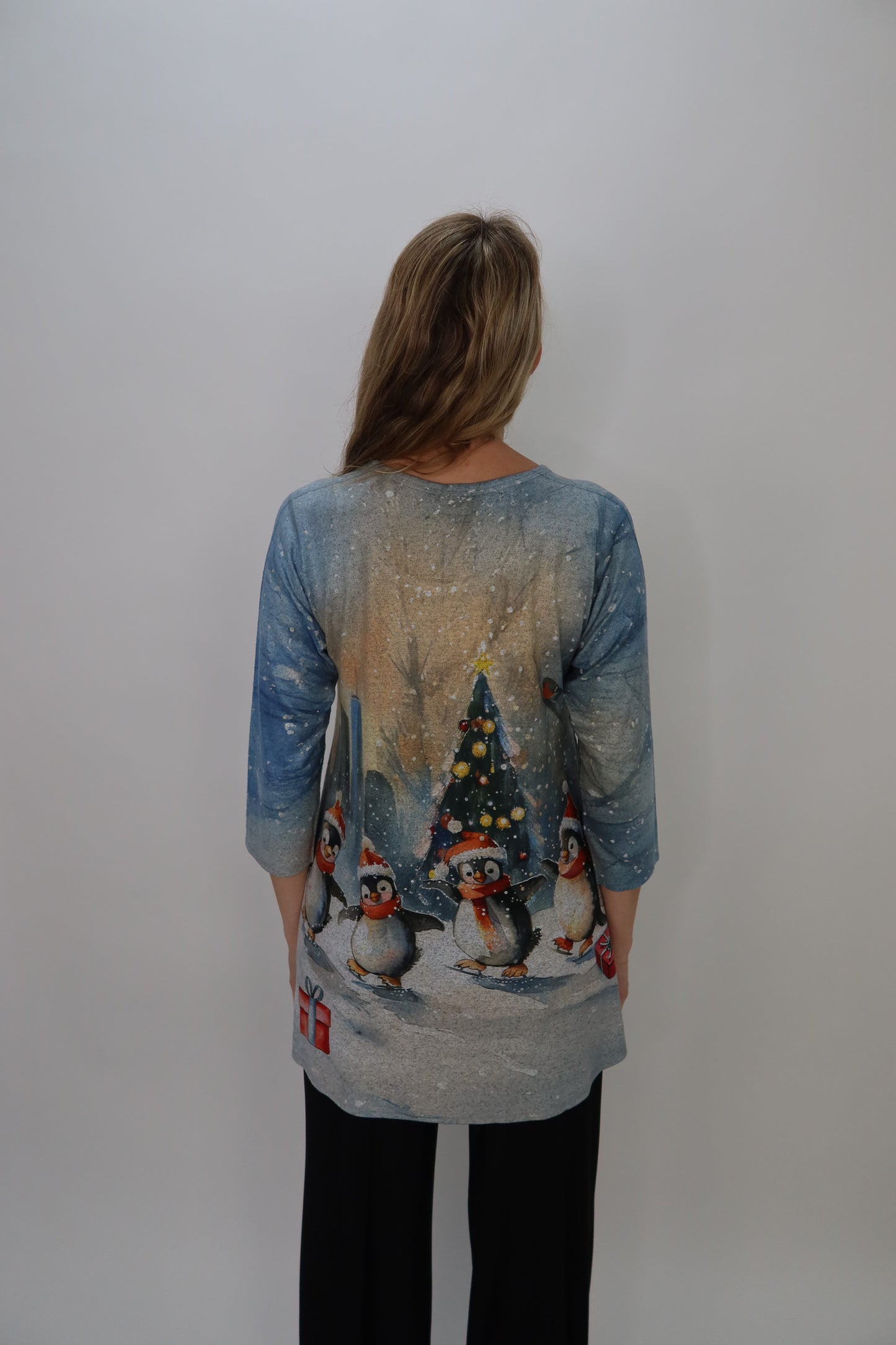 Celebrate the season in style with this adorable Holiday Penguin Hacci Aline Top. Featuring a charming penguin design adorned with a festive Christmas tree, this cozy piece brings playful holiday spirit to your wardrobe. The flattering A-line swing silhouette skims your figure beautifully, while the scoop neckline and 3/4 sleeves offer comfortable, versatile styling perfect for holiday gatherings, casual outings, or festive family photos. Soft hacci fabric feels as good as it looks, making this the go-to top you'll reach for all season long.