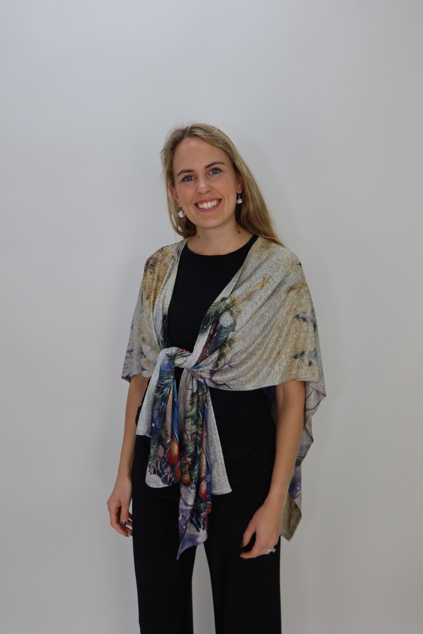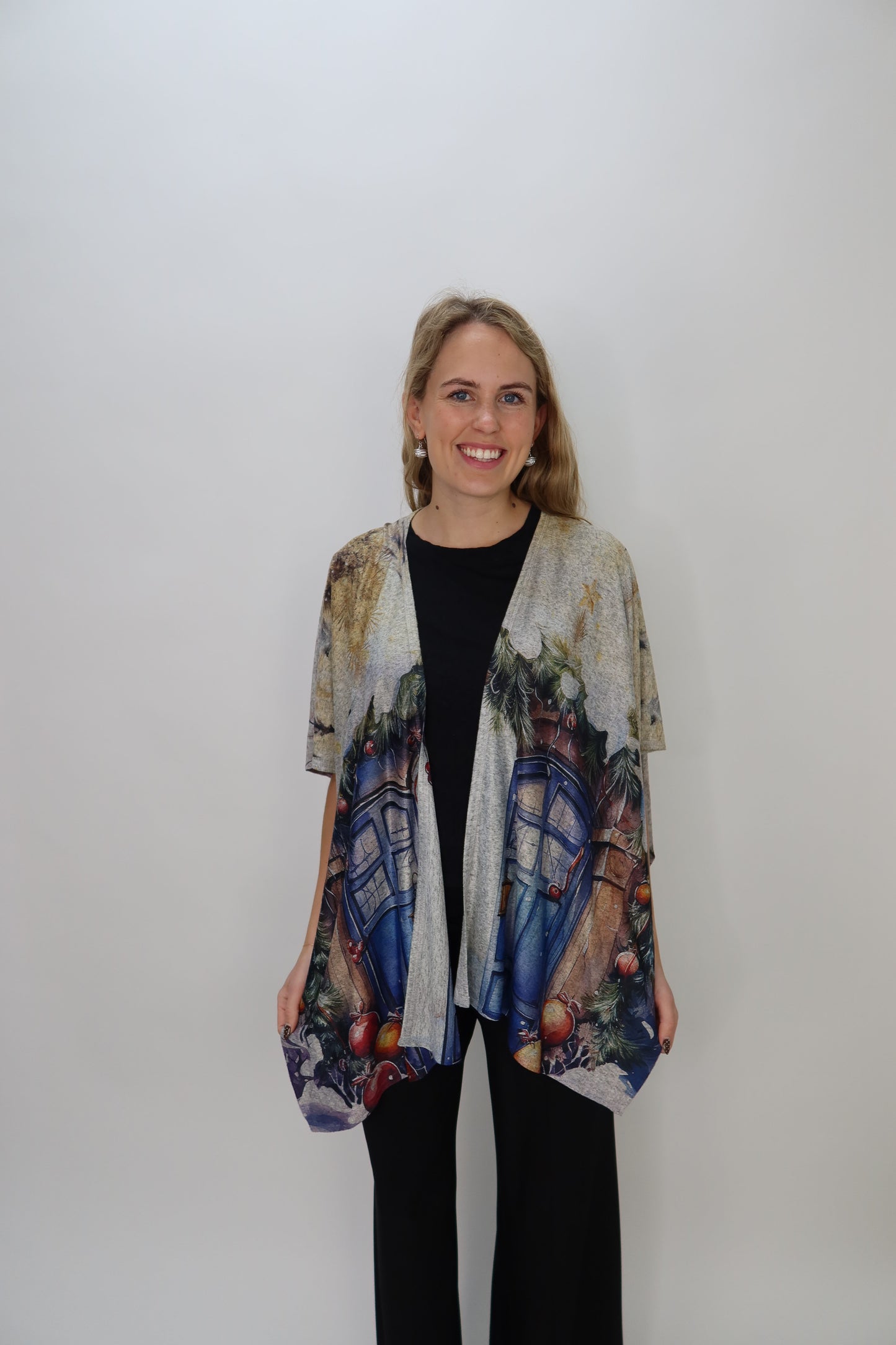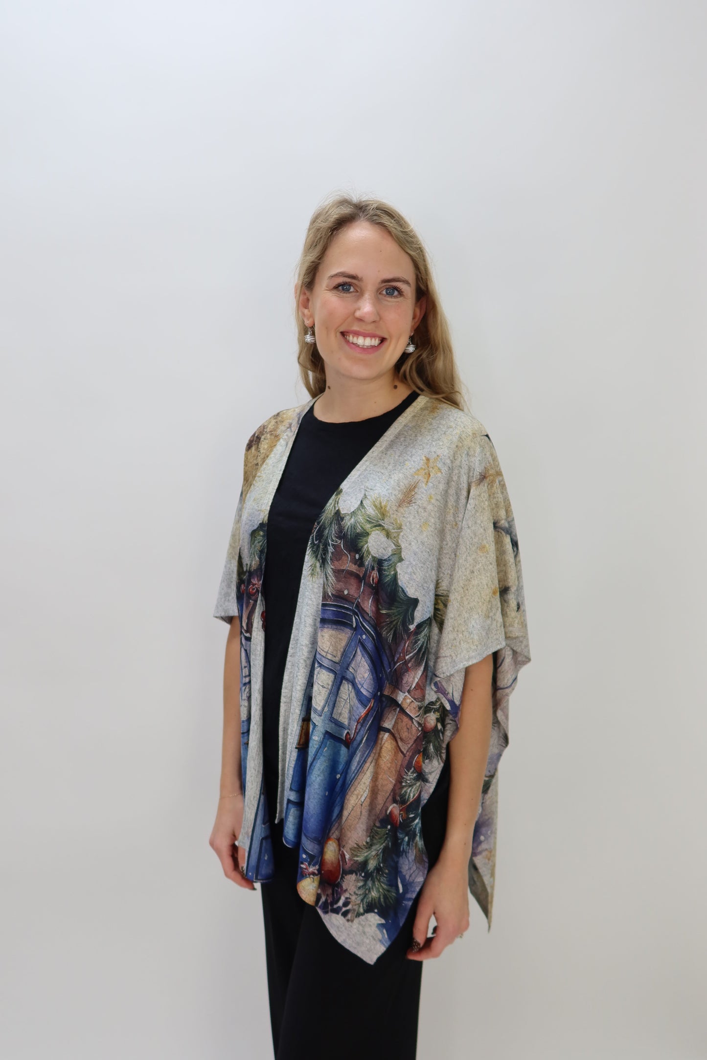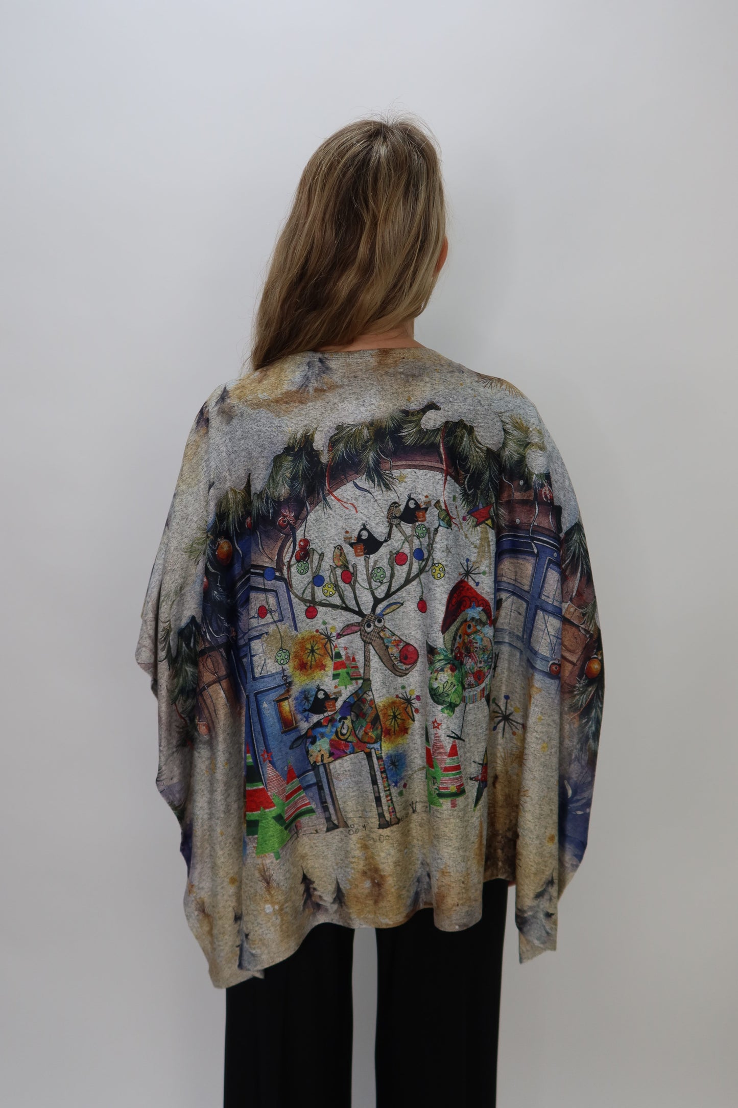 Embrace festive charm with our Holiday Reindeer Poncho Cardigan. This versatile open wrap can be styled around your shoulders, cinched at the waist, or worn as a cozy scarf. Featuring a cheerful holiday design with reindeer and Christmas trees, it’s an effortless way to add seasonal spirit to any outfit. Lightweight and easy to throw on, it’s perfect for staying warm and stylish throughout your holiday celebrations.