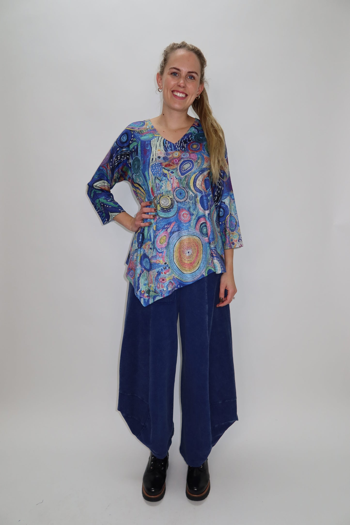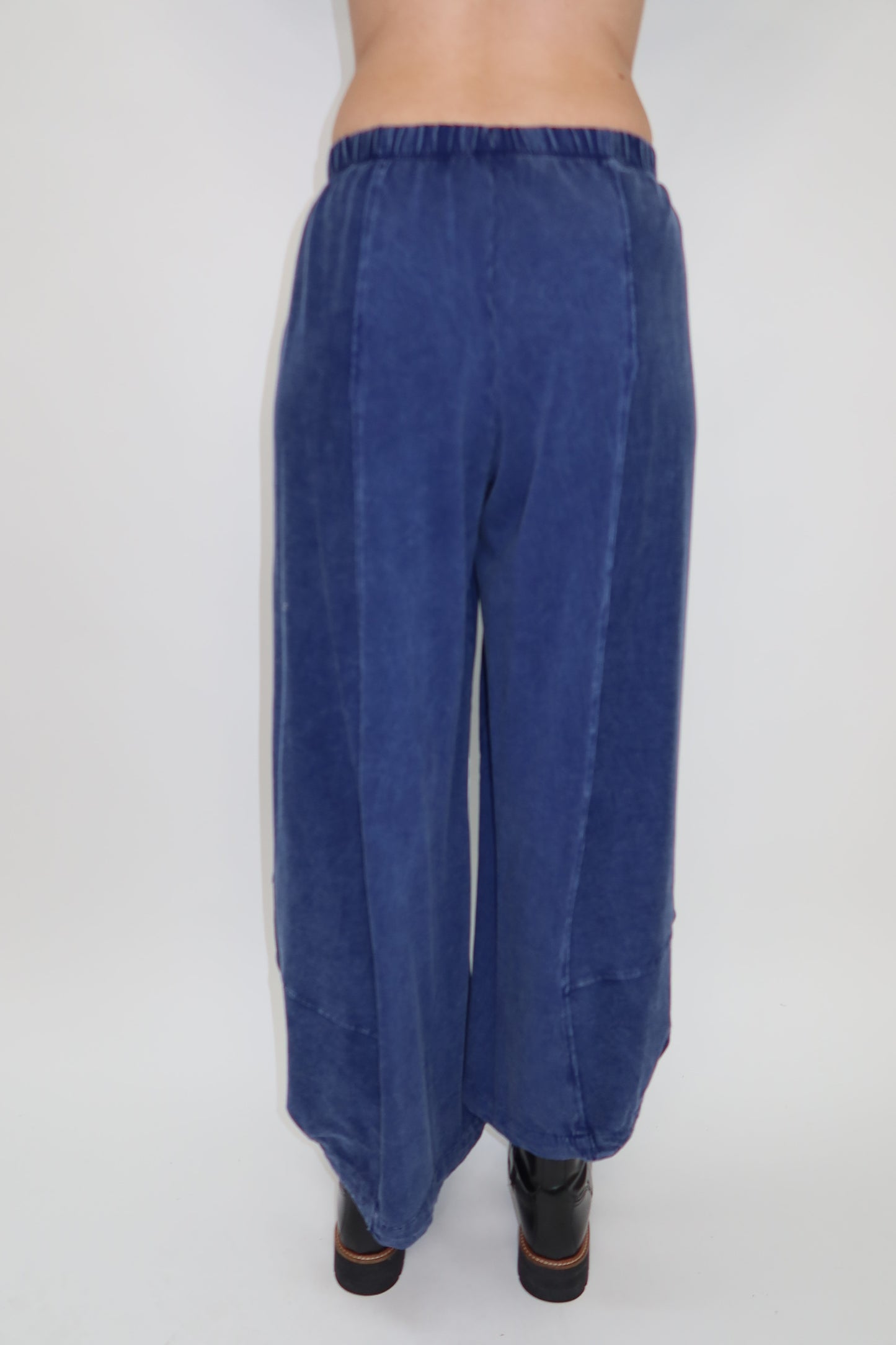 These Denim blue mineral washed flare full-length pants blend comfort and style effortlessly. Made from soft cotton, they feature a convenient front pocket and an elastic waistband for a perfect, flexible fit. Ideal for everyday wear, they combine a flattering silhouette with easy movement, making them a versatile addition to your wardrobe.