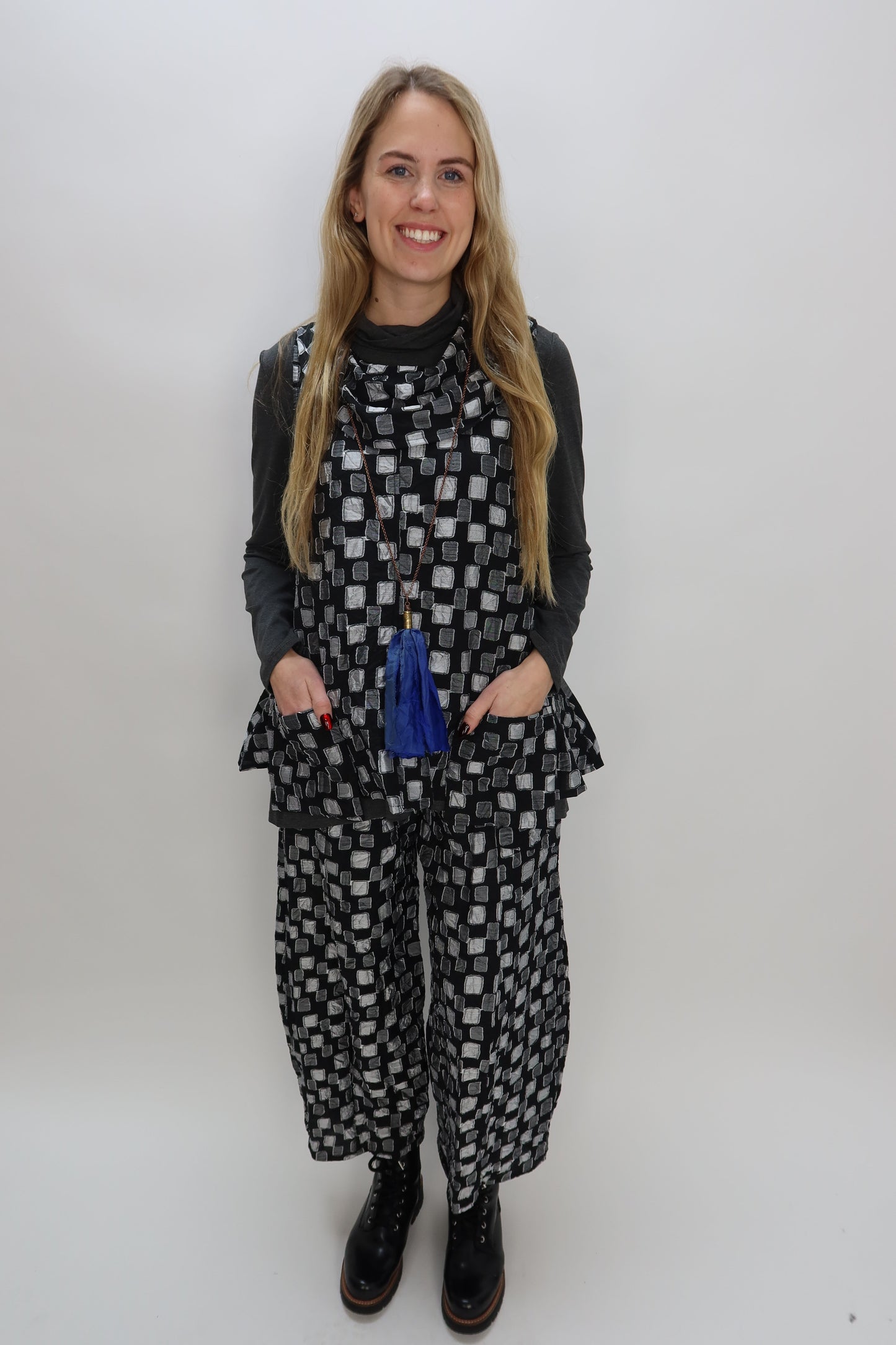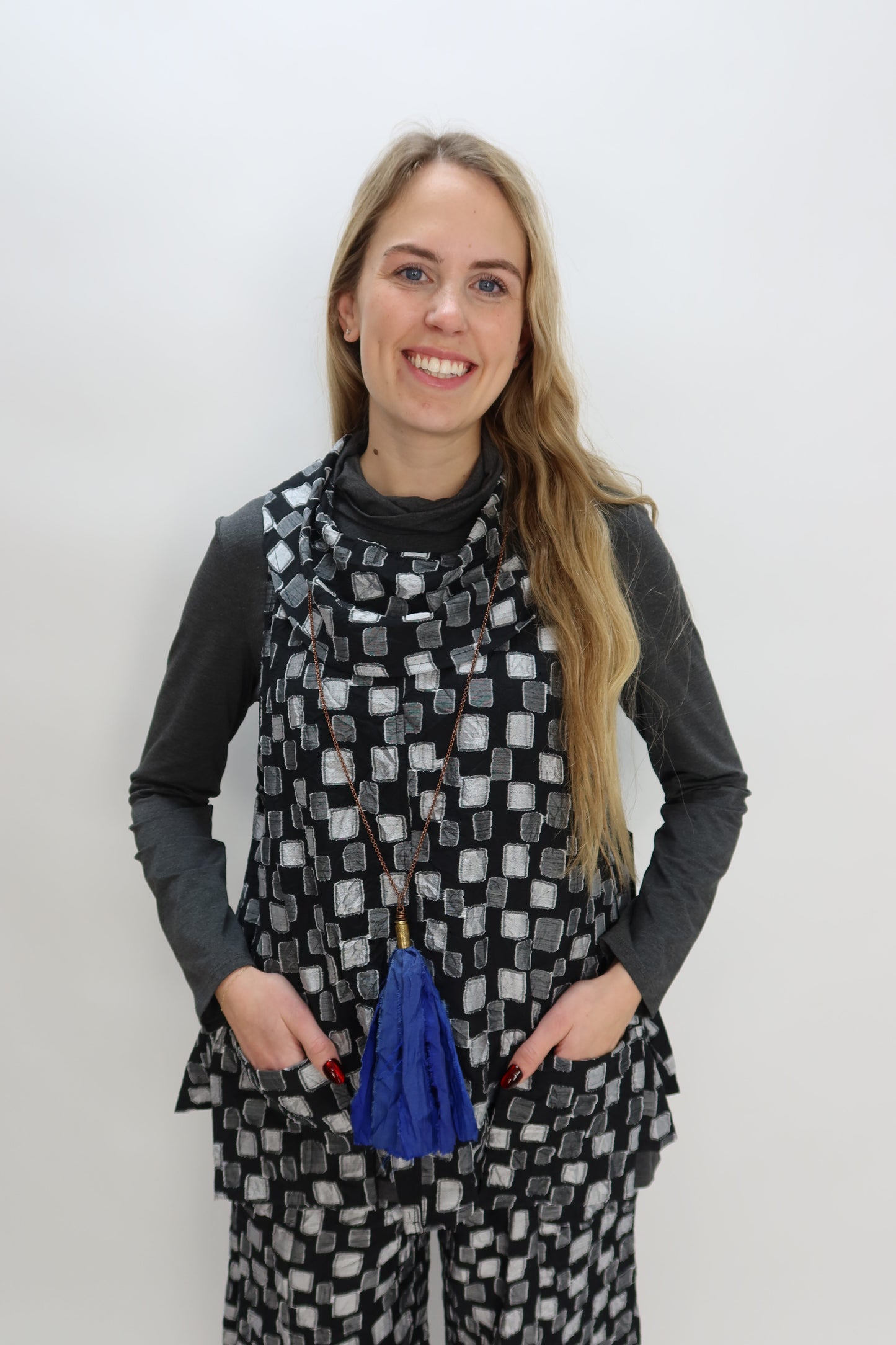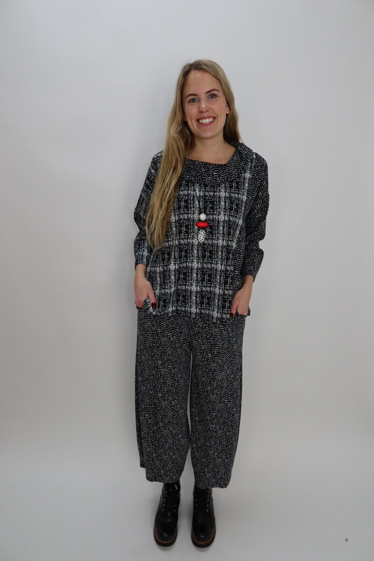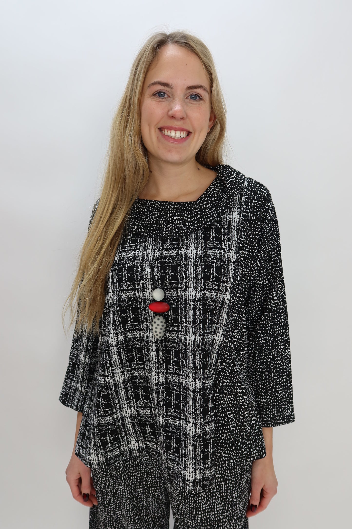 Black and White Dots and Plaid Knit Jacquard Cowl Neck Tunic