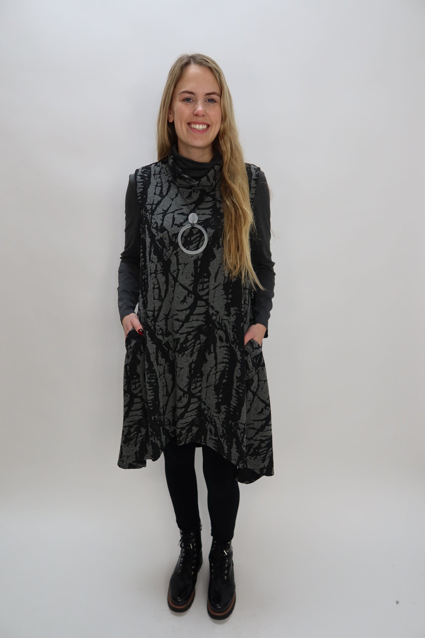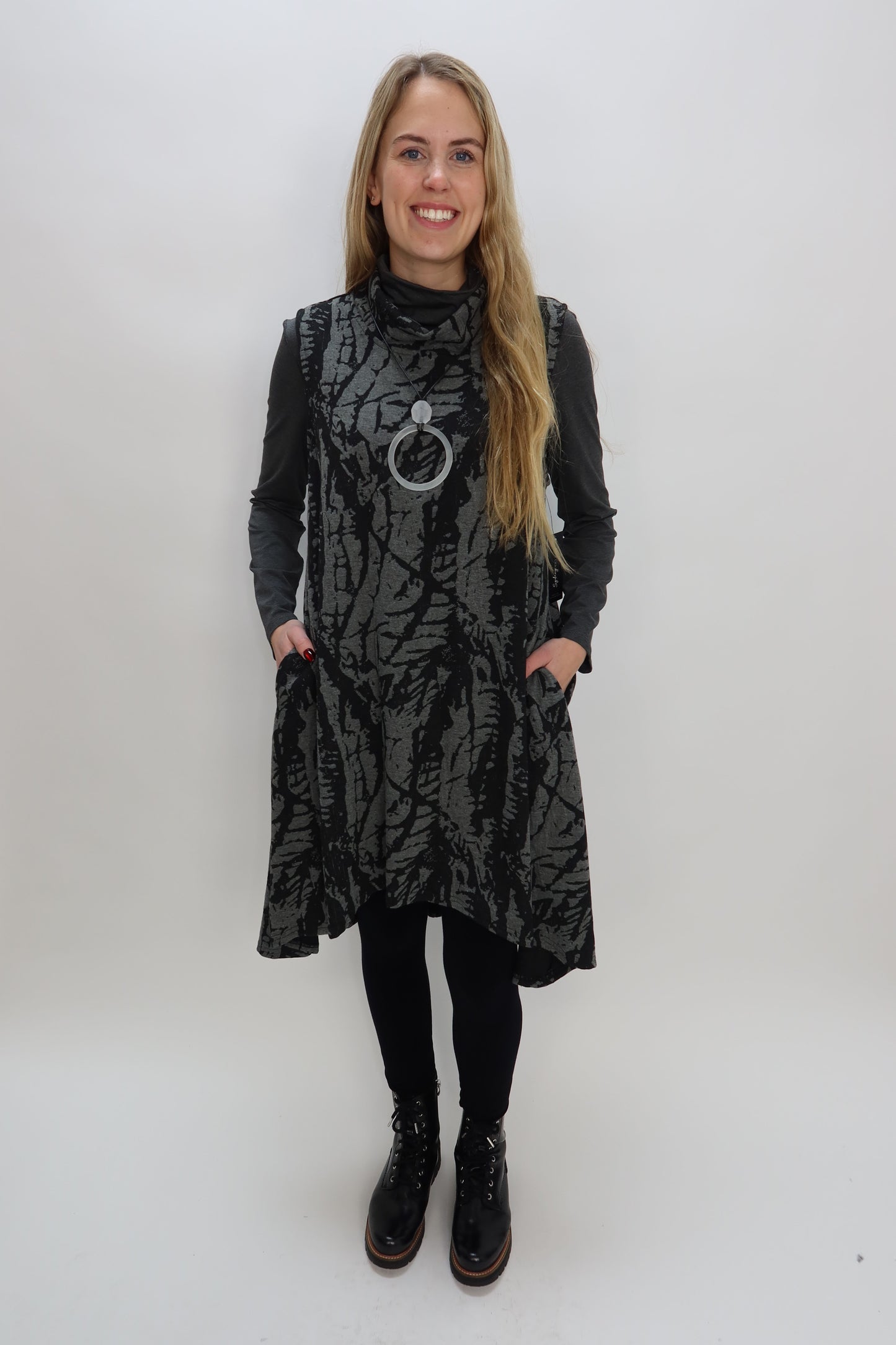 Gray and Black Forest Knit Jacquard Hi Low Sleeveless Tunic Dress