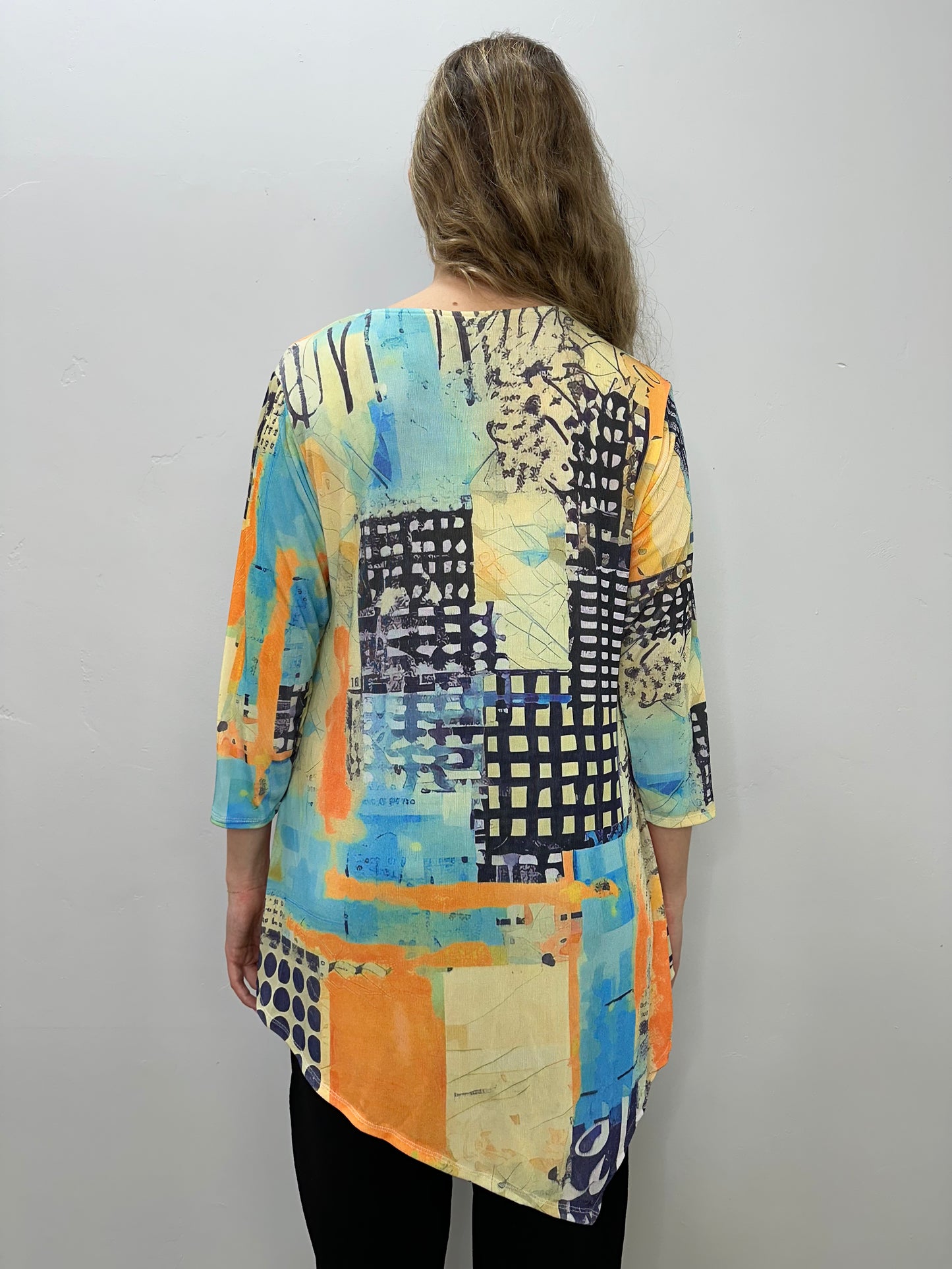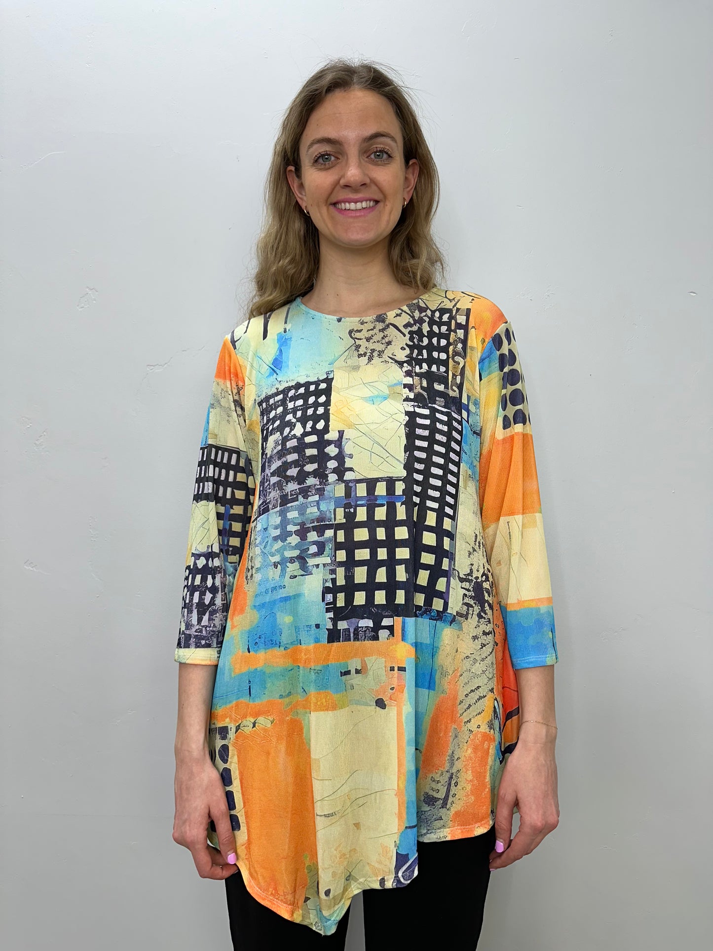 Regular price $55.30Elevate your wardrobe with our stunning Orange and Yellow Pattern Tunic! Featuring a flattering scoop neck and 3/4 sleeves, this tunic boasts a beautiful orange and yellow pattern with black and blue accents. The asymmetric hemline adds a touch of uniqueness, making it a standout piece. Comfortable and perfect with black pants or leggings, it's a must-have for any fashion-forward individual.