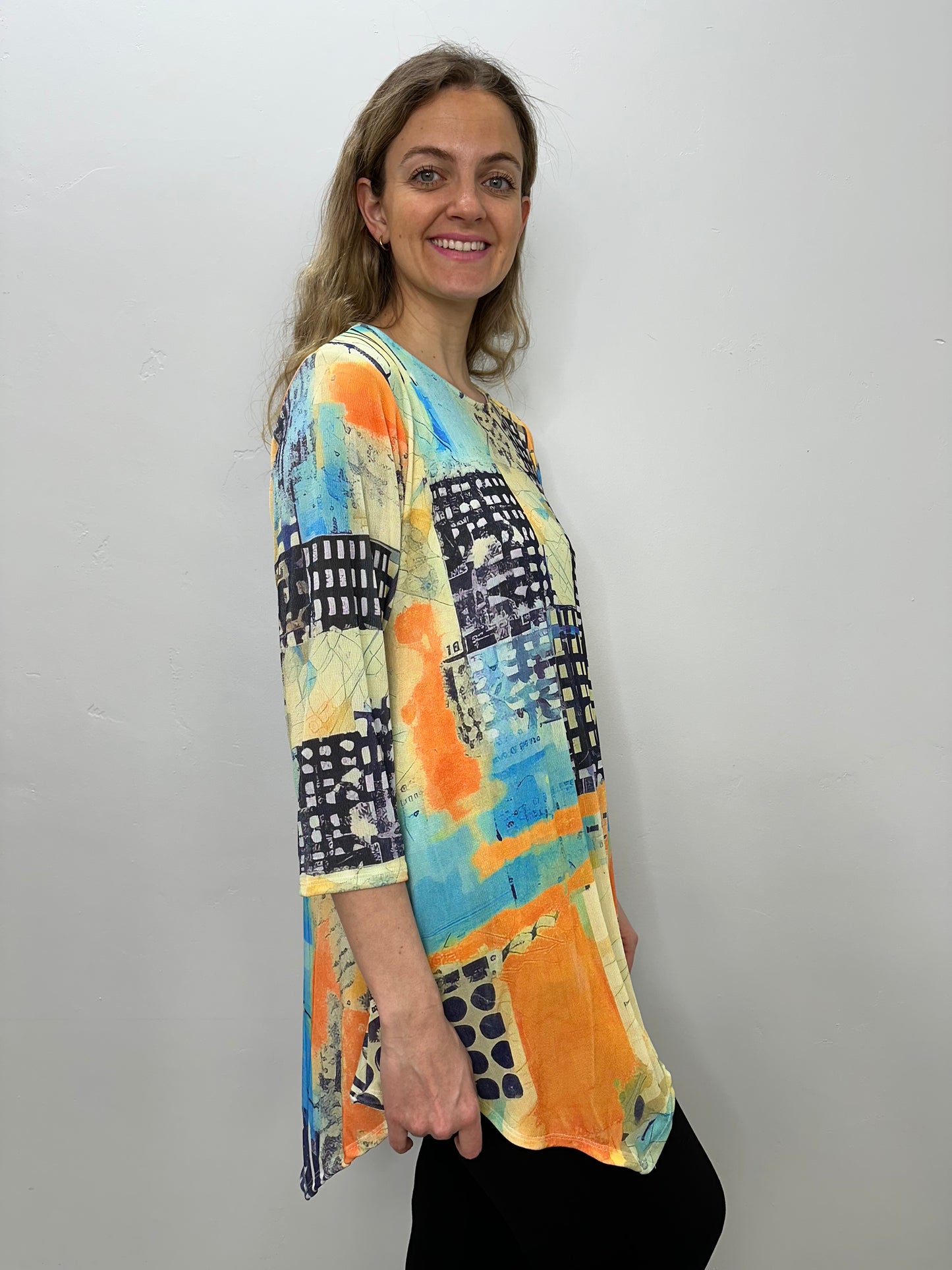 Orange and Yellow Pattern 3/4 Sleeve Crew Neck Slinky Tunic
