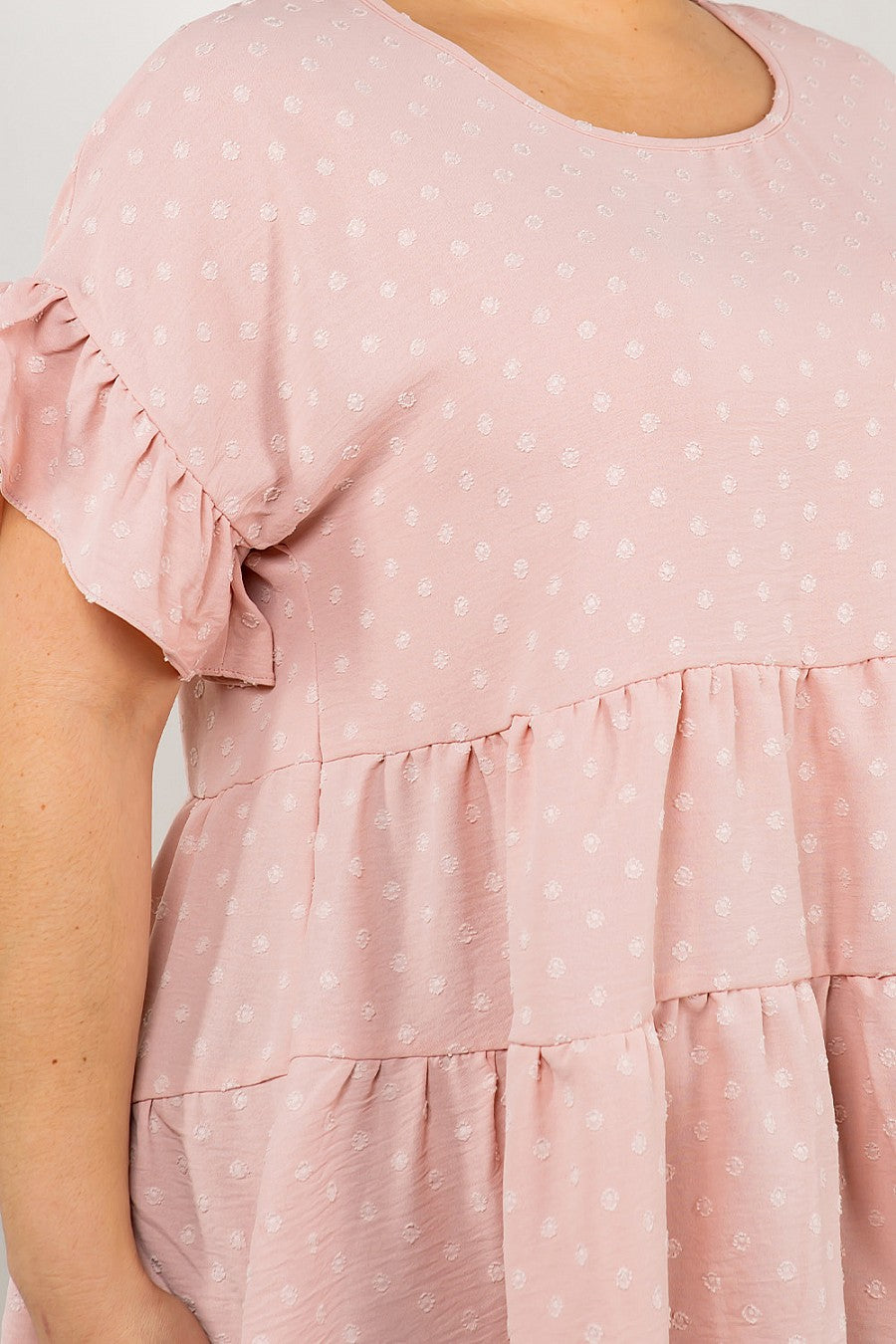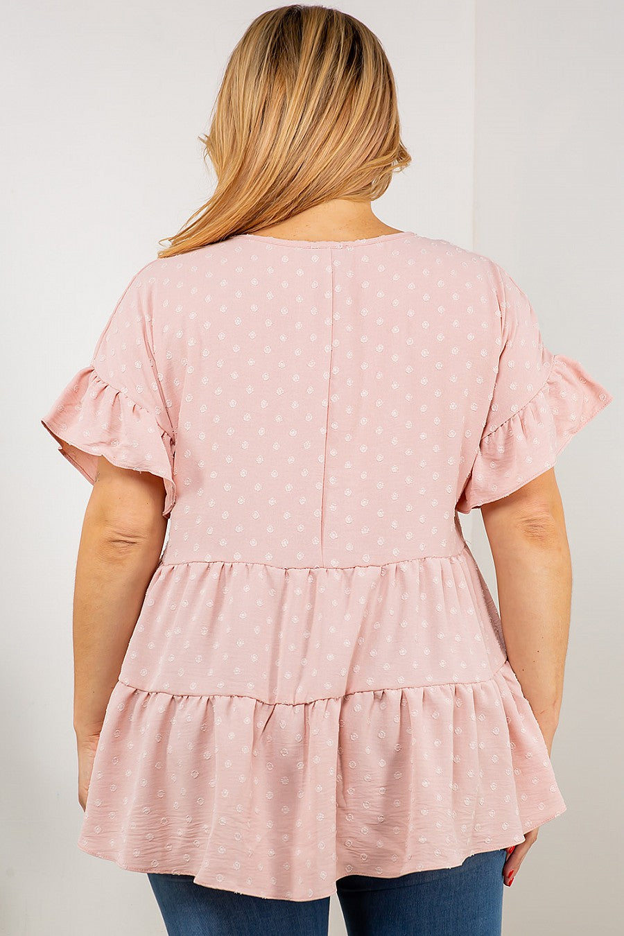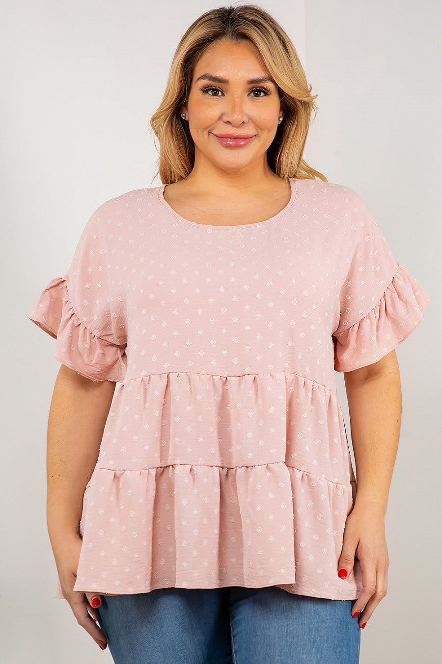 Regular price $55.20This Baby Pink Multi Tier Short Sleeve Top features dot ruffle sleeves and a multi-tiered design, making it a playful and eye-catching addition to any wardrobe. Perfect for adding a touch of fun and flair to any outfit, this top is sure to make a statement and turn heads.