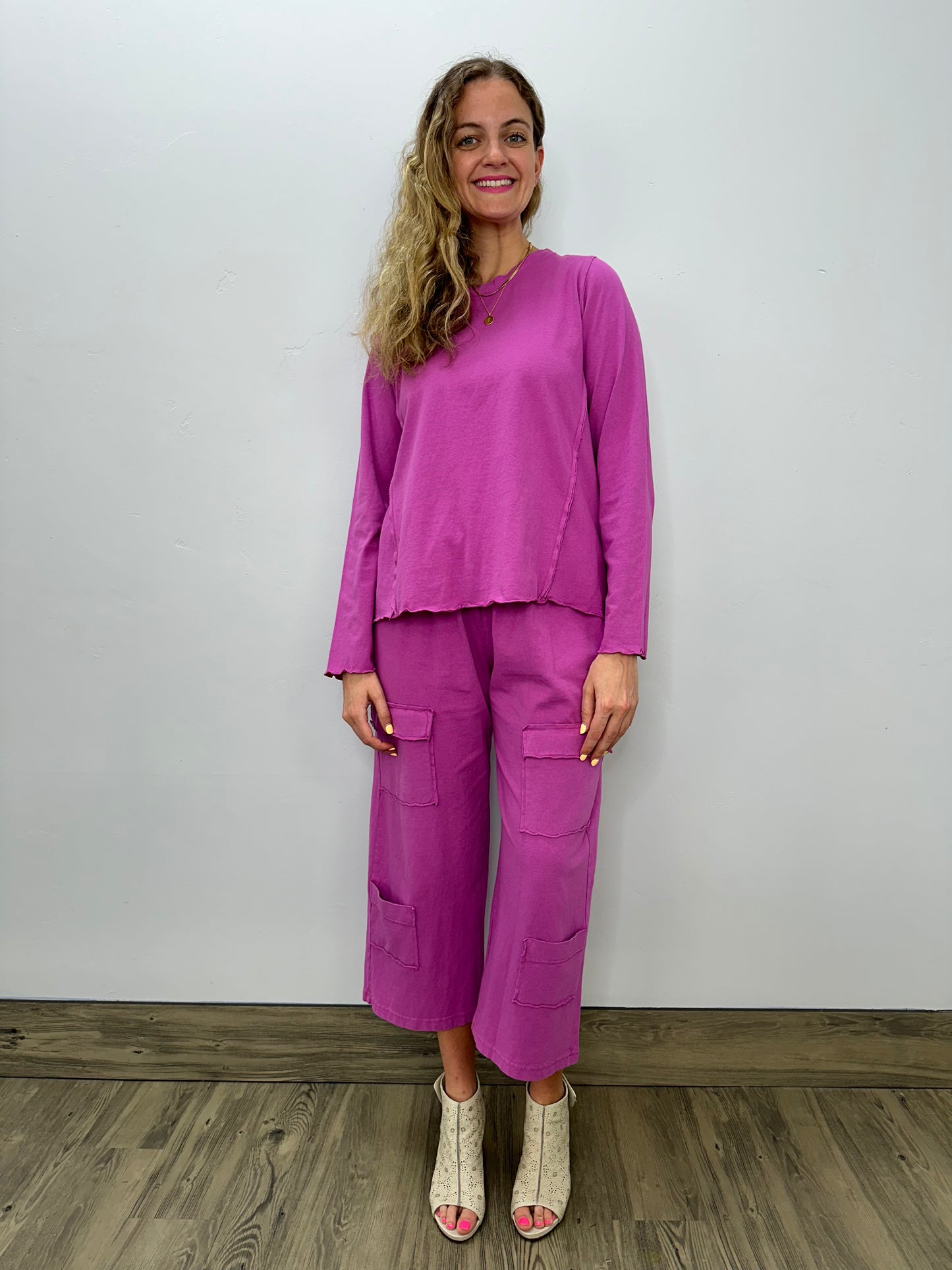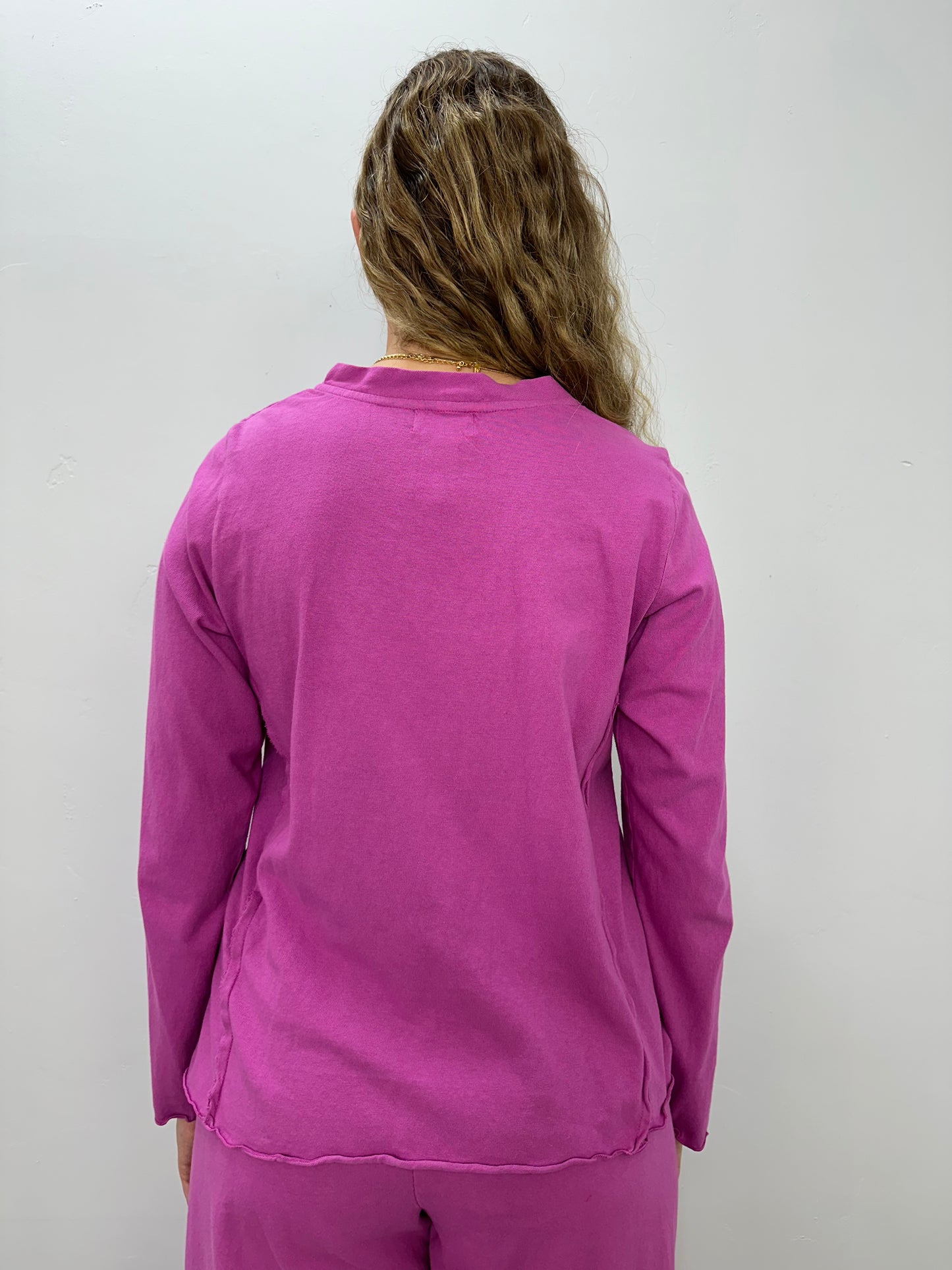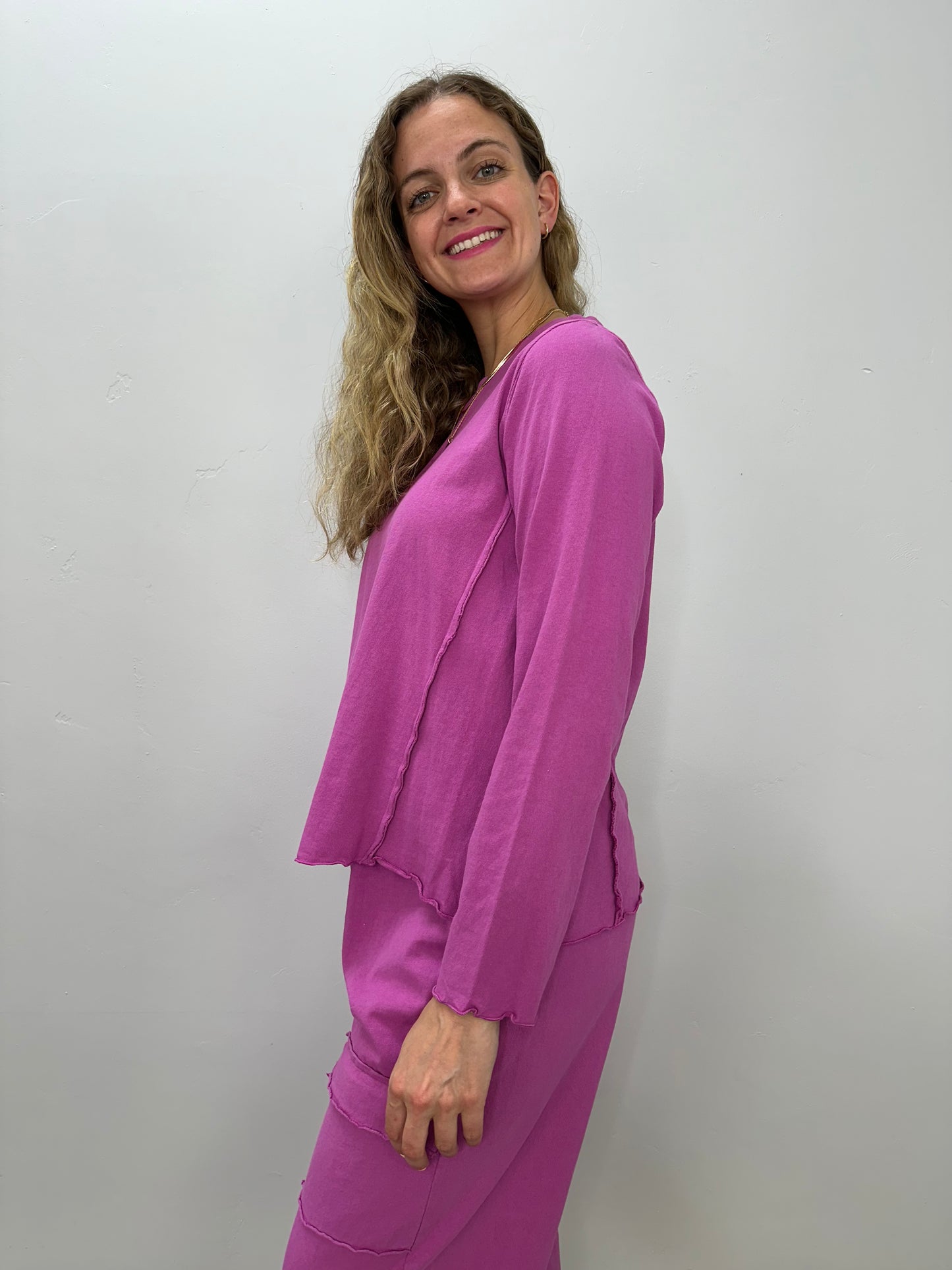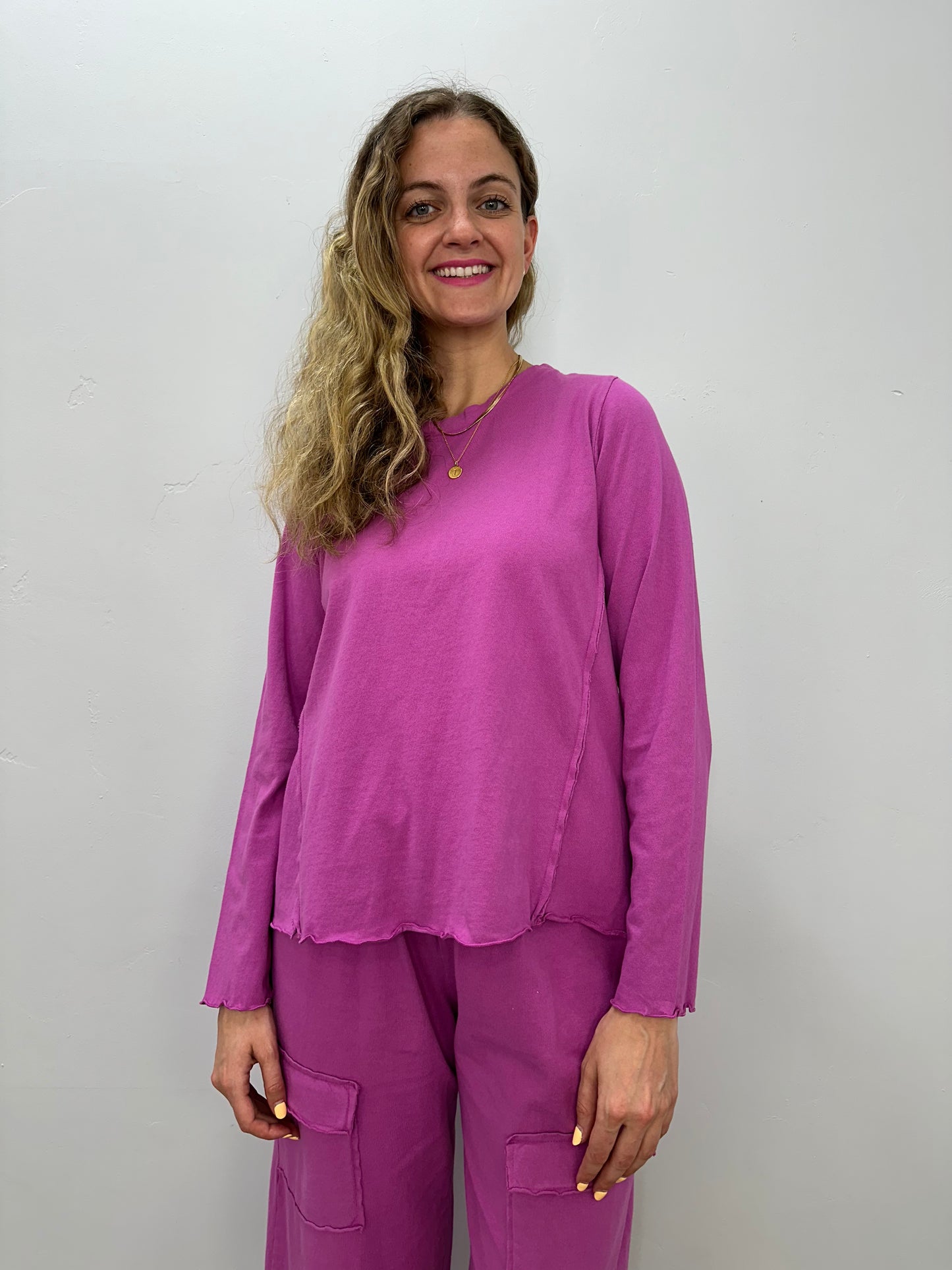 Regular price $83.30The Berry Pink Long Sleeve Cotton Top is a must-have piece for any fashion-forward wardrobe. Made from all-cotton material, this top provides ultimate comfort and breathability. The round neck and raw edging add a unique touch. Elevate any outfit with this trendy and versatile top!