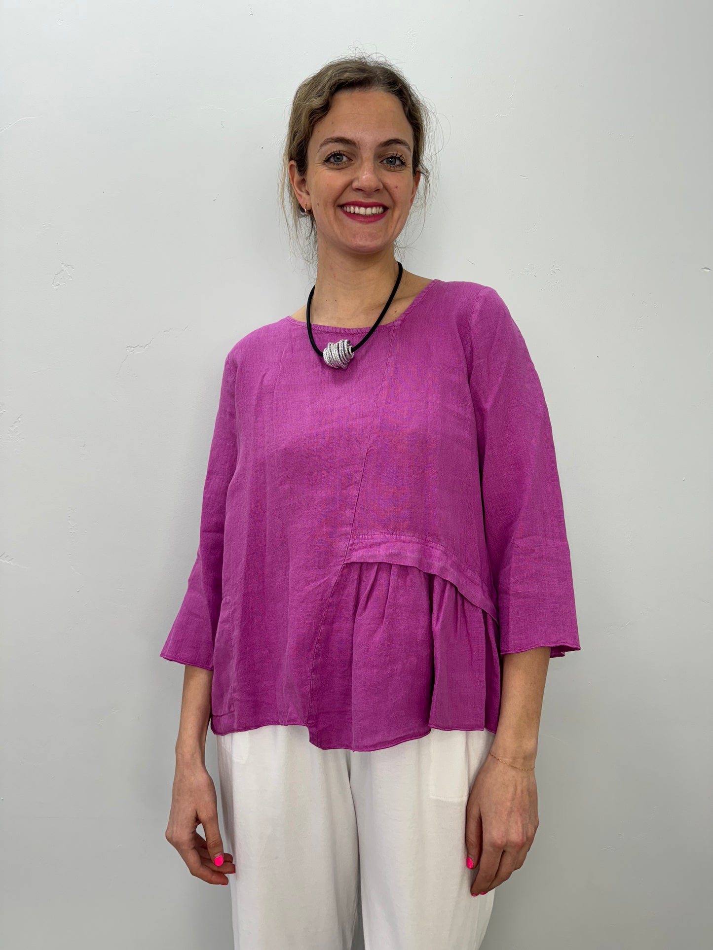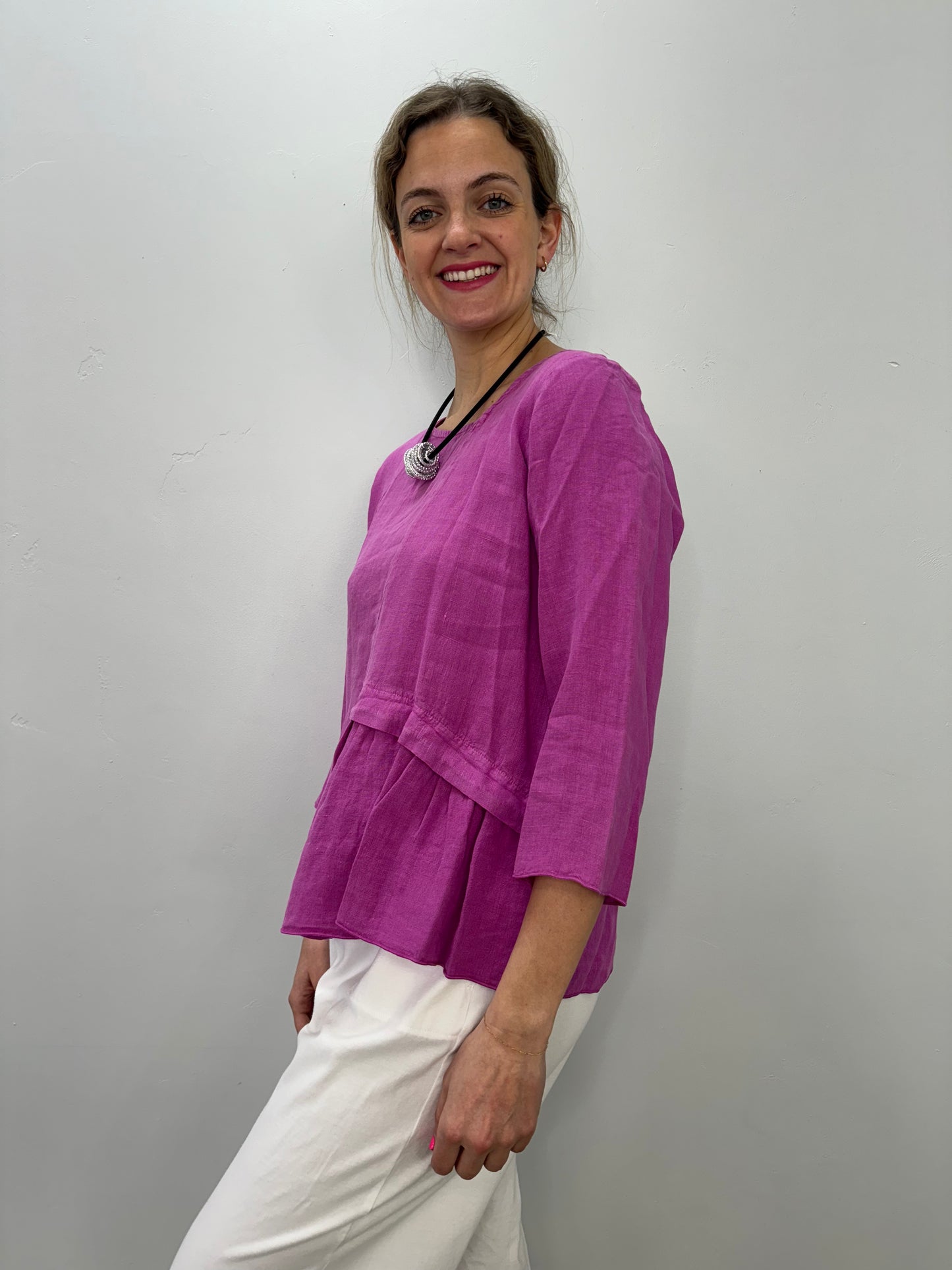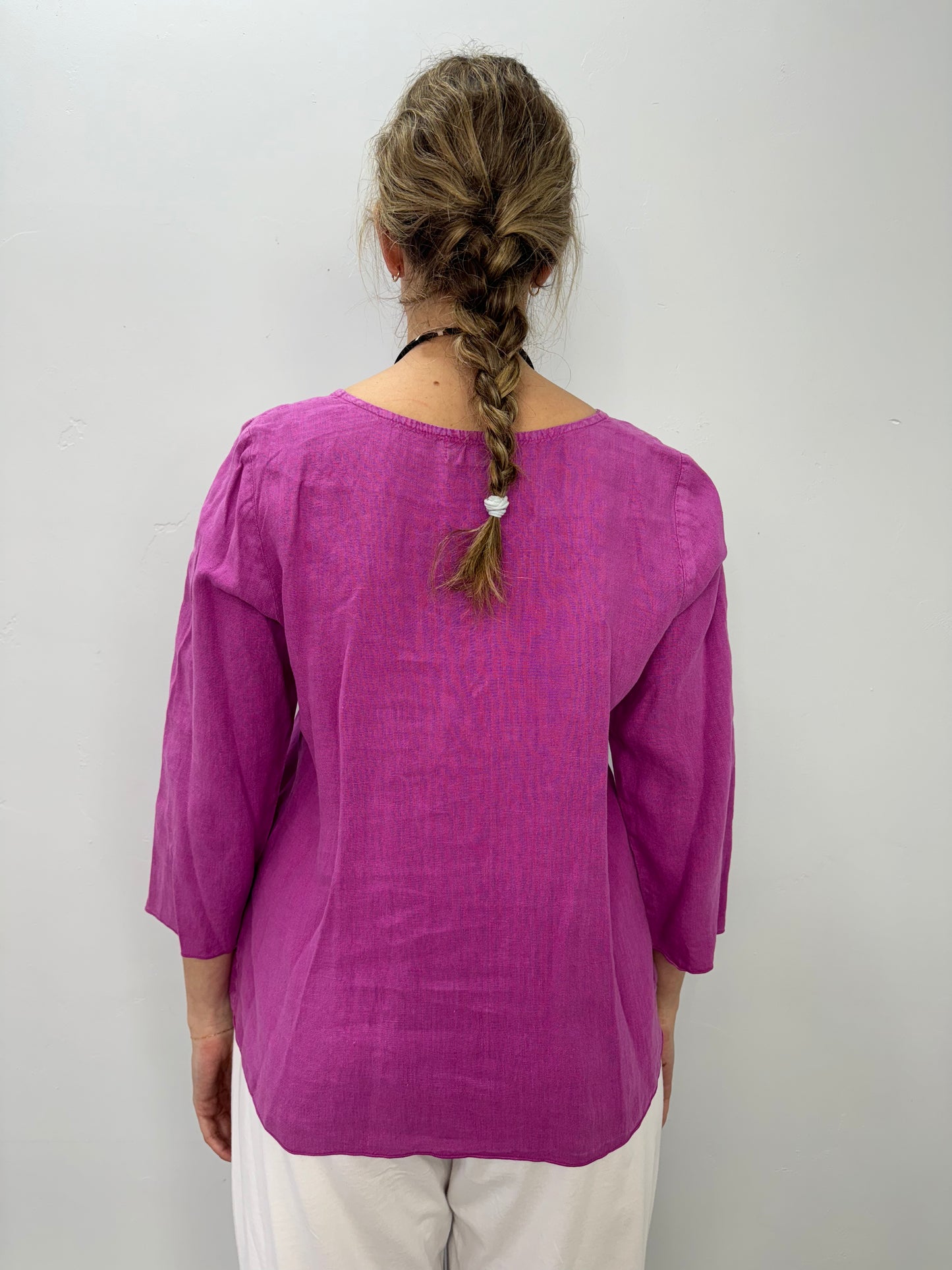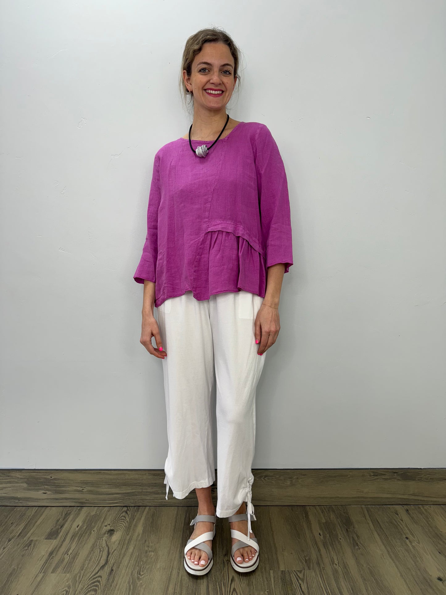 Introducing our Berry 3/4 Sleeve Linen Top, made with the finest linen in a stunning berry color. The slight ruching on one side adds a touch of elegance. Perfectly pairs with white pants for a timeless and chic look. Upgrade your wardrobe with this must-have top!