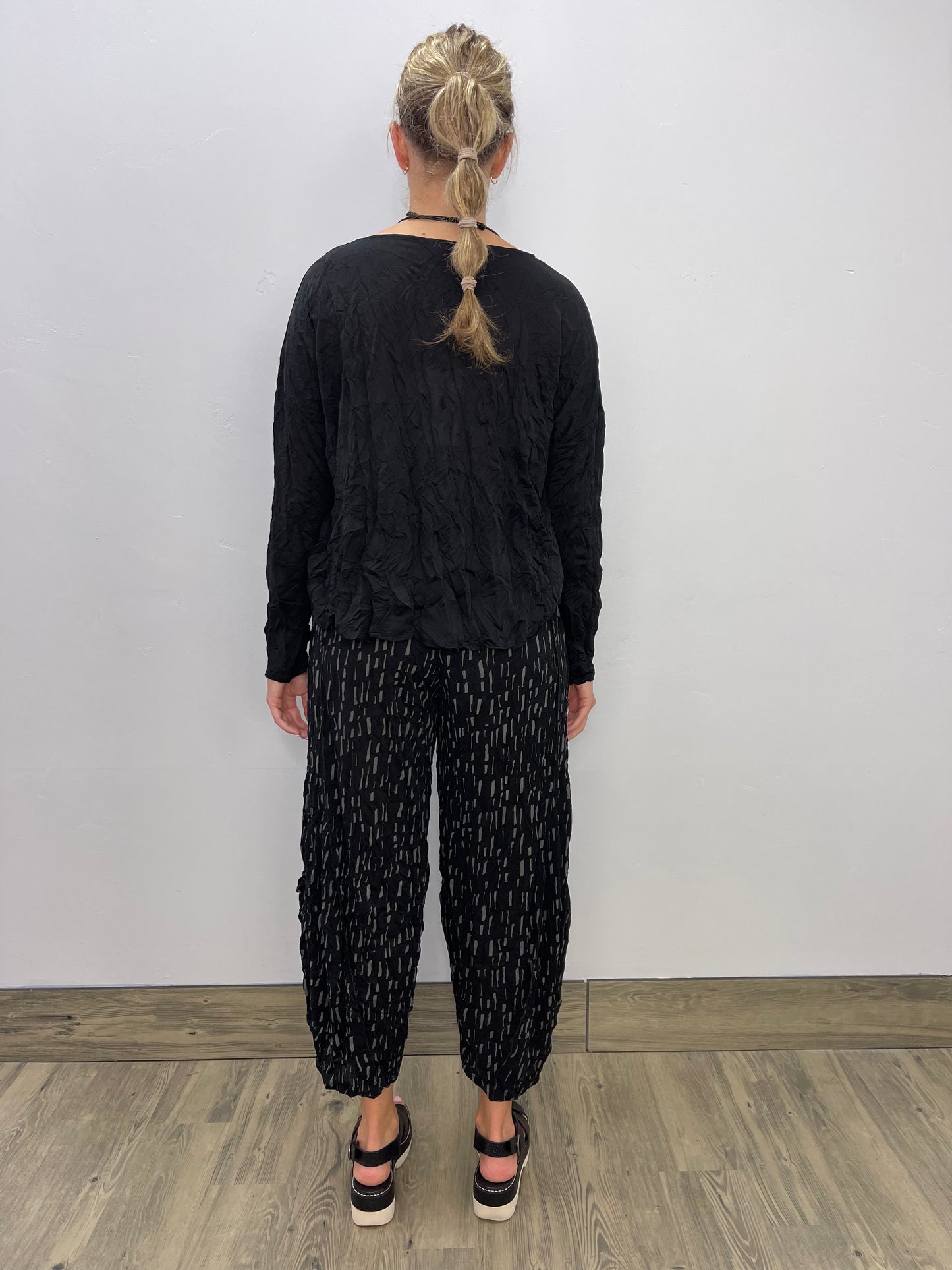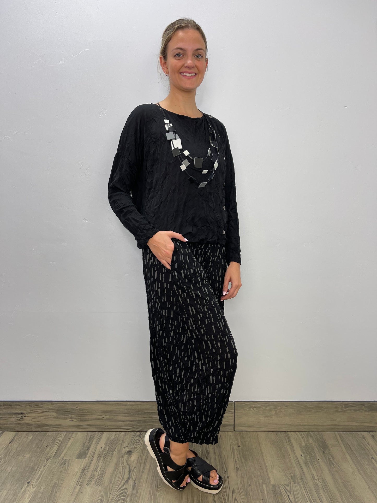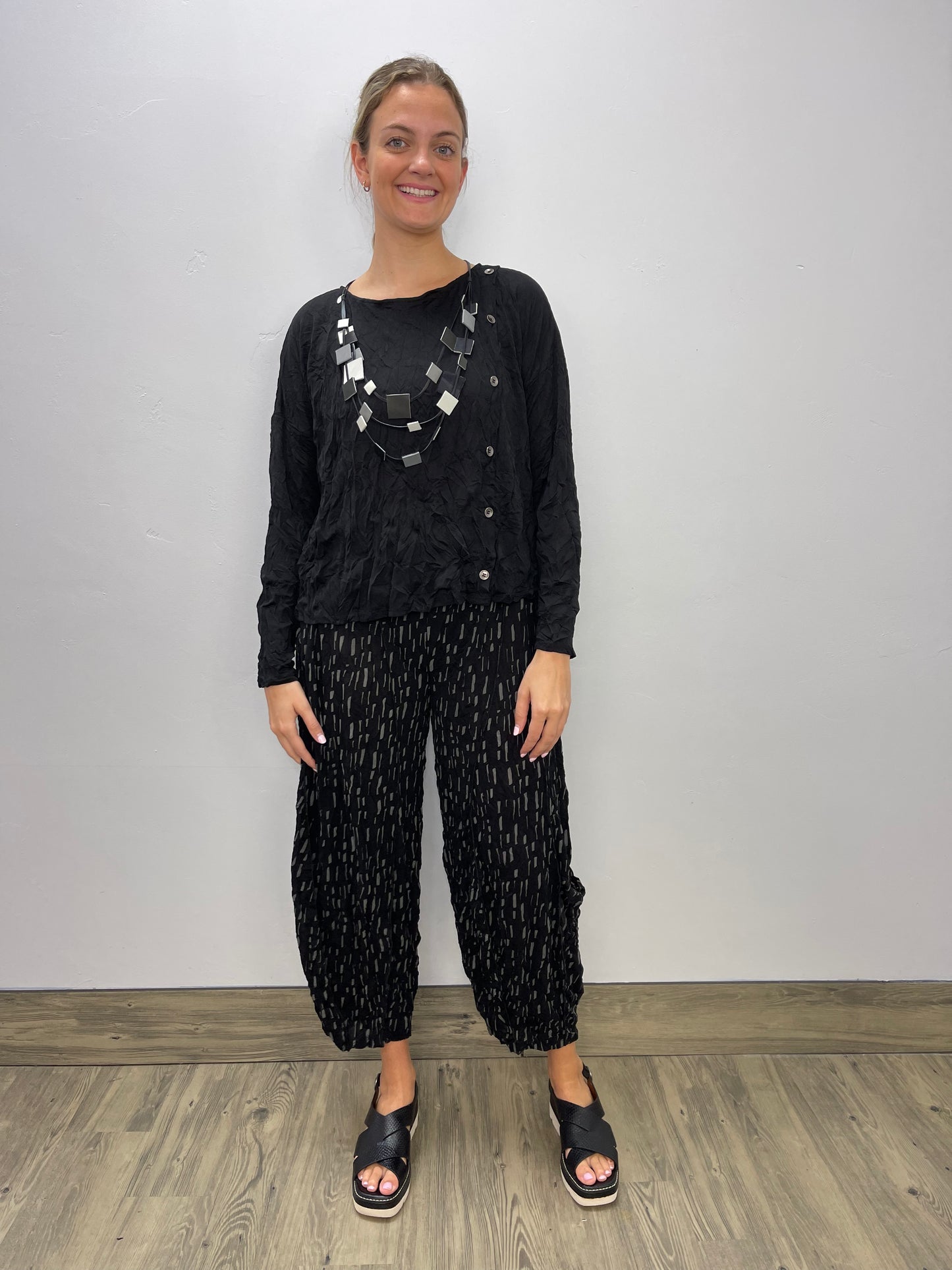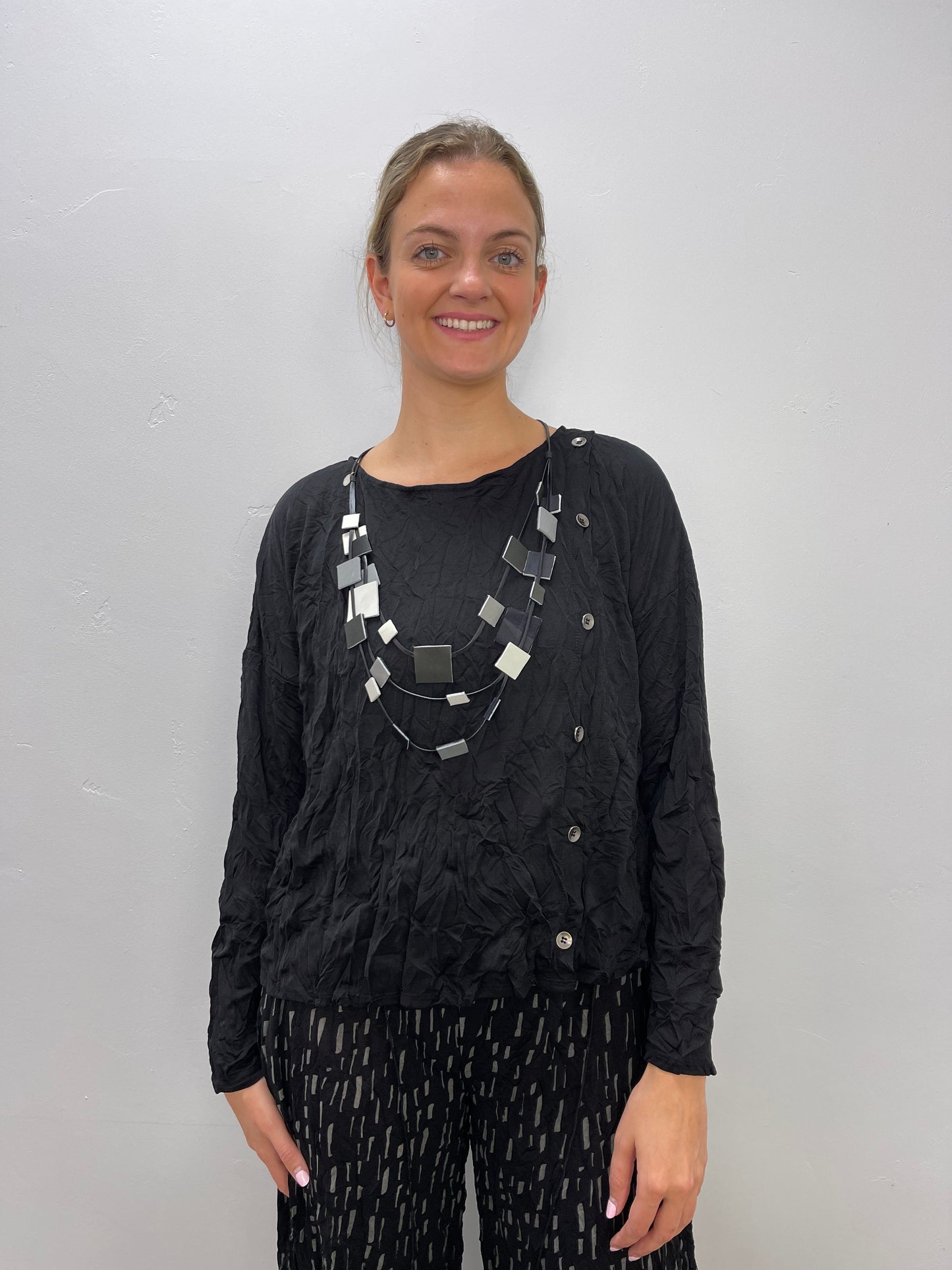 Lightweight with a suitcase ready crinkled mesh fabric, the Allie Top adds simple sophistication to to your wardrobe. It has a boxy silhouette with a round neckline, long sleeves and a mod grid pattern. A row of decorative buttons accents the left side from shoulder to hemline. Layer it over Chalet's Layering Tank to lengthen the look.