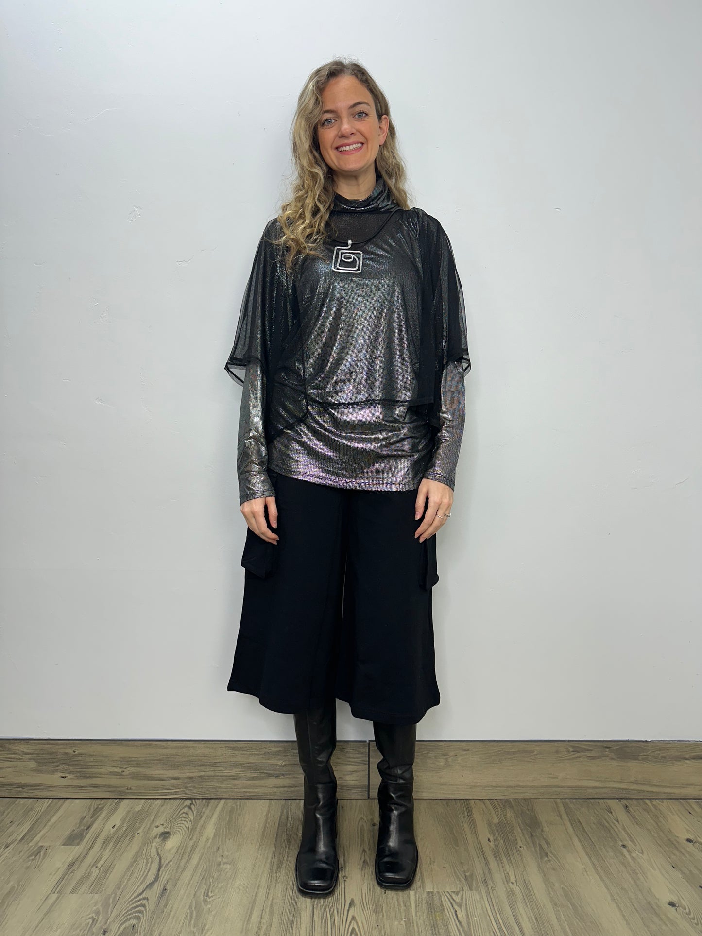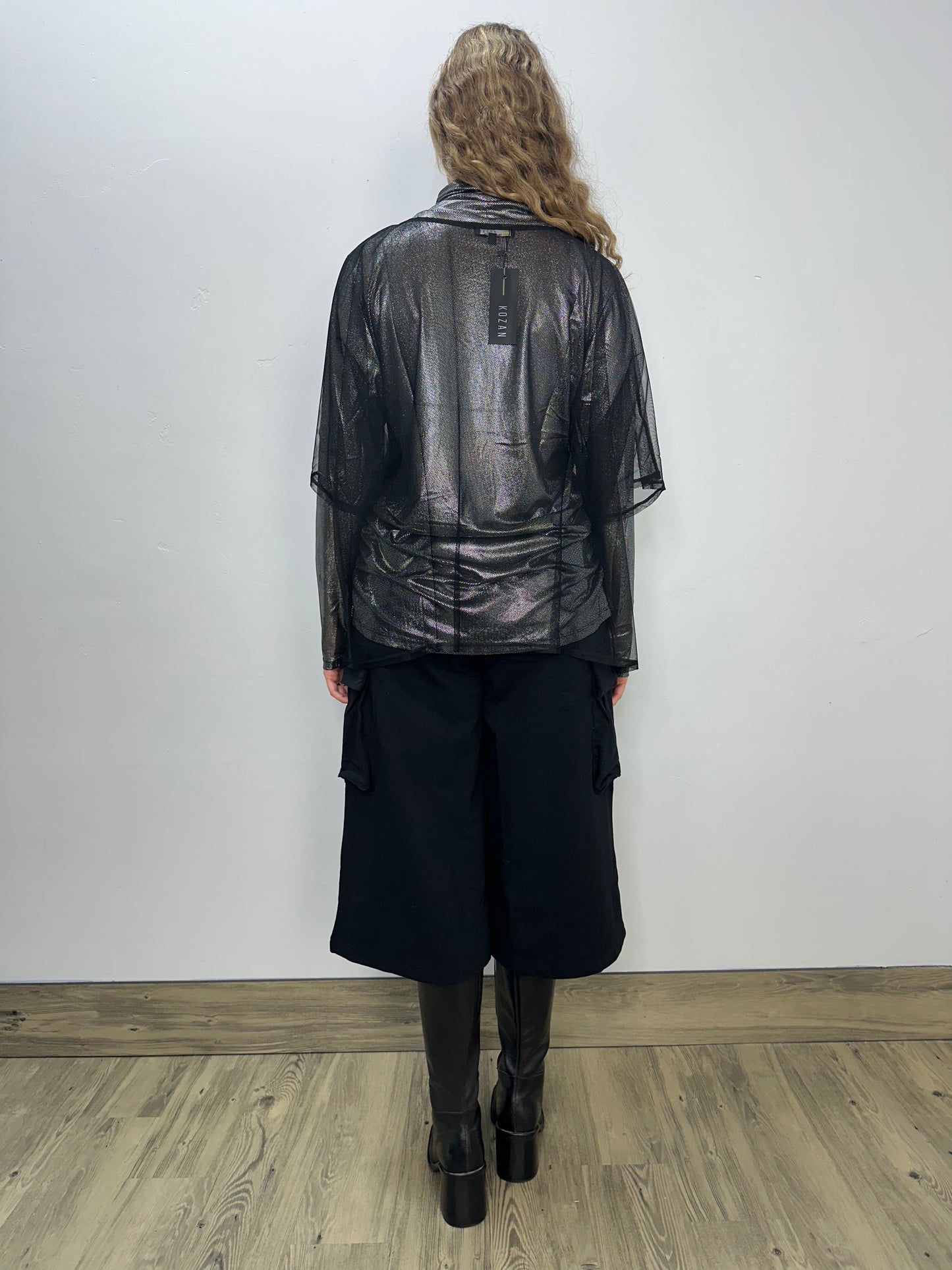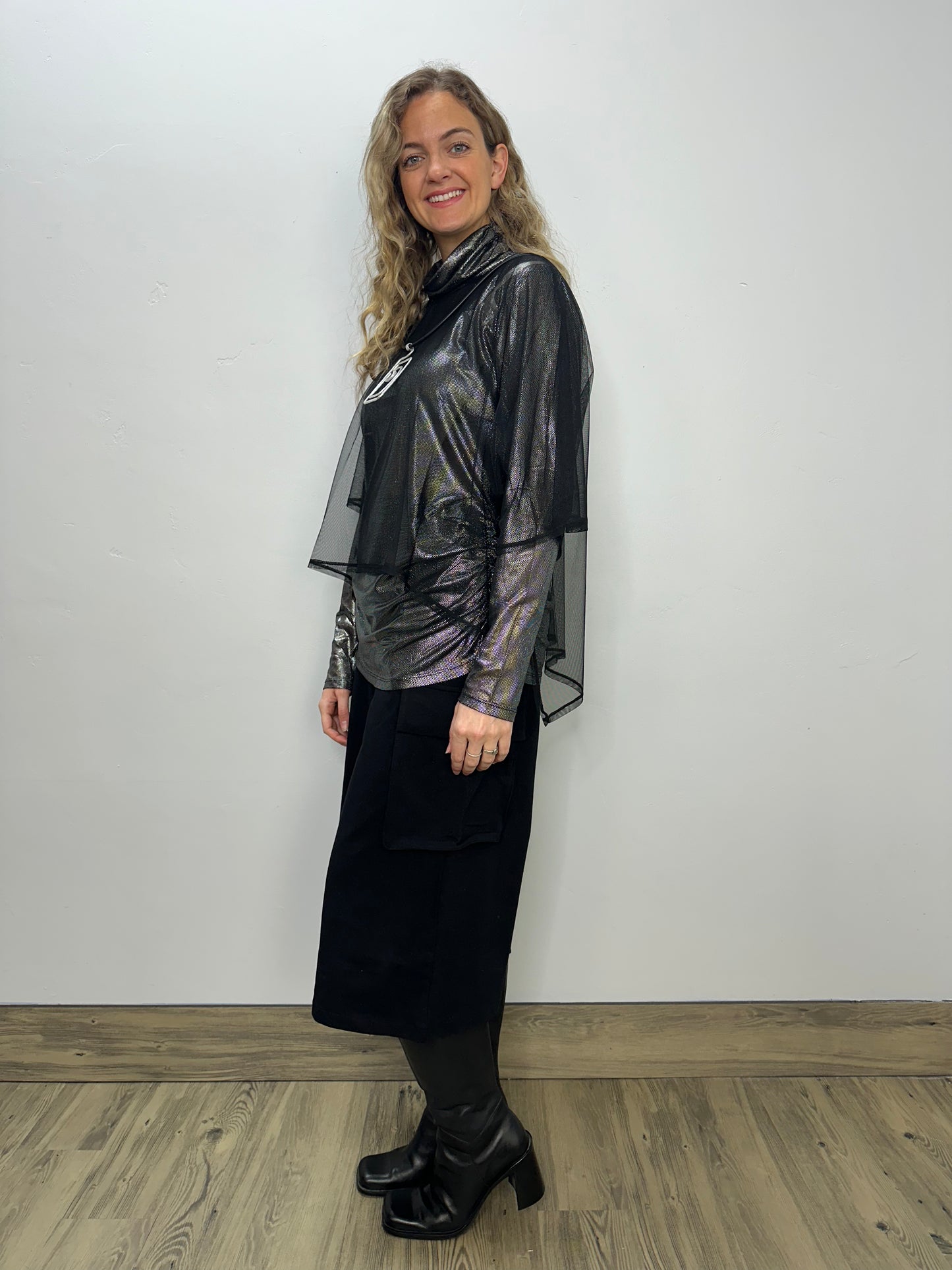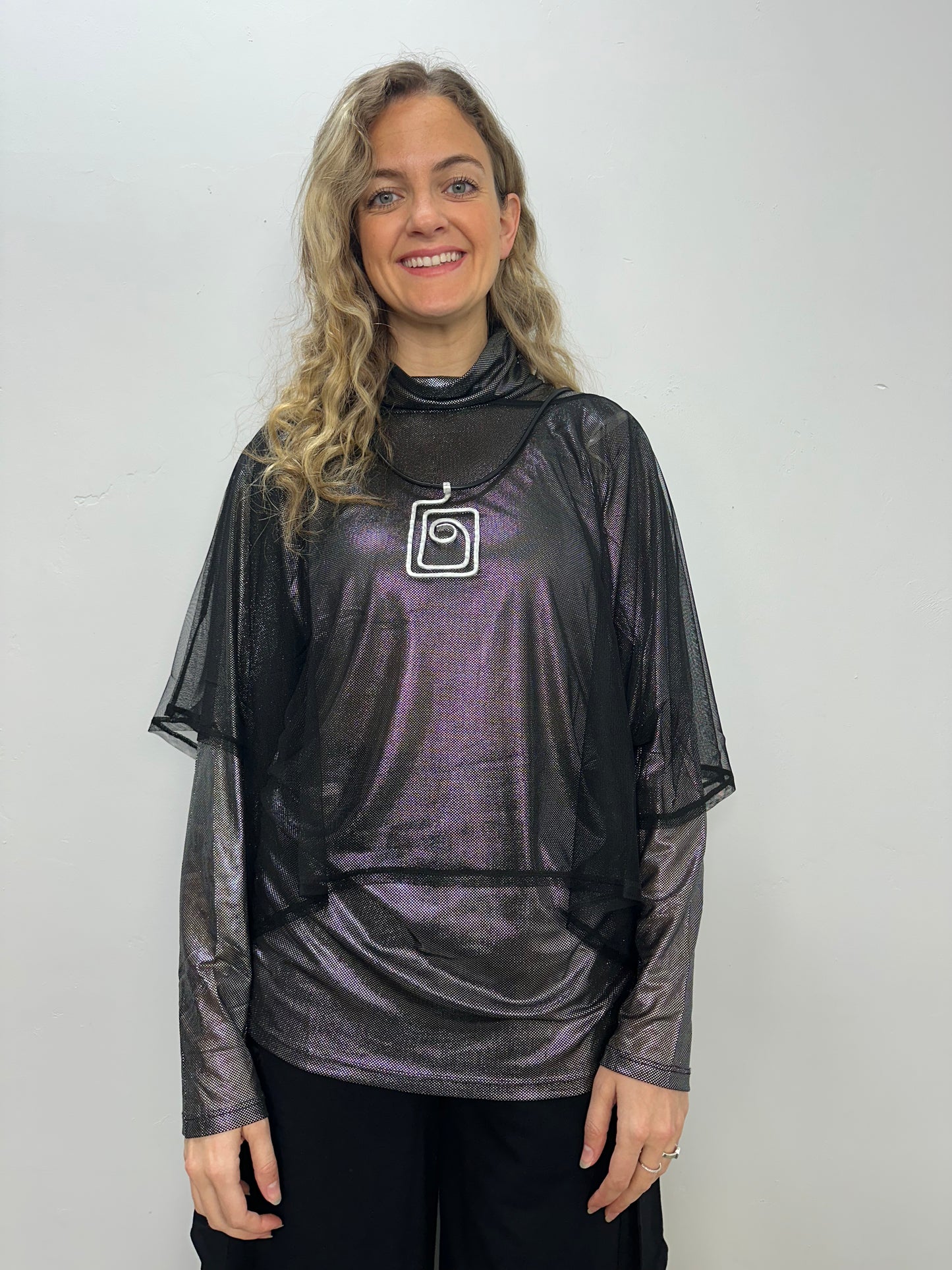 This Black Tulle Alina Top is a must-have for any fashion-forward individual. Made with beautiful black mesh, it is the perfect topper for our silver iridescent long sleeve. Not only is it comfortable, but it also adds a unique layering element to any outfit. Don't miss out on this versatile and stylish piece!