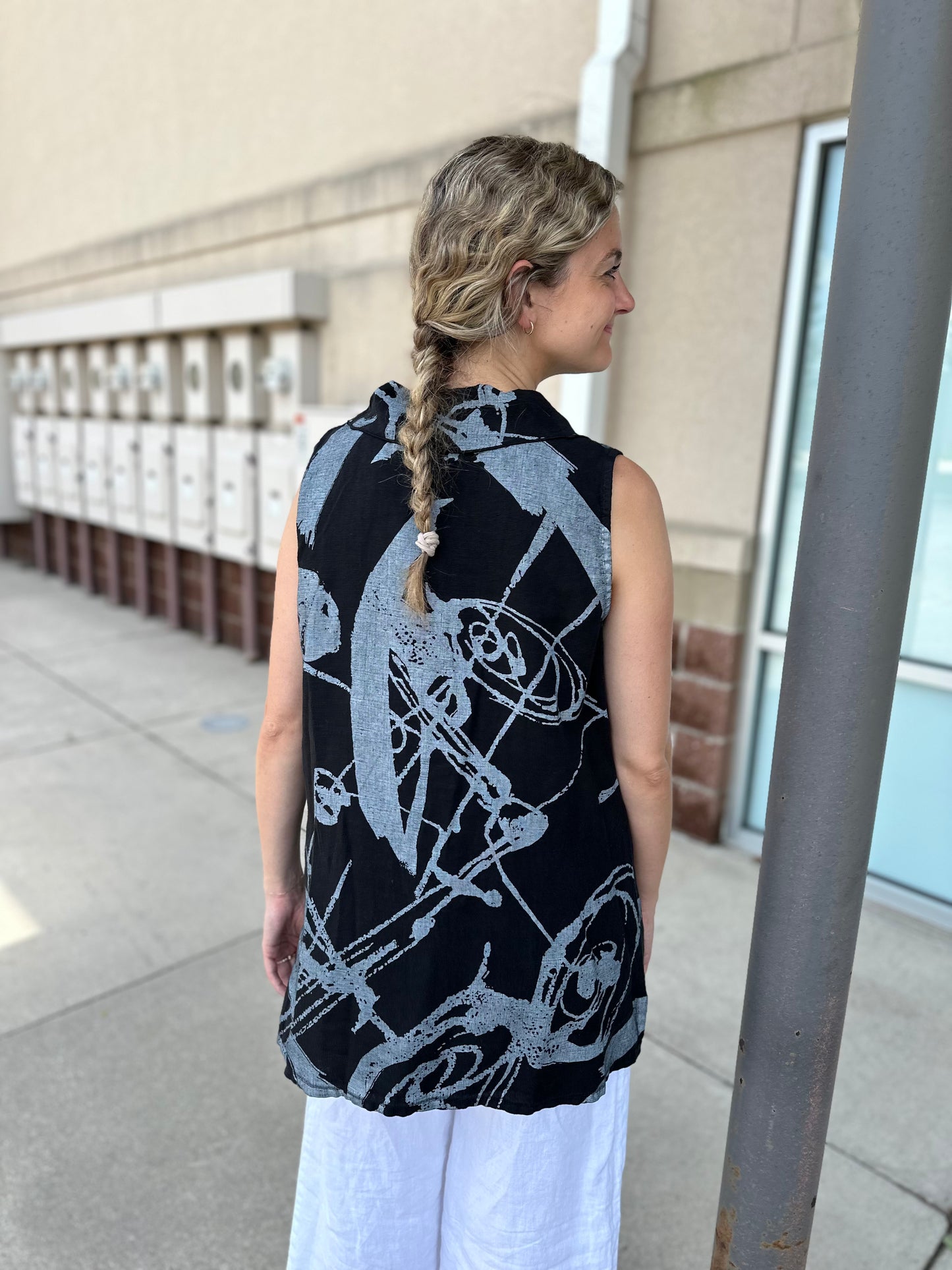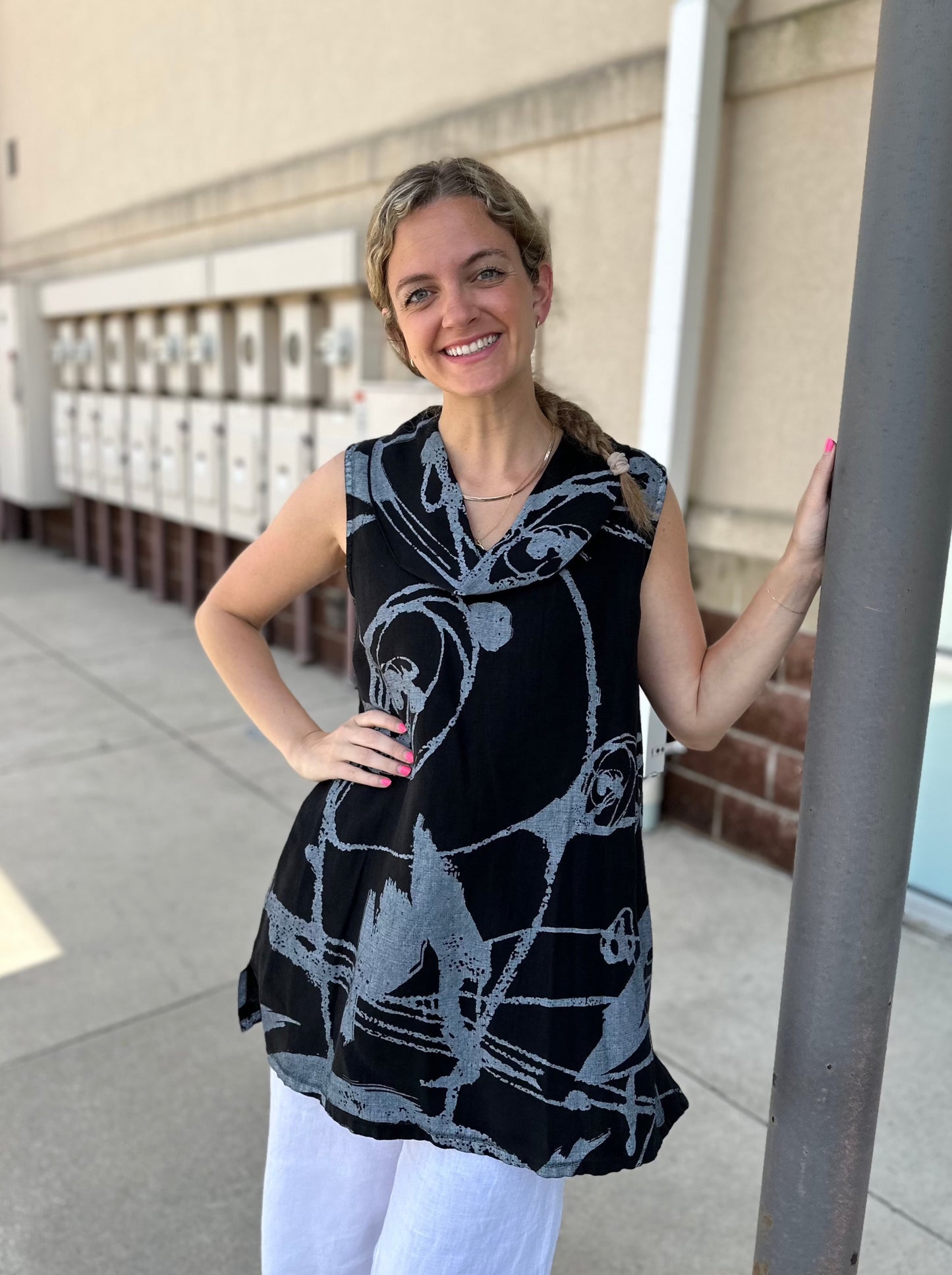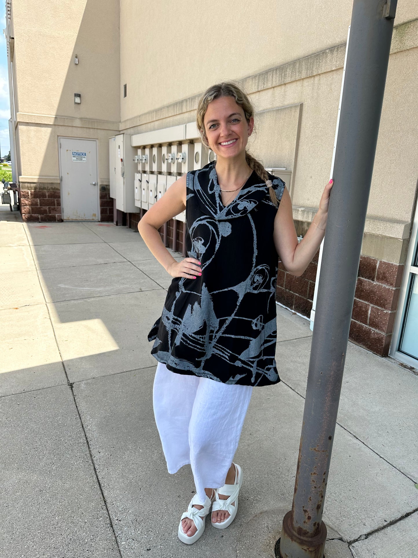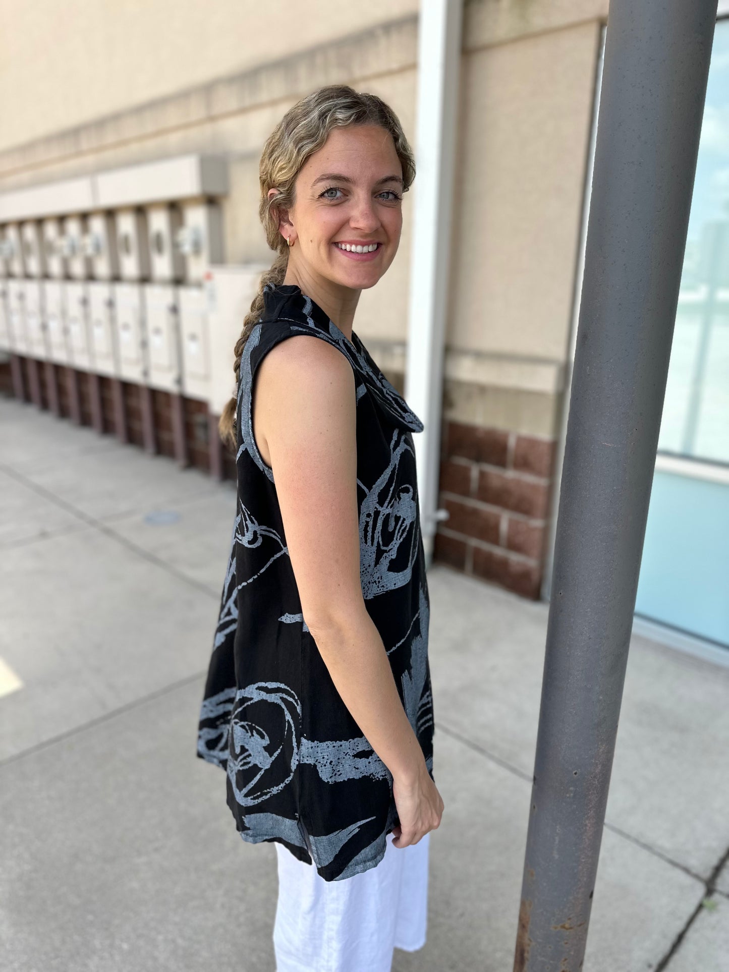 Regular price $90.30Exquisite and effortless, our Black Whimsical Roll Neck Sleeveless Tank is the perfect choice when seeking timeless sophistication. Beautiful white poplin fabric is framed by a cowl neck and side slits for an undeniably luxurious look. This statement piece will effortlessly elevate your wardrobe.