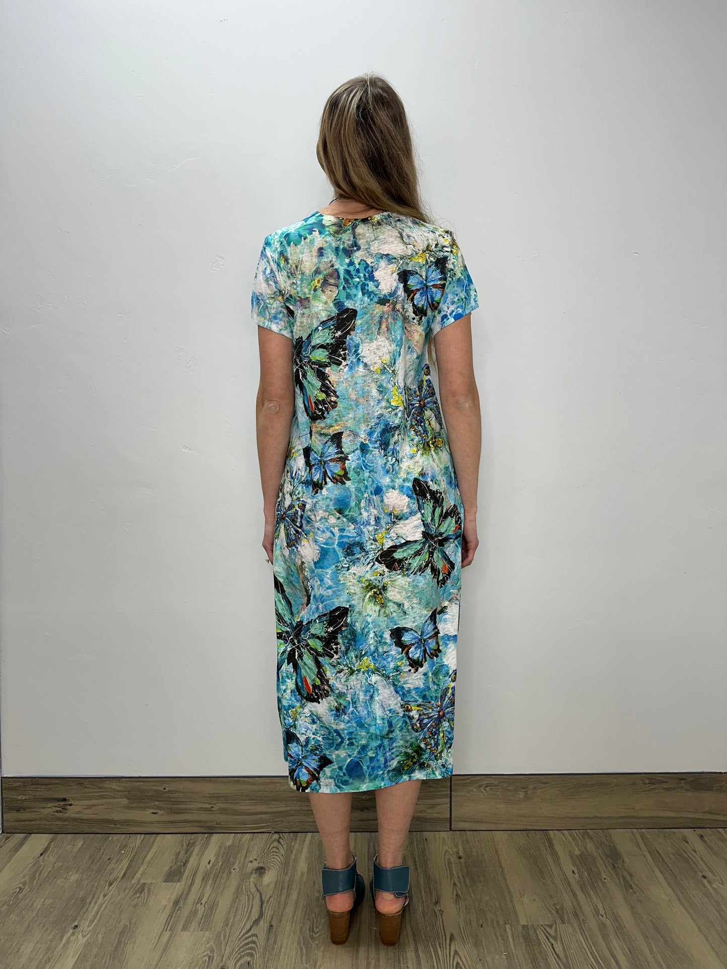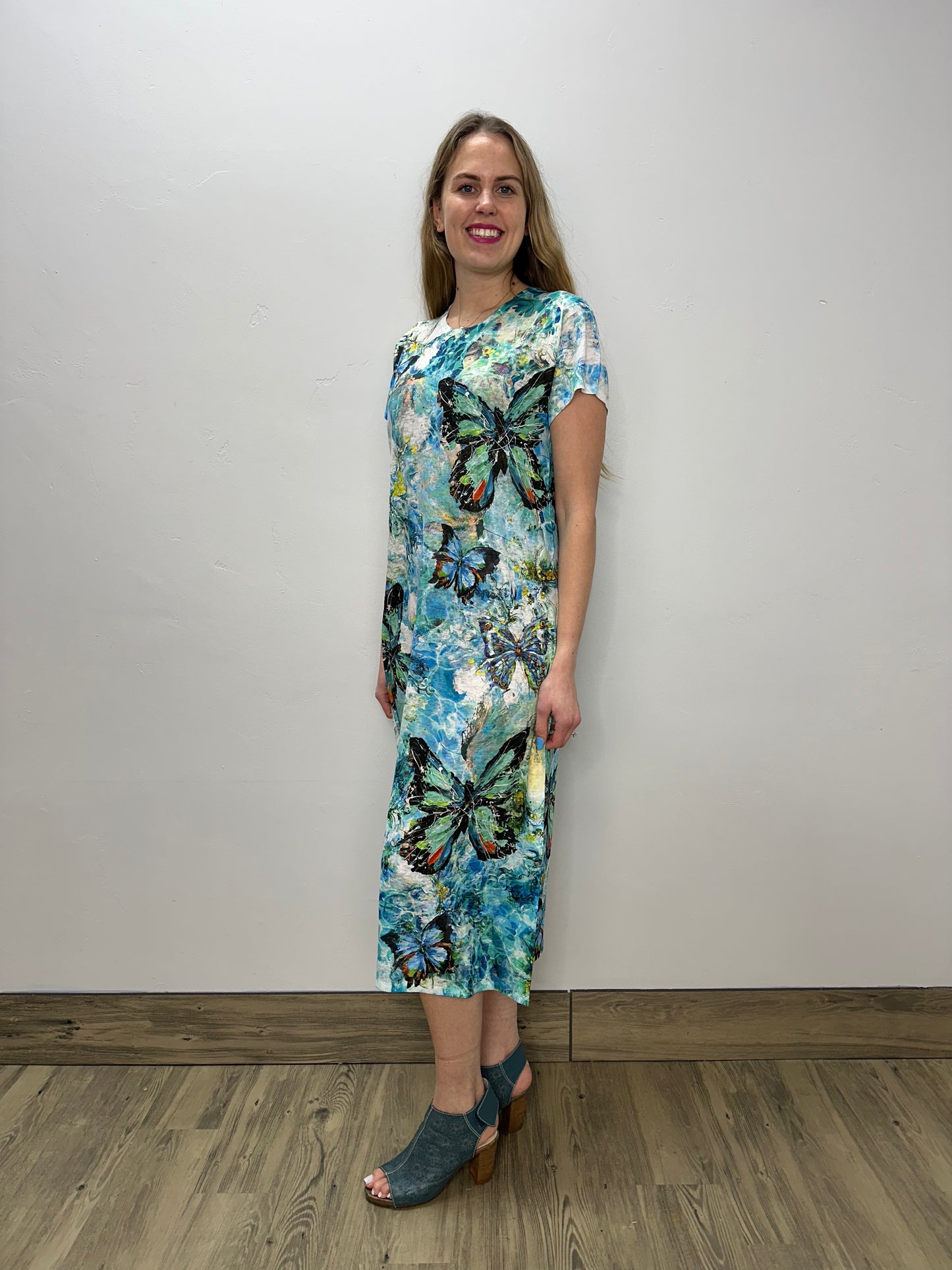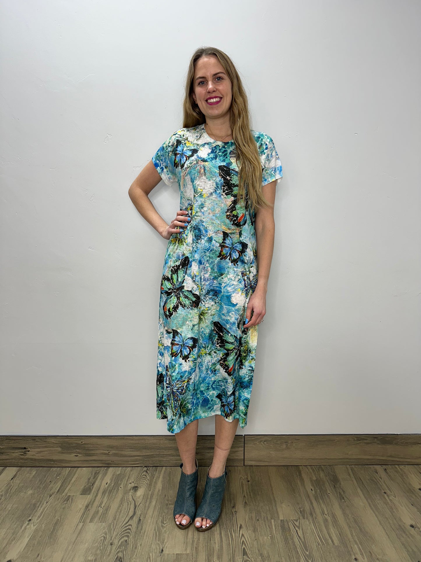 Add some color to your wardrobe with our Blue Butterflies Pattern Short Sleeve A-line Long Dress! Featuring a scooped neck and short sleeves, this dress is both comfortable and stylish. Perfect for any occasion, the A-line cut flatters all body types. Elevate your look with this must-have dress.