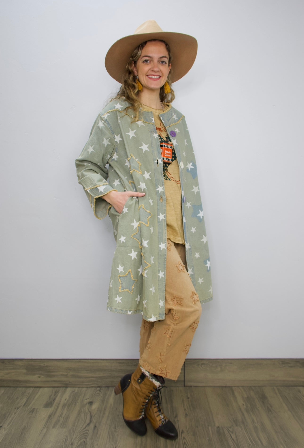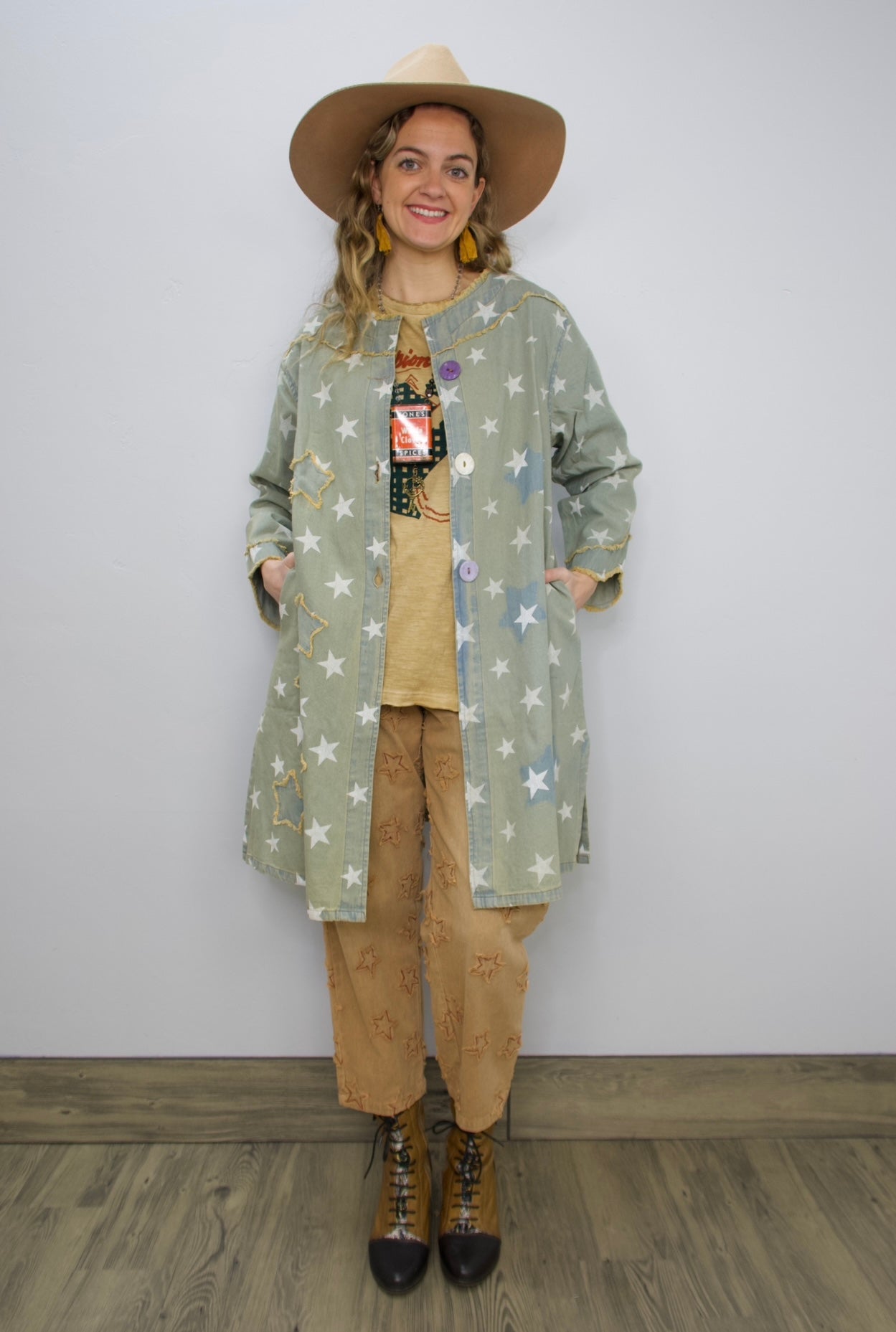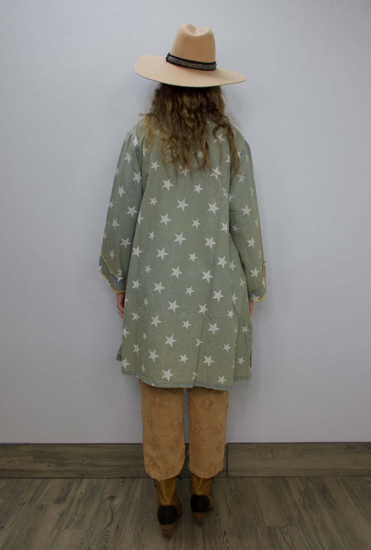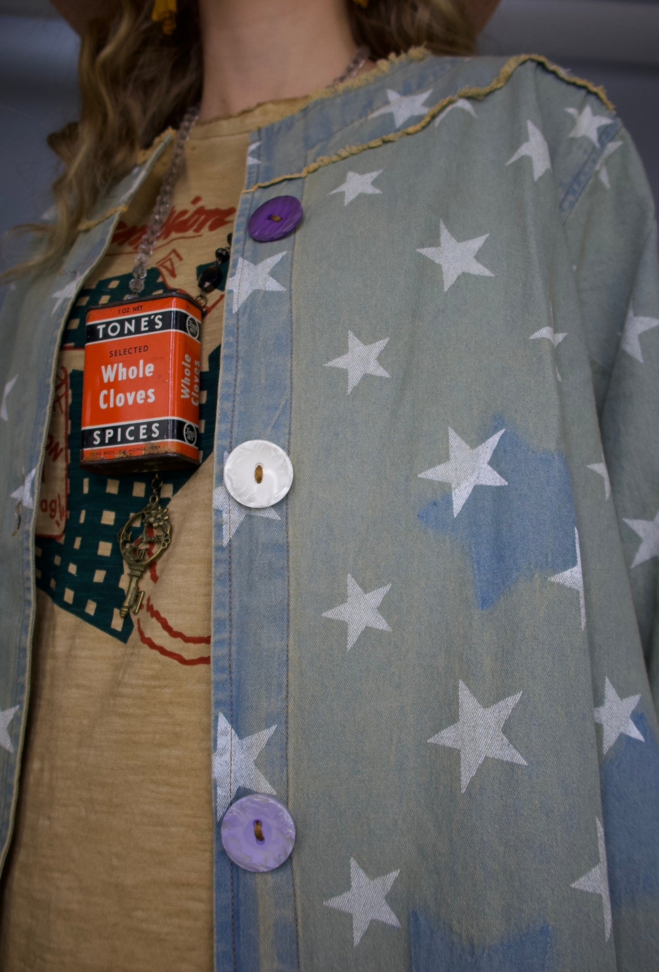 Add a touch of vintage charm to your wardrobe with this Vintage Blue Distressed Jacket with Stars! With its distressed design and adorable buttons, it's the perfect combination of style and fun. Plus, the full length sleeves offer comfort and versatility. Make a statement and stand out from the crowd with this must-have piece.