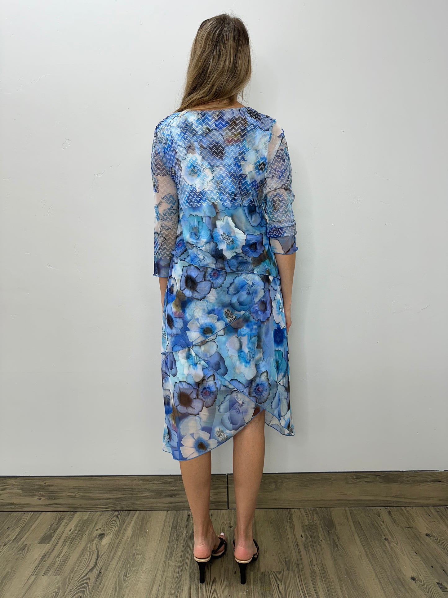 Blue Floral Elegant Drape 3/4 Sleeve Dress