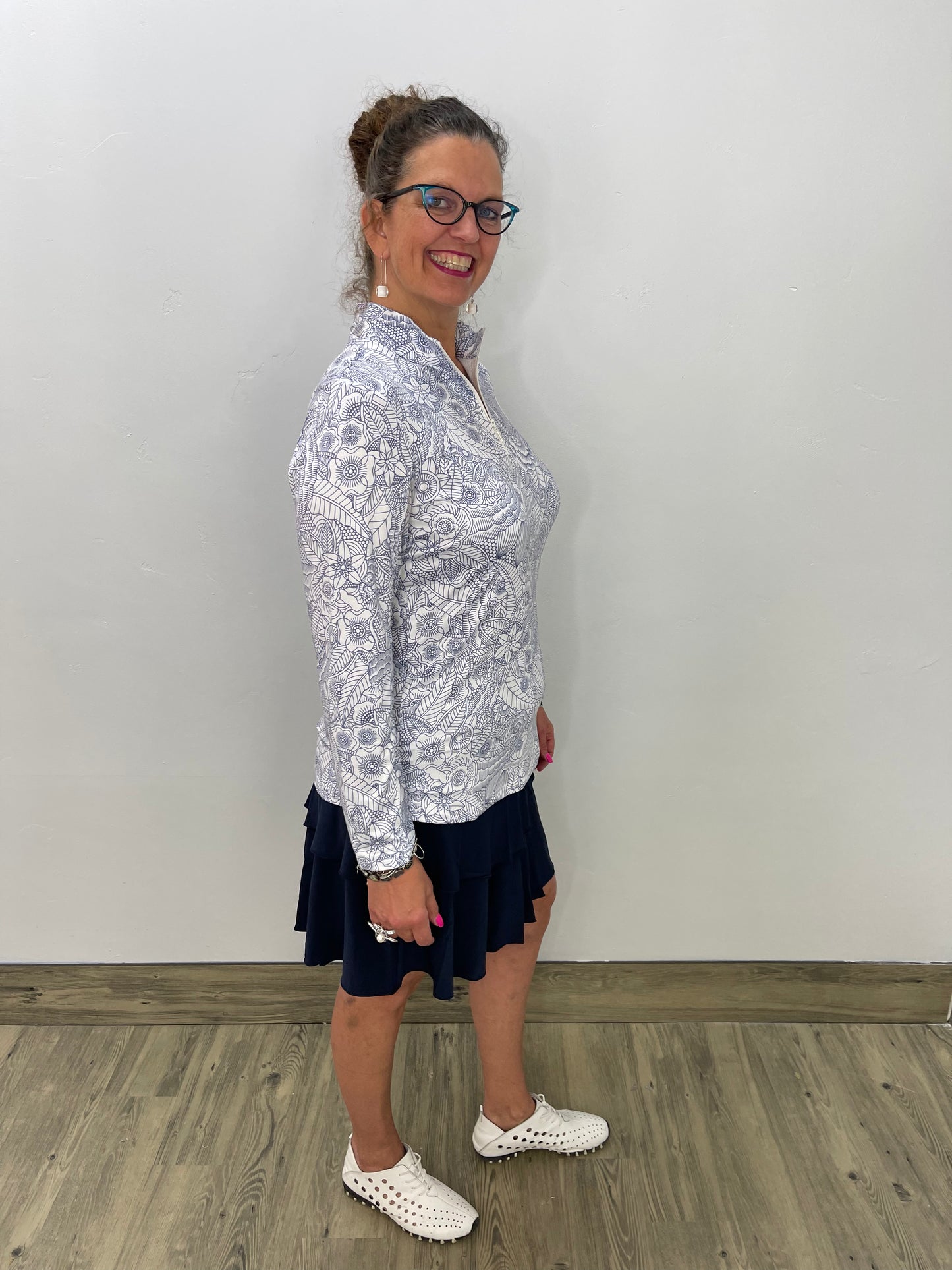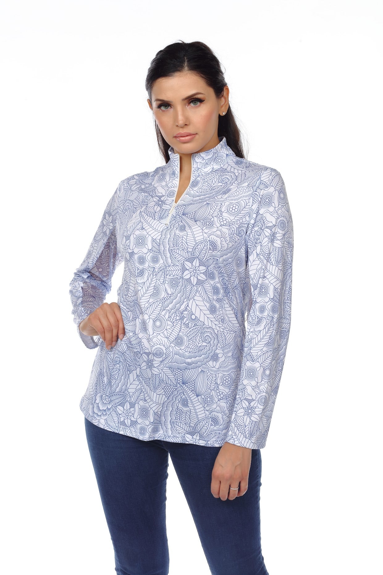 Blue Whimsical Pattern Long Sleeve Top with Zippered Collar
