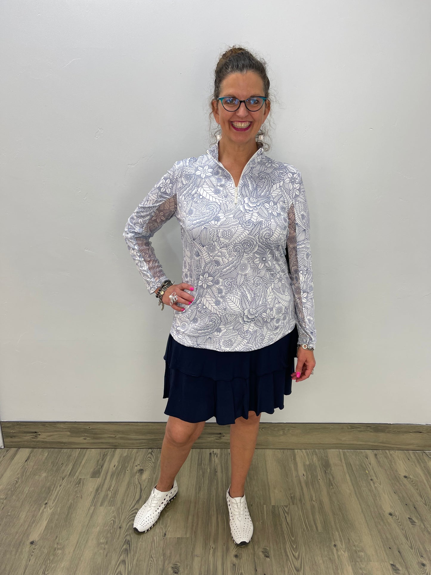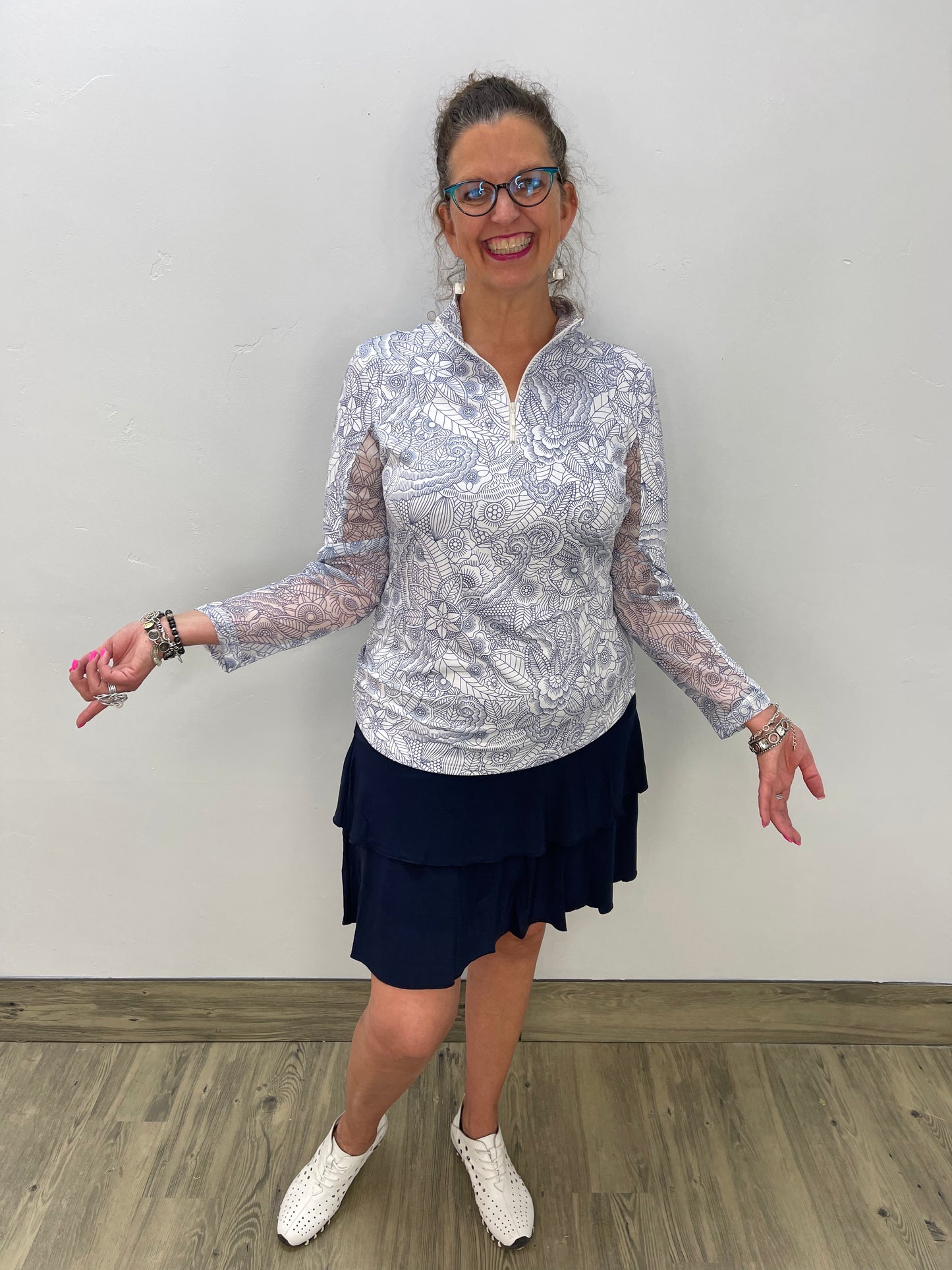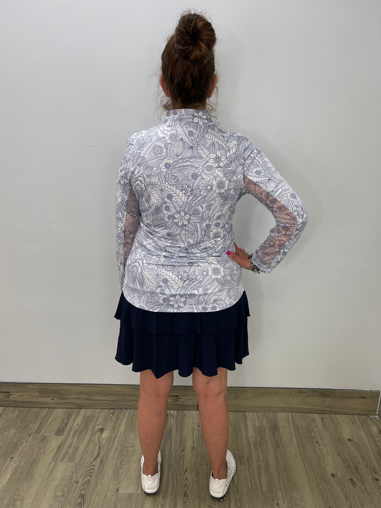 Regular price $67.20This long sleeve Tango Mango top is designed with a zippered collar and long sleeves that are made with a mesh fabric underneath. A generous amount of stretch throughout.