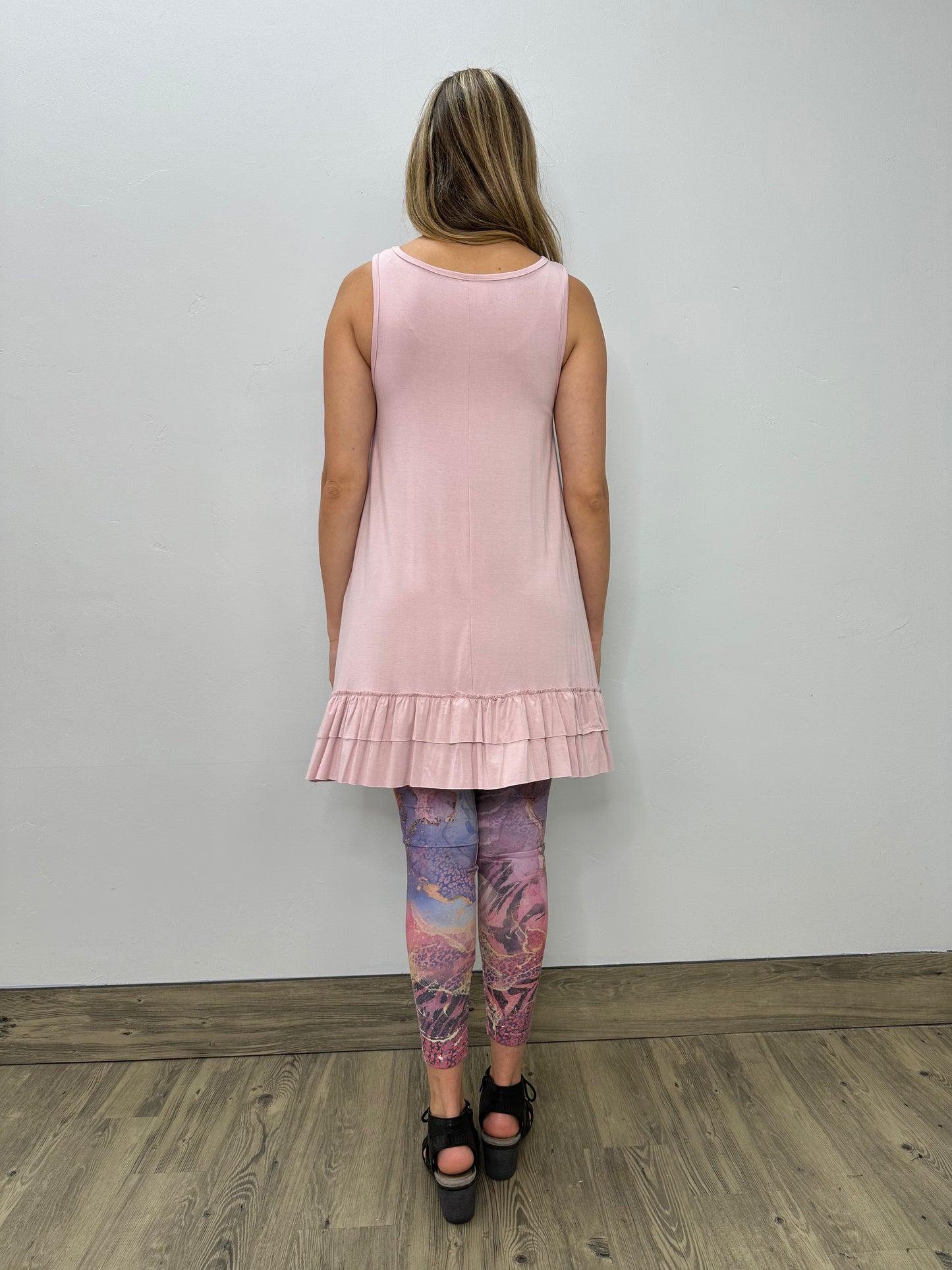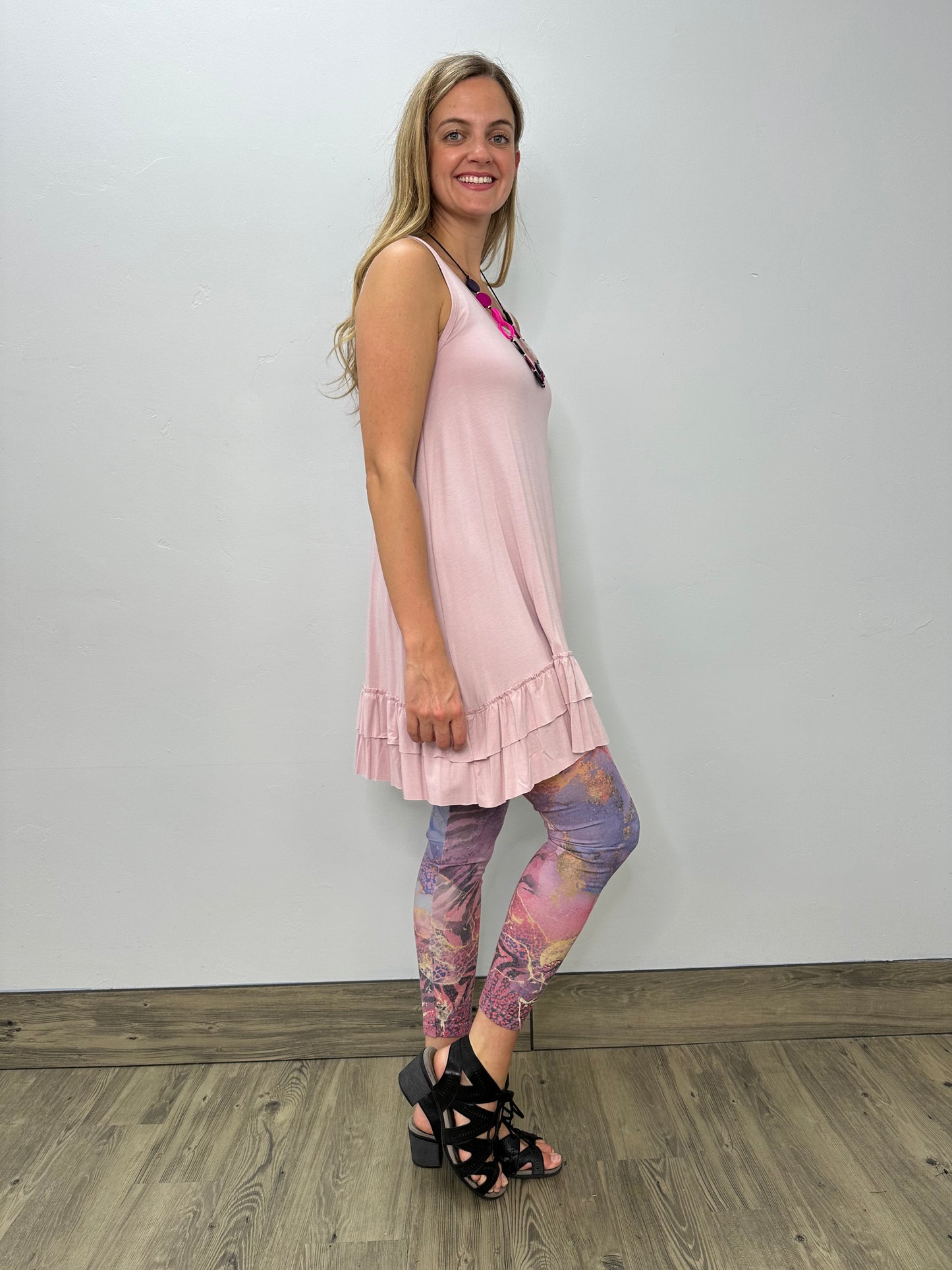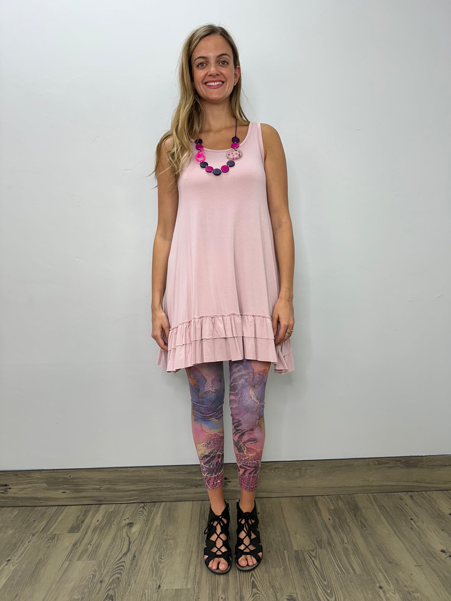 This Twist designed double ruffle hem adds dimension and distinction to your outfit. The soft modal fabric wraps you comfortably regardless of your activity. Add some length to your shorter tops and pair perfectly with our wide selection of printed M. Rena leggings.