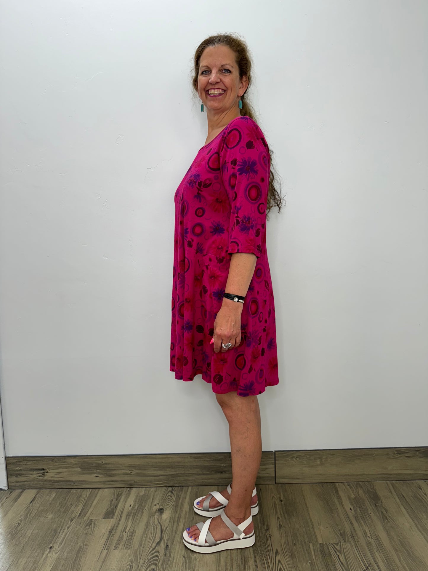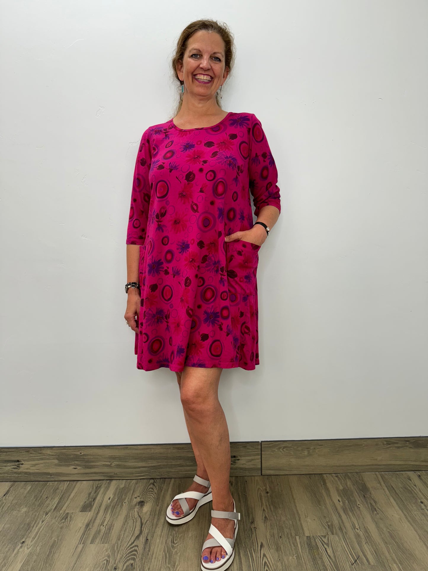 Unleash your vibrant spirit with our Cerise Pink 3/4 Sleeve Patch Pocket Dress. This comfortable and stylish dress boasts a scooped neckline and two patch pockets for added convenience. The cute cosmos jersey pattern will make you stand out in the crowd, perfect for your Summer wardrobe!