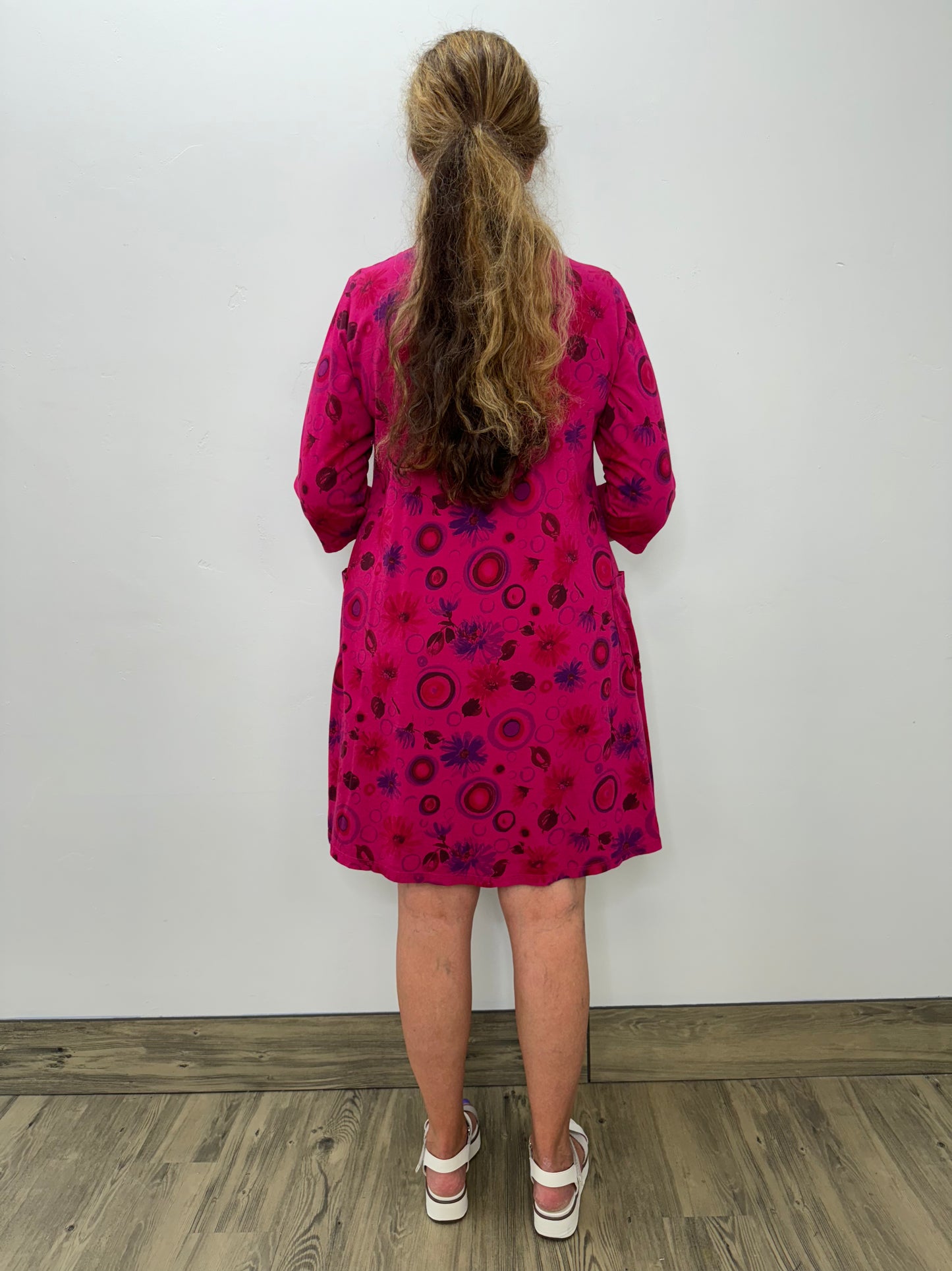 Cerise Pink Pattern 3/4 Sleeve Patch Pocket Dress