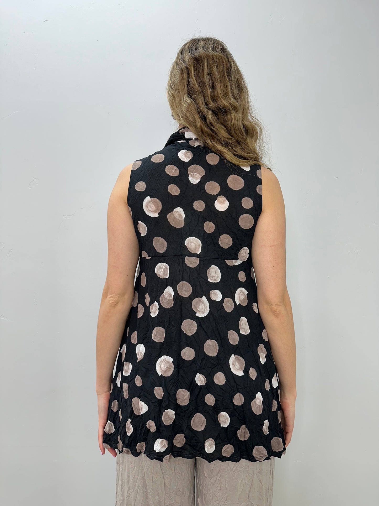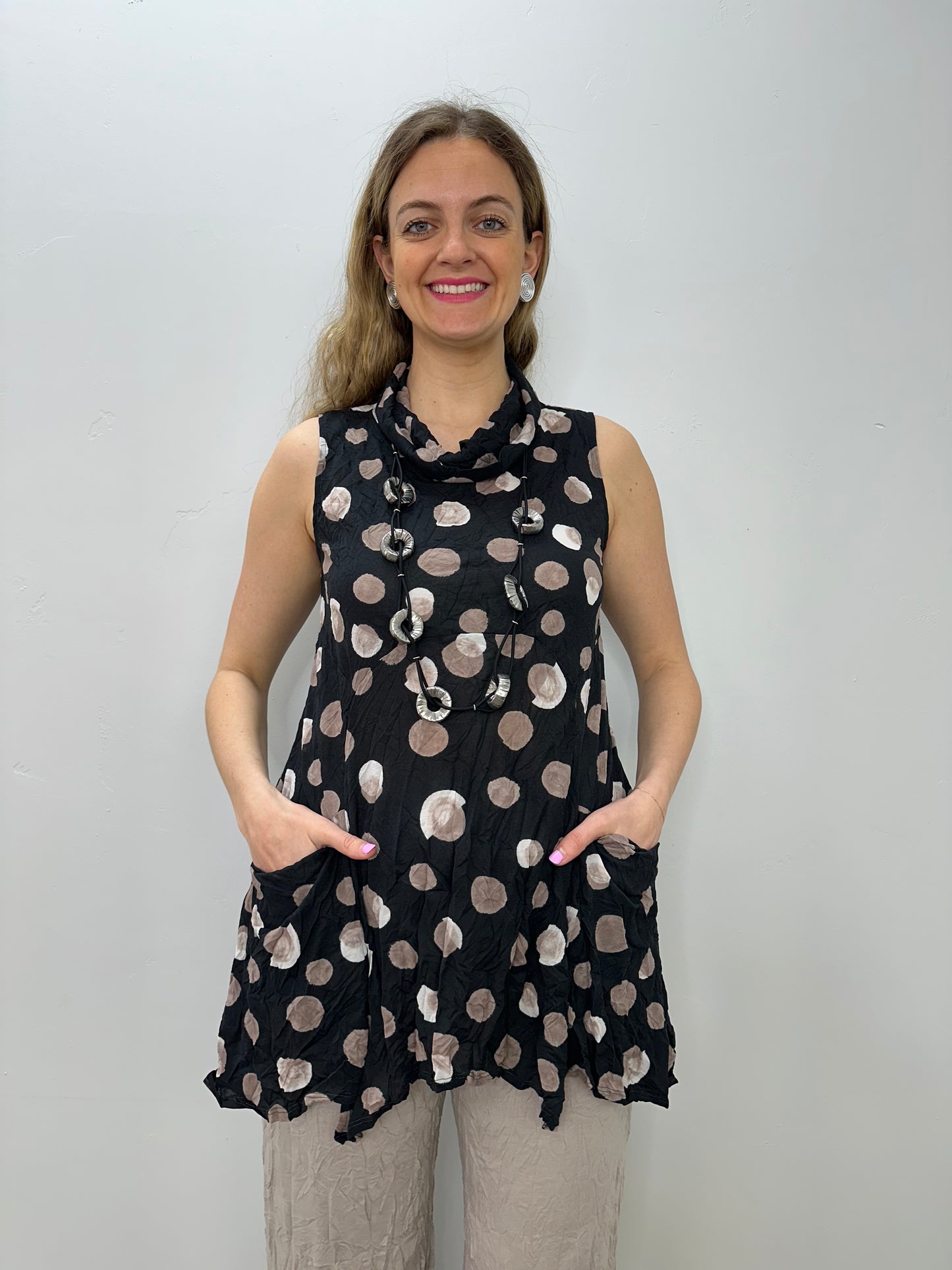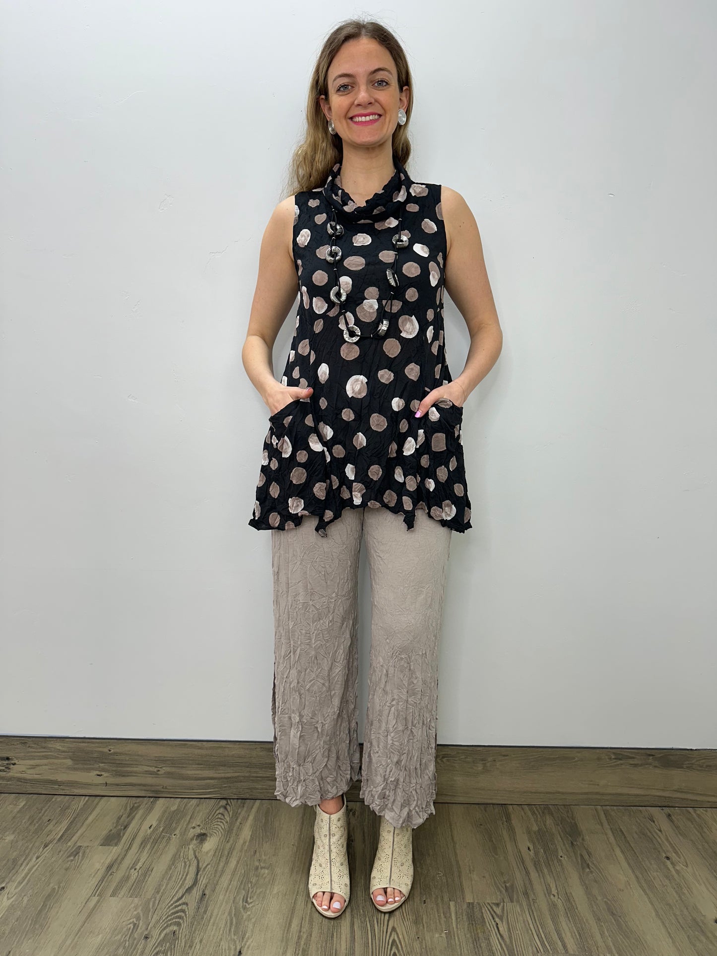 Get giddy for the Chalet Charcoal Katie Tunic. A breezy and refreshing sleeveless garment fashioned with side in-seam pockets and a loose cowl neckline in an A-line silhouette to accentuate your figure and upscale your style. The asymmetric hem flares to give you the best look, all fixed in our travel friendly crinkle mesh fabric.