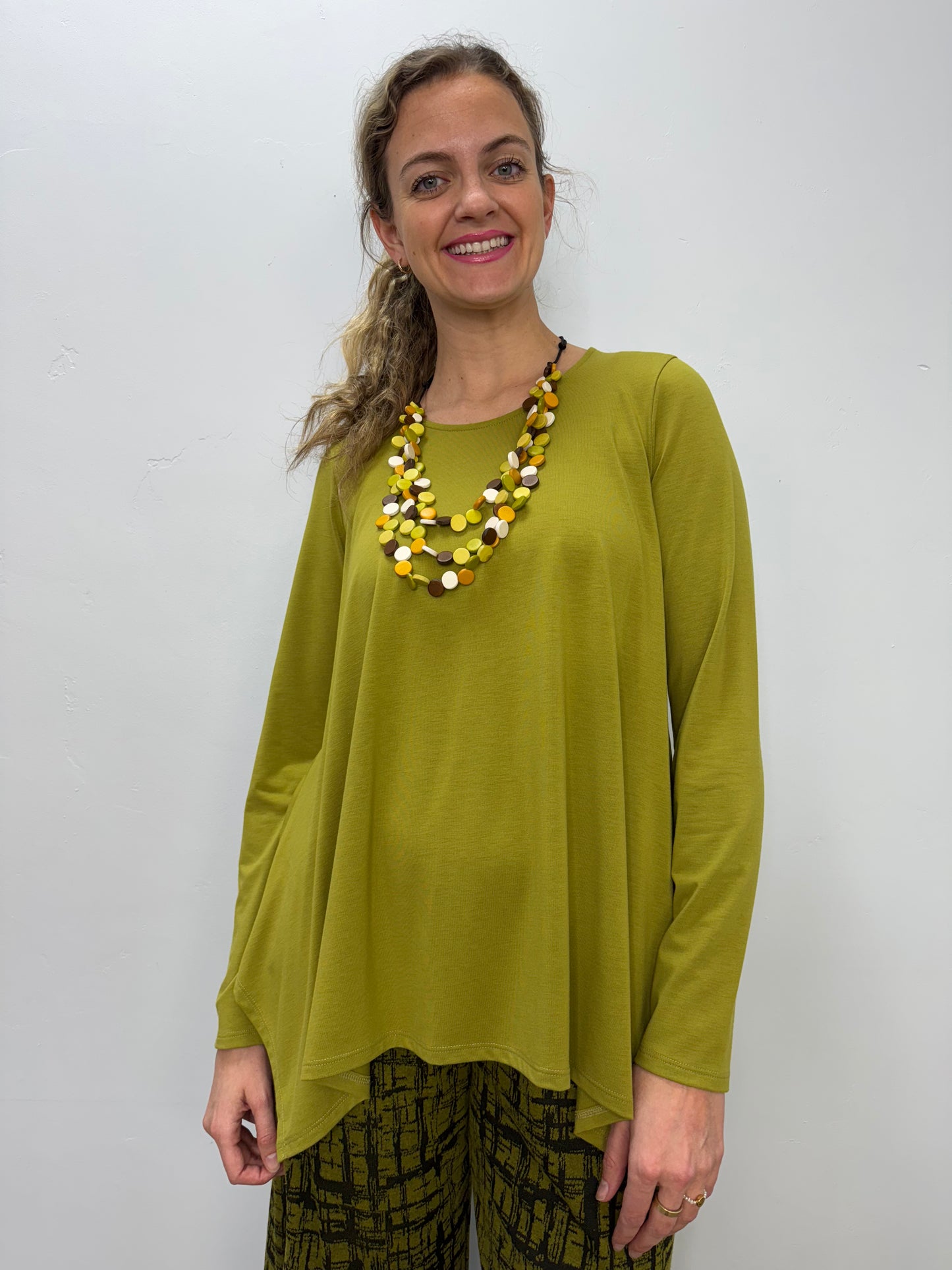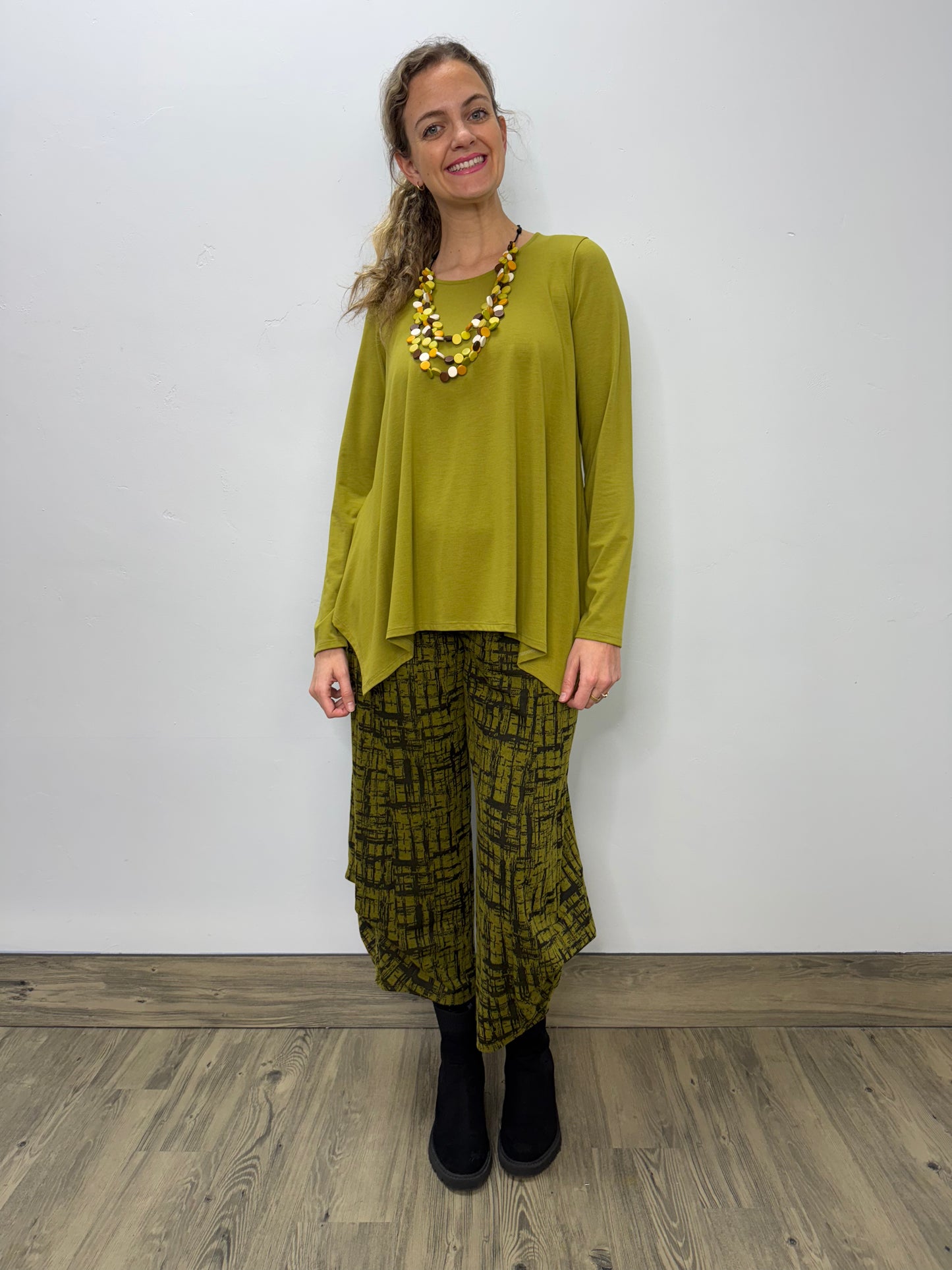 The Chalet Gretta Top is thoughtfully crafted to provide an effortless blend of style and comfort. With its soft, flowy silhouette, this top drapes beautifully, creating a flattering fit for any body shape. The round neckline and long sleeves add a timeless touch, while the asymmetrical hemline introduces a subtle yet modern twist.