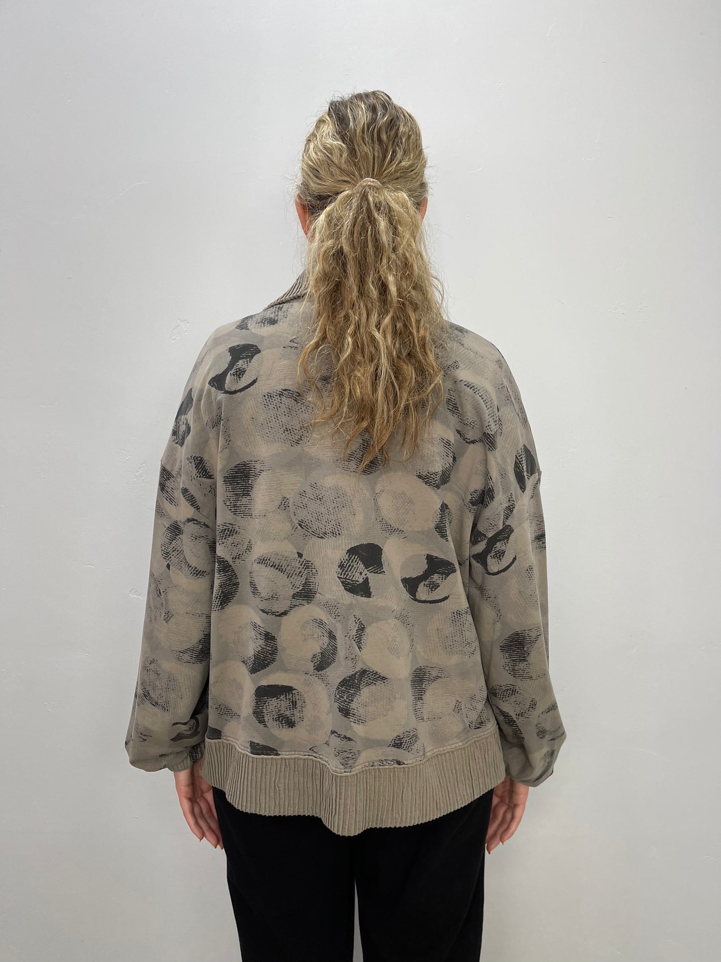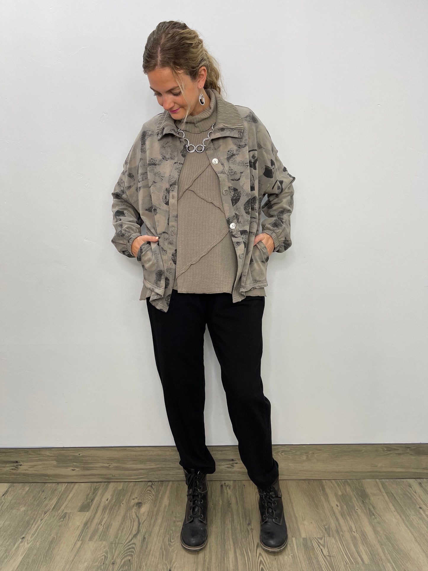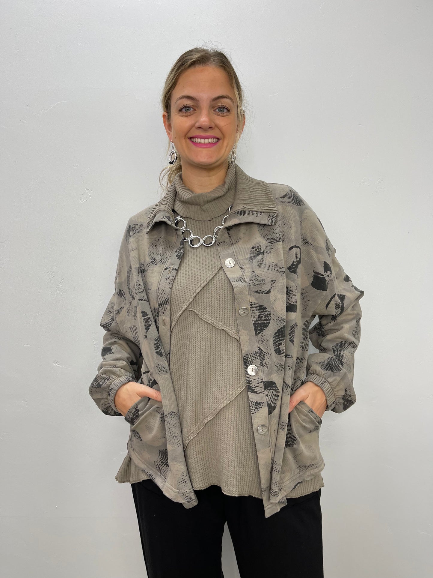 Regular price $151.20This super cute short swing coat from Fenini is a great jacket to throw on to dress up any outfit. It has these beautiful silver metal buttons as a closure and two raw edge front pockets. A cute little ribbed collar and ribbing on the bottom of each sleeve and can we talk about how adorable this pattern is!?
