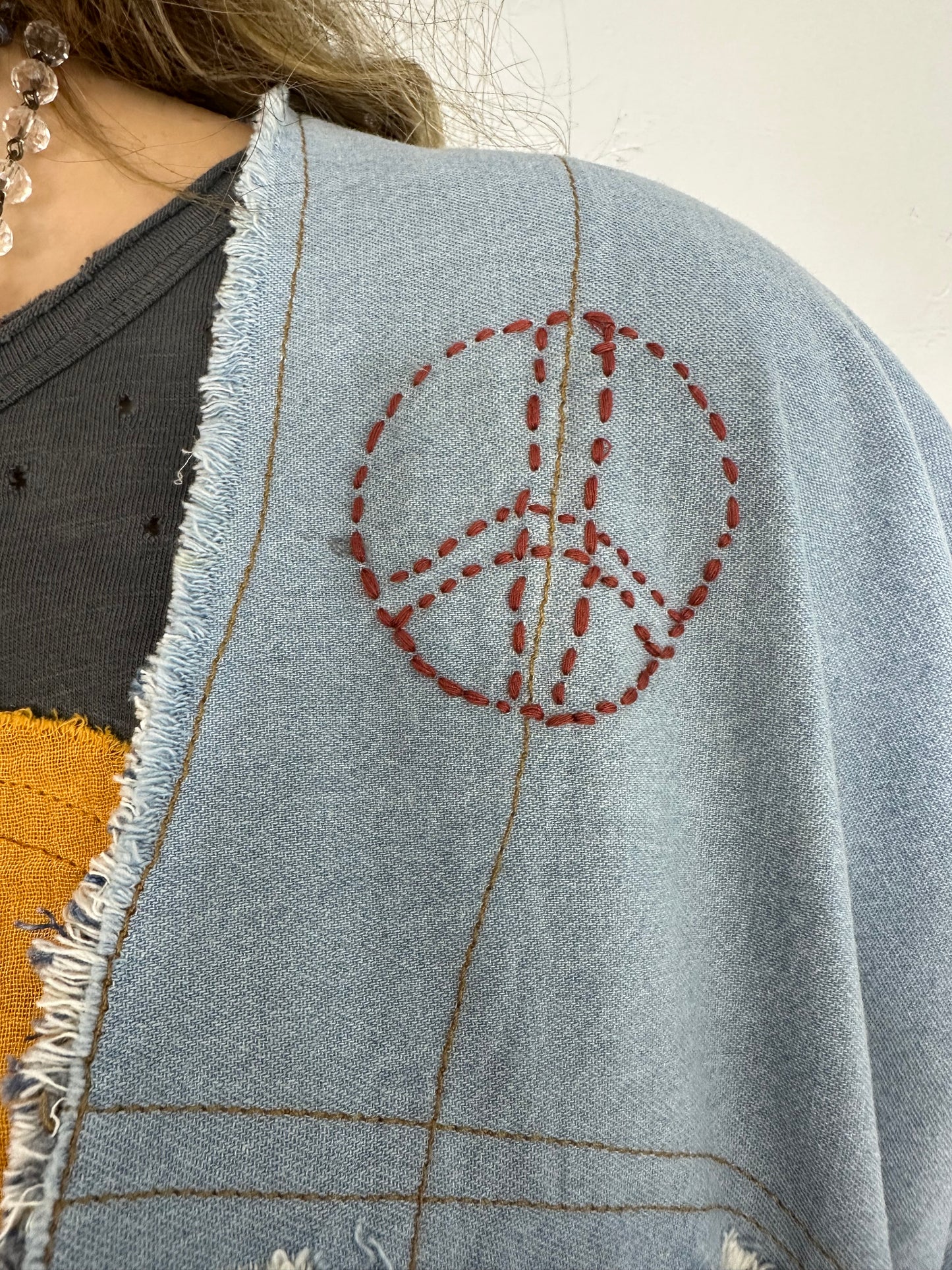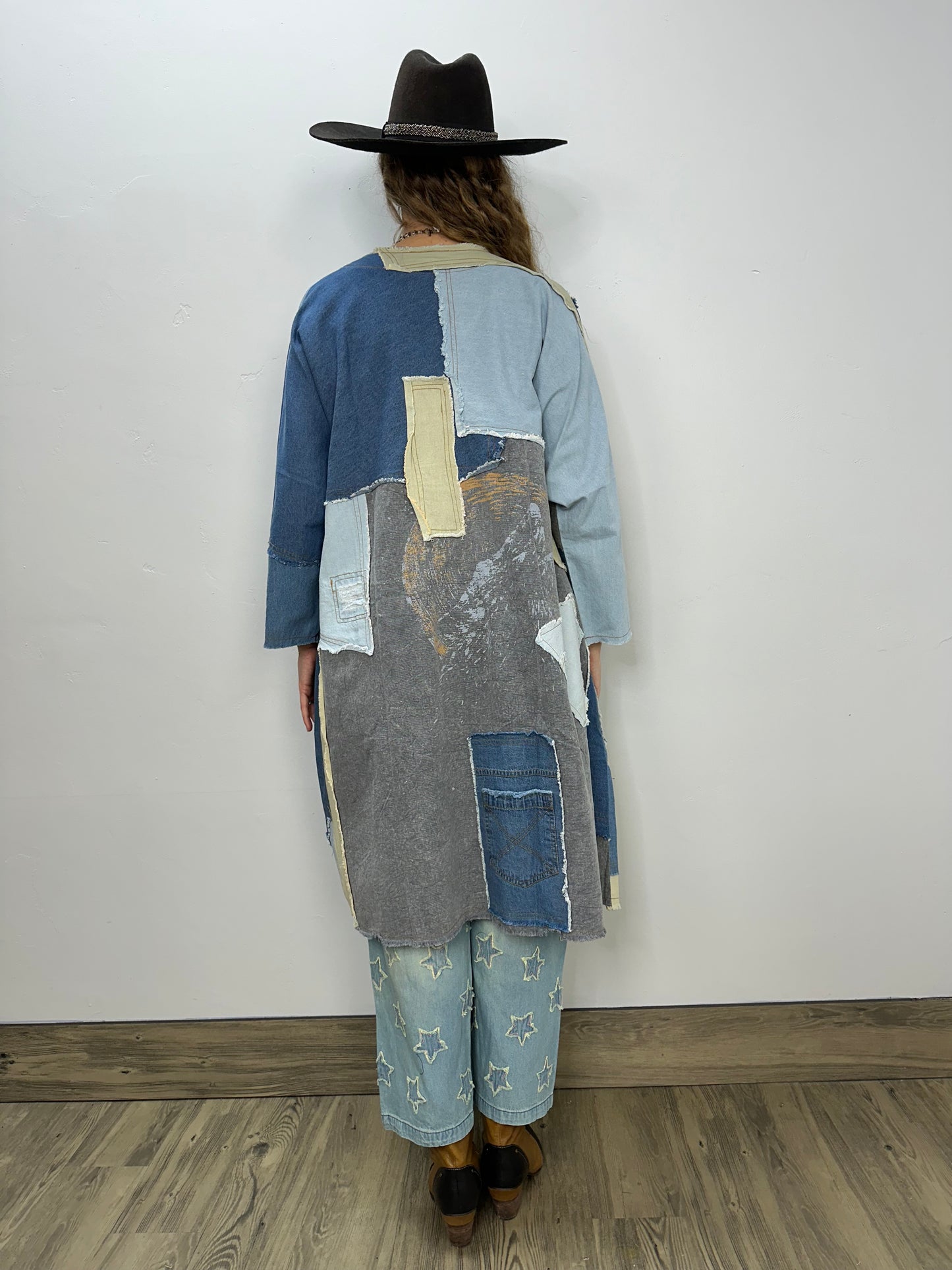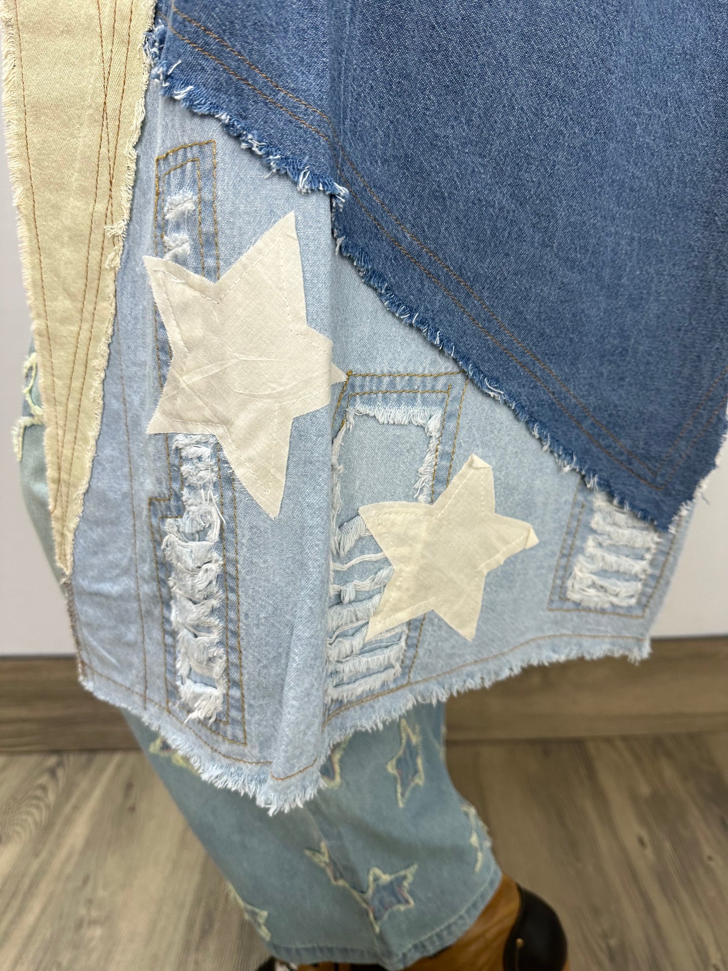 Patchwork Distressed Denim Jacket with Stars and Pockets
