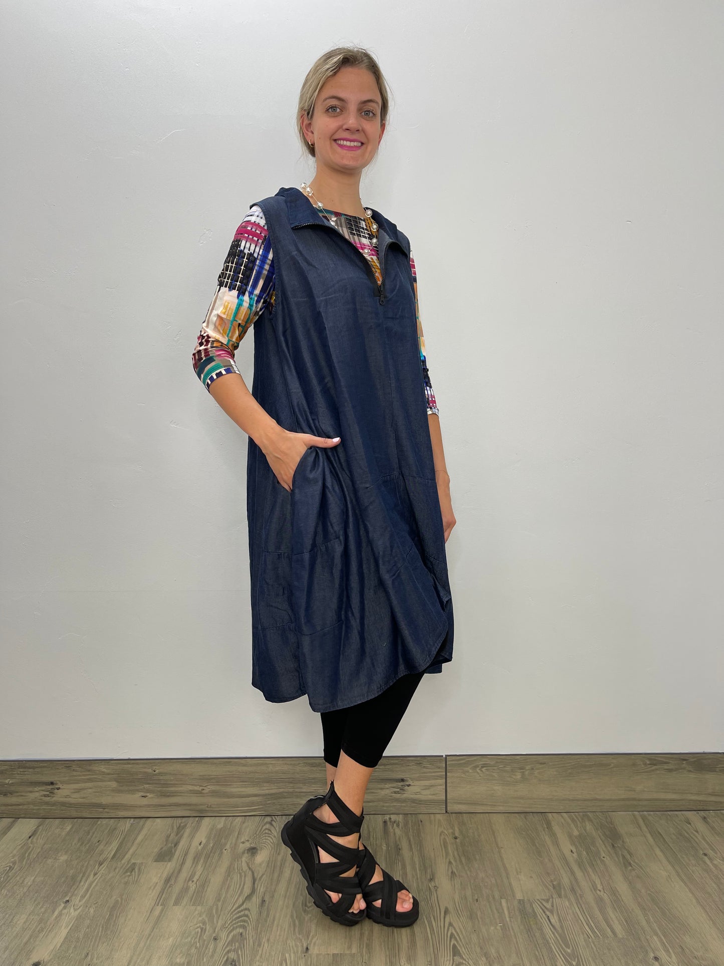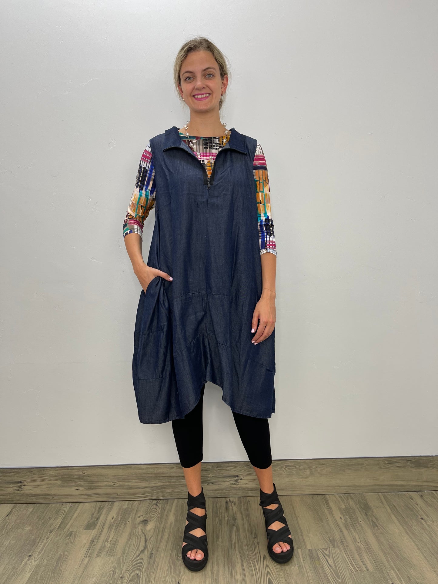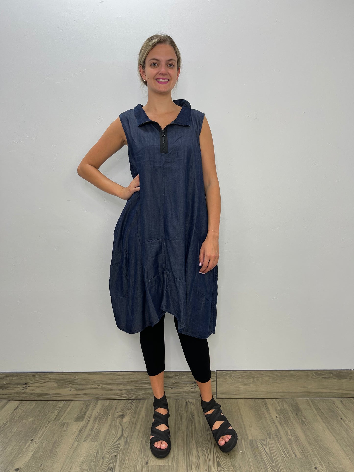 Be comfortable and beautiful in the Denim Sleeveless Aubrey Dress! The stunning tencel fabric provides a soft, lightweight feel, and the unique 1/4 zip and collar neckline create a chic look. Plus, front pockets make it practical as well as fashionable! Dare to wear something special.