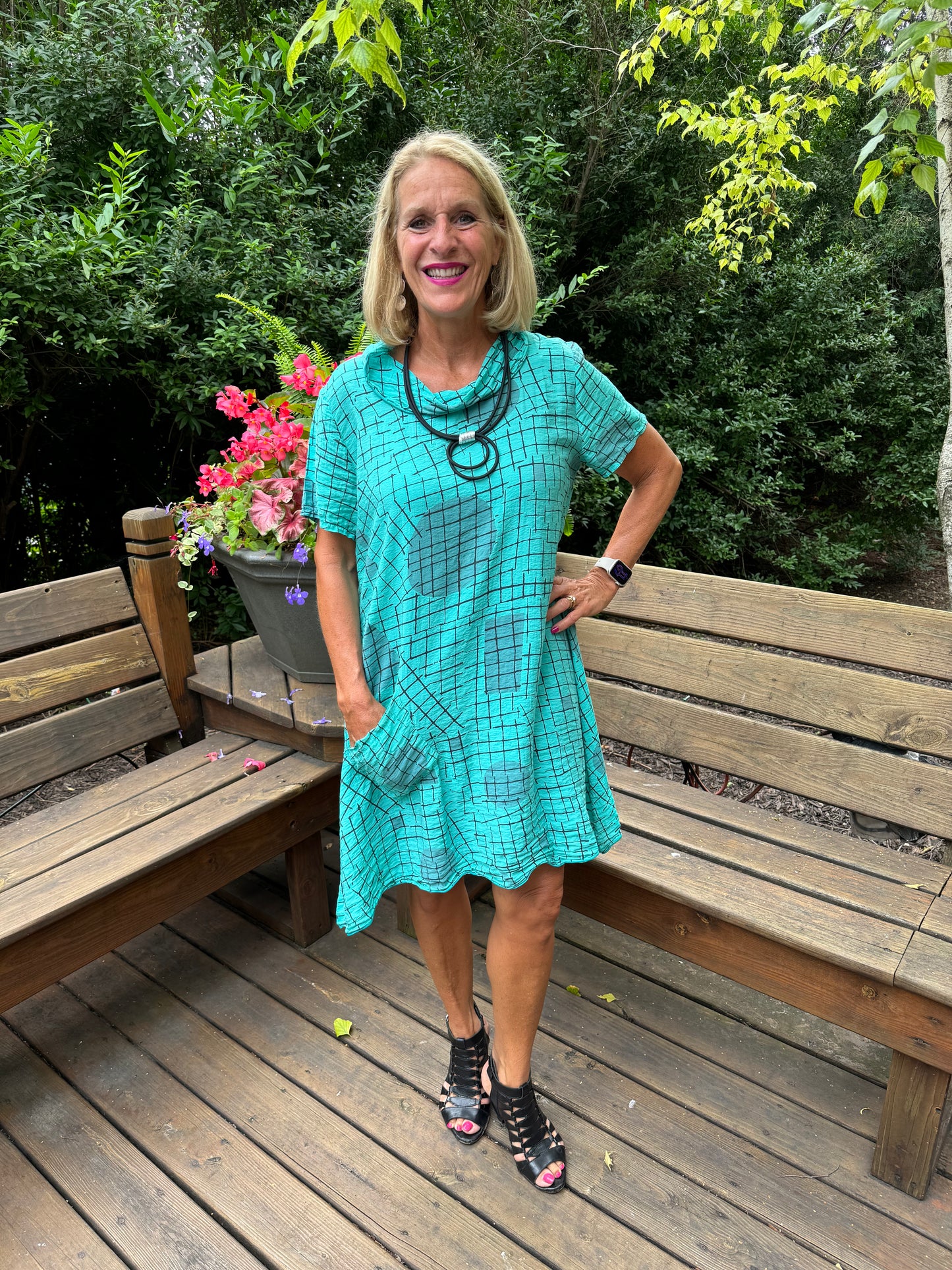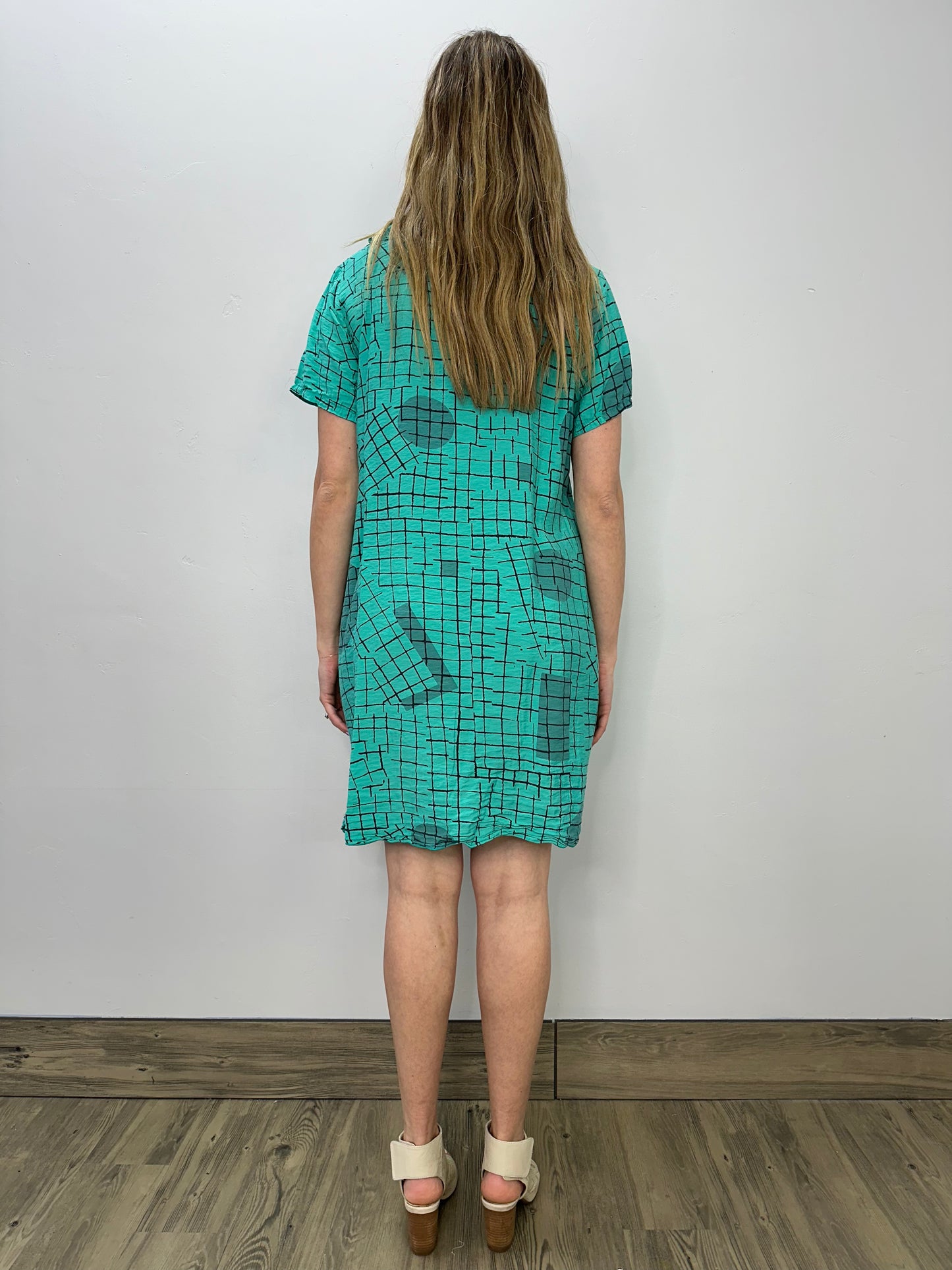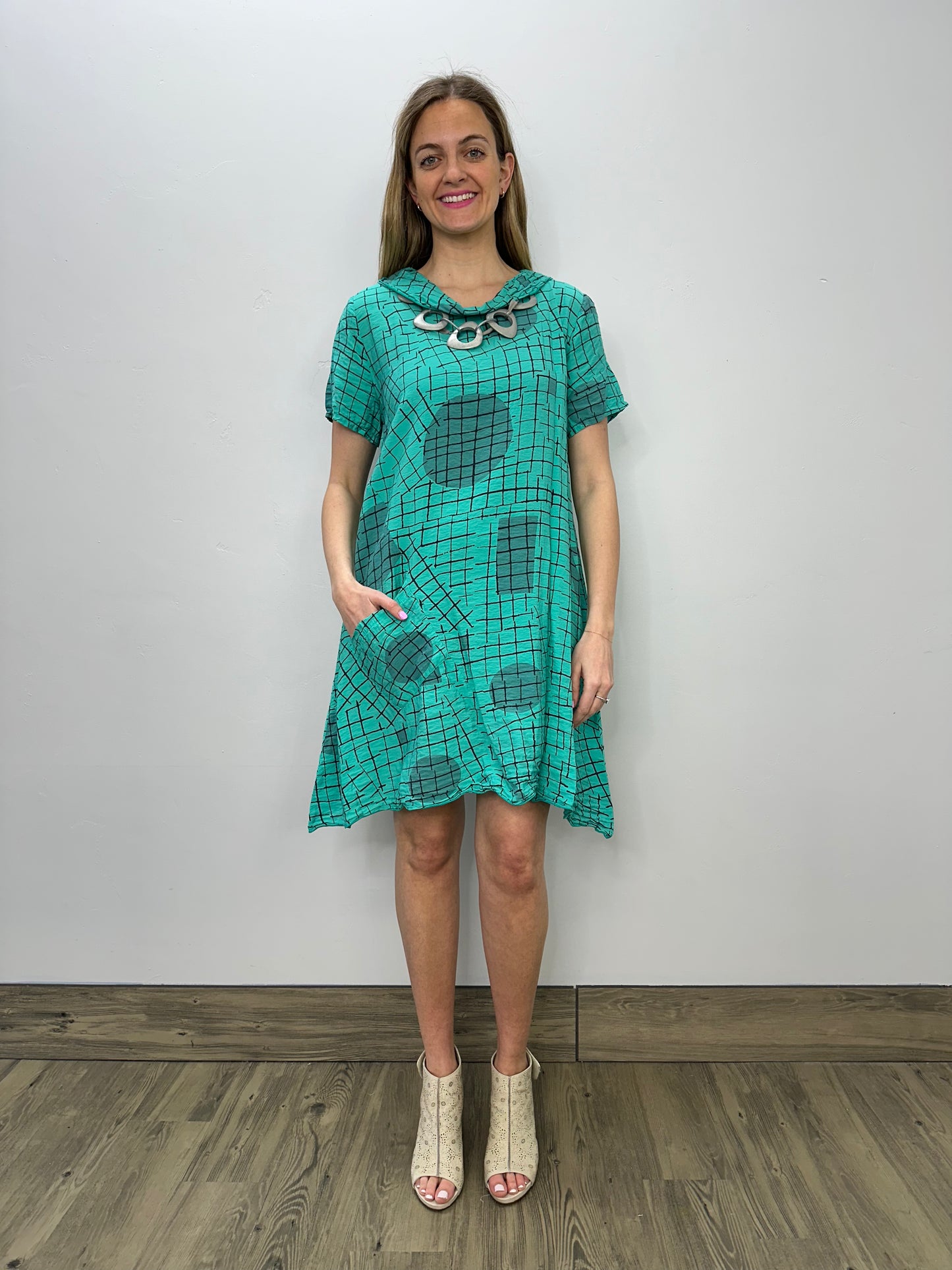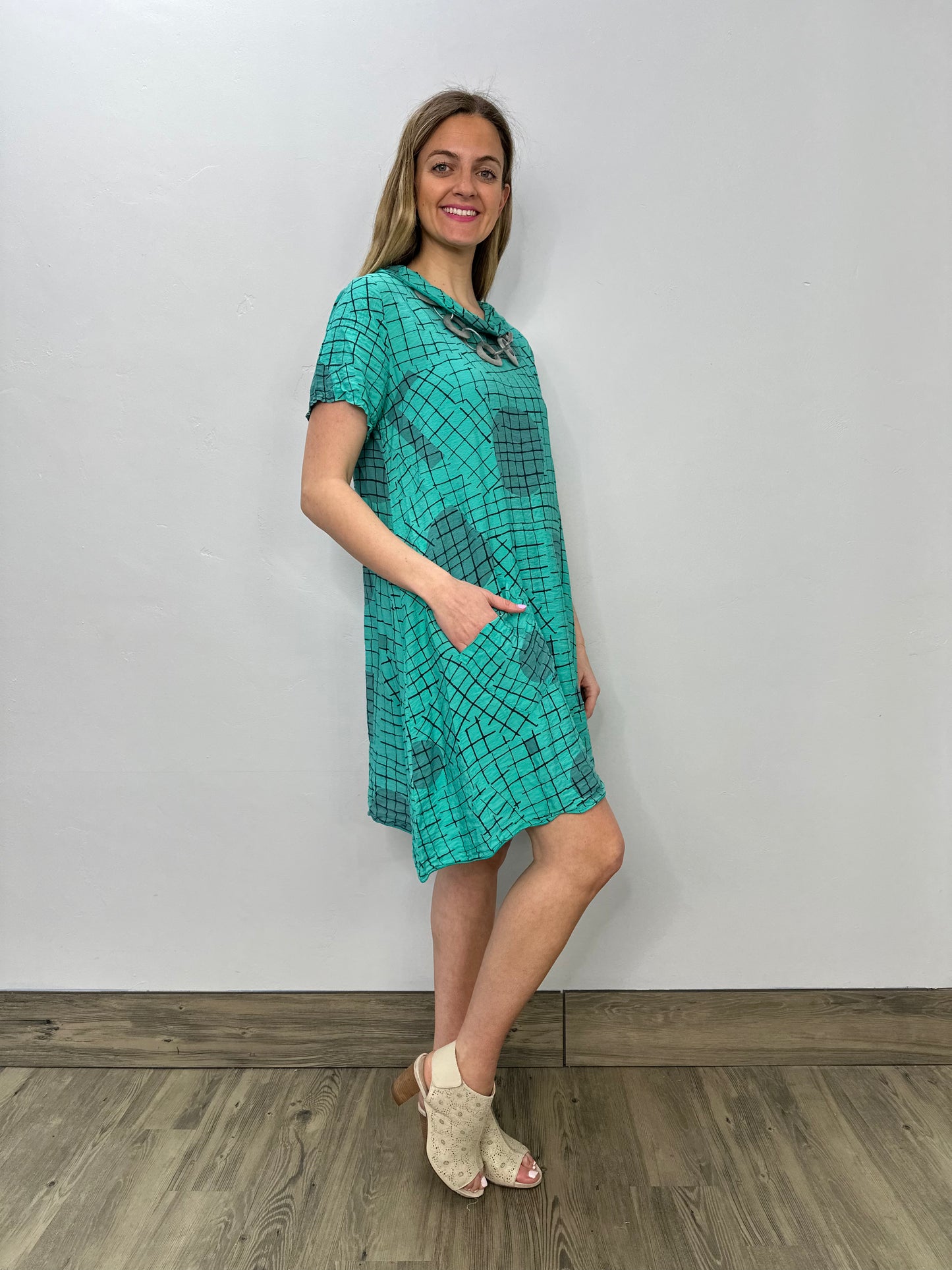 Get ready to turn heads with our Ladder Emerald Short Sleeve Roll Neck Dress! The pretty light pink color paired with a fun black and gray pattern is sure to make a statement. Made from soft rayon material, it features a convenient knee length and a single pocket. You'll feel comfortable and stylish all day long.