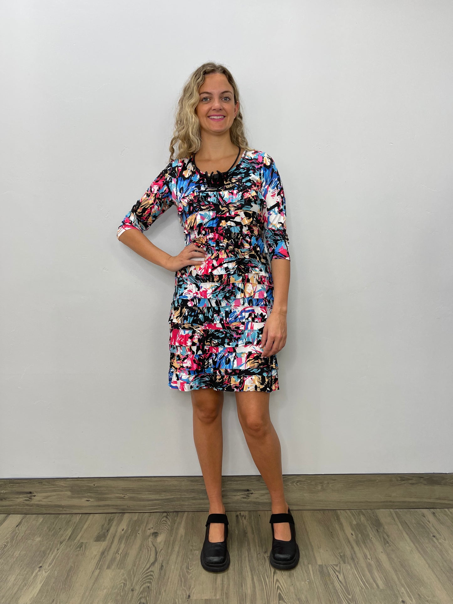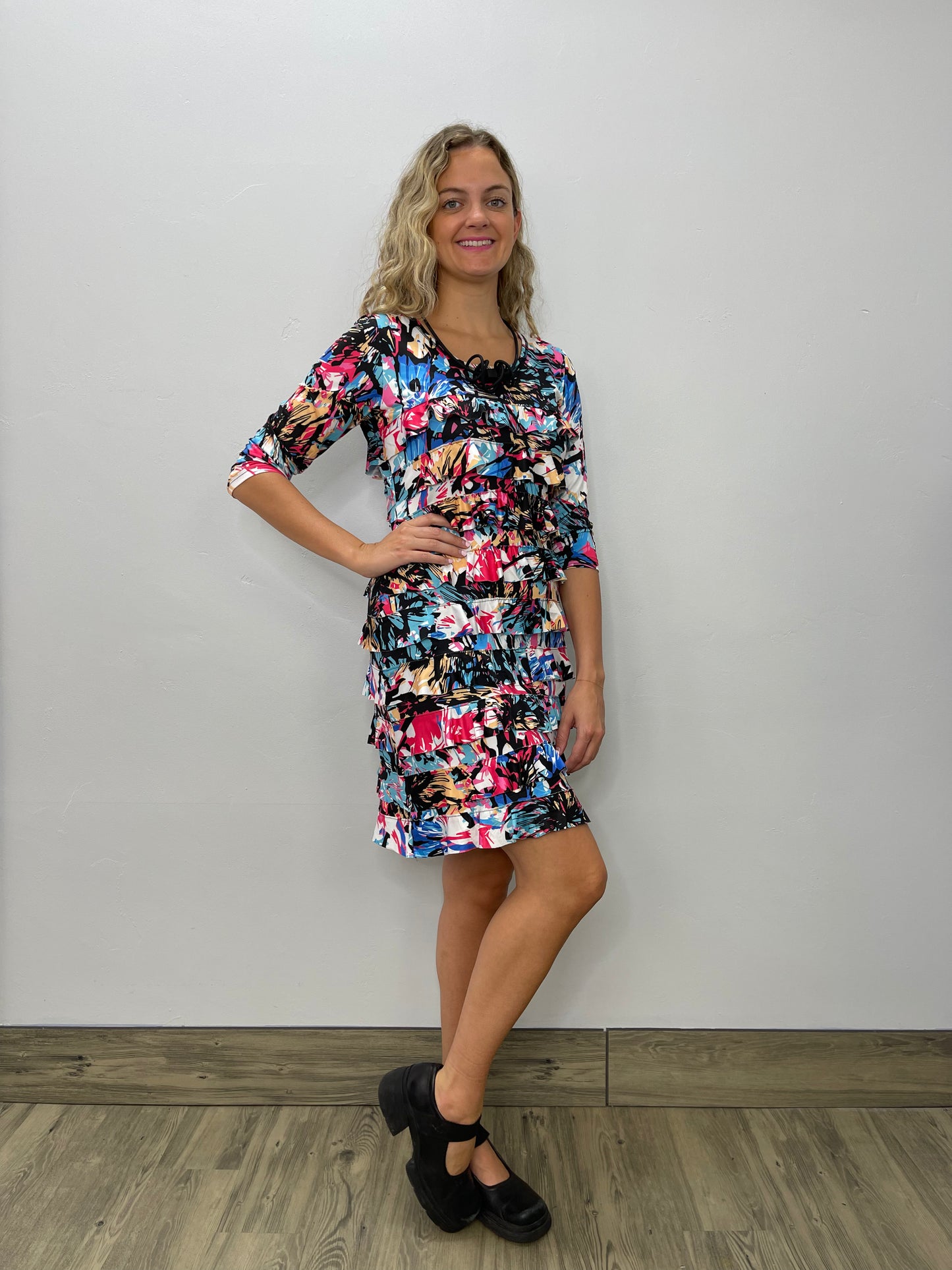 Graffiti 3/4 Sleeve Scoop Neck Ruffle Dress