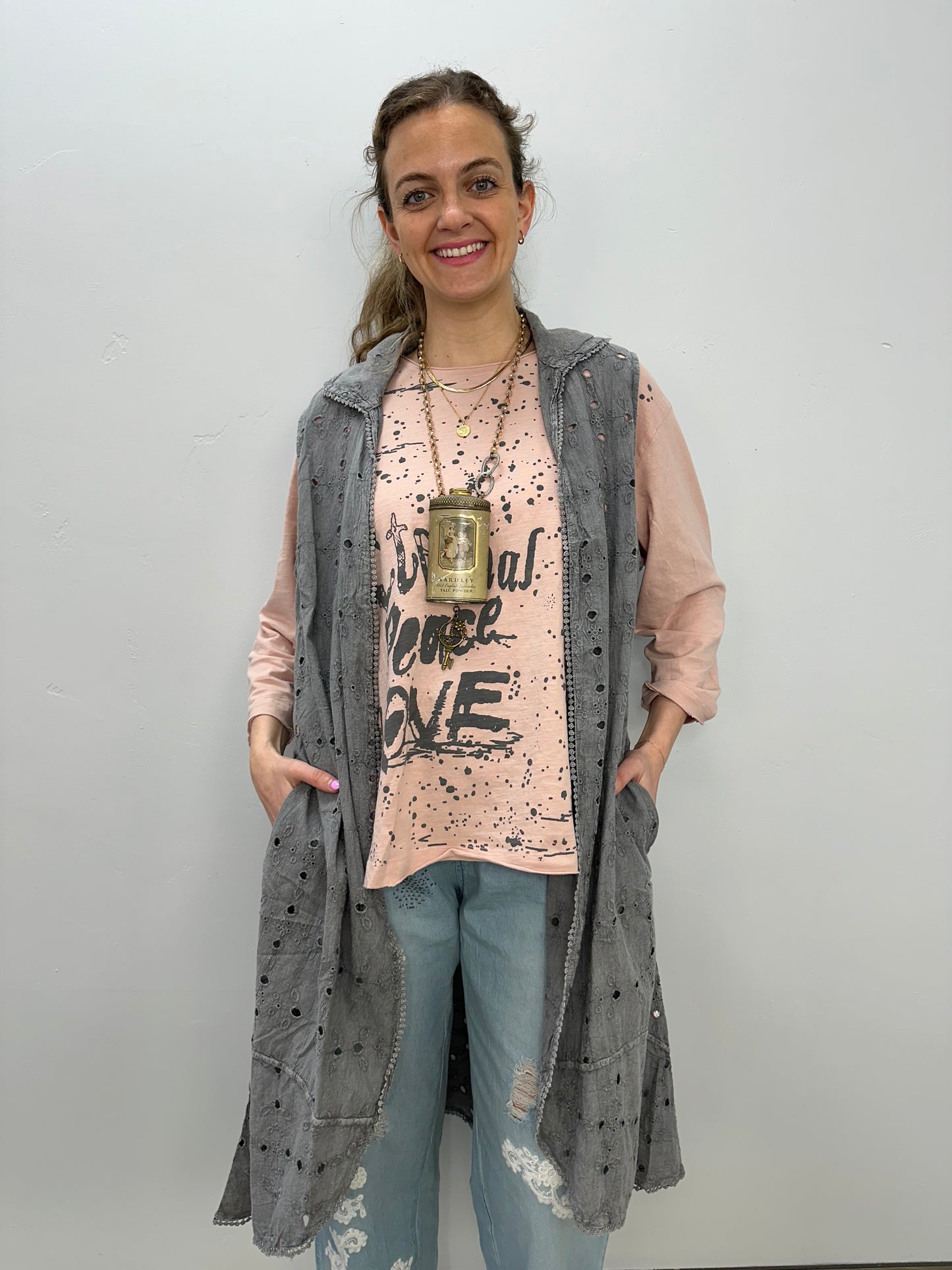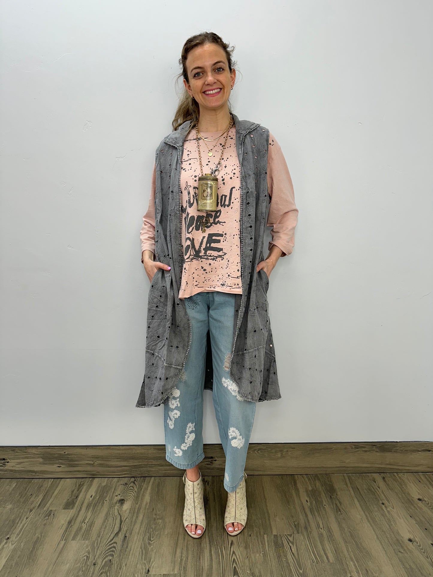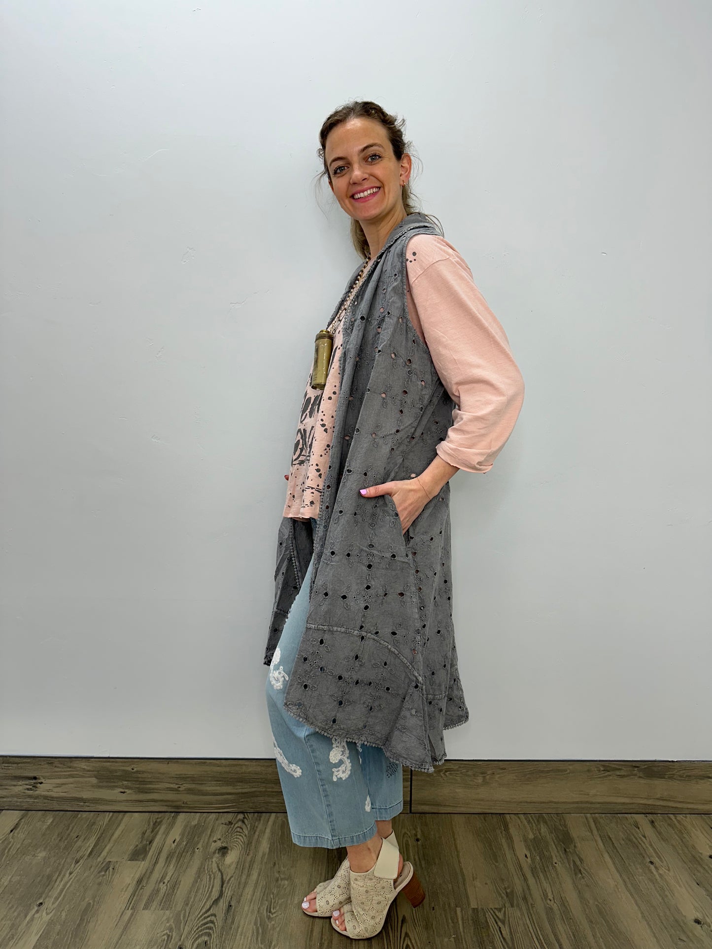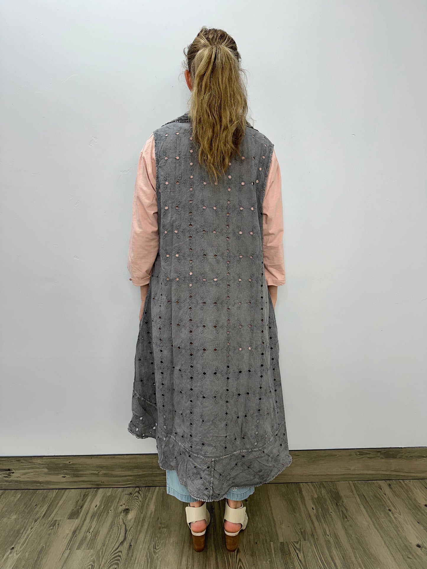 Regular price $90.30This gray sleeveless vest features delicate embroidered detailing and two functional pockets. Its lightweight design makes it perfect for layering over a baby pink tee for a stylish and practical outfit. Stay on trend with this versatile piece!