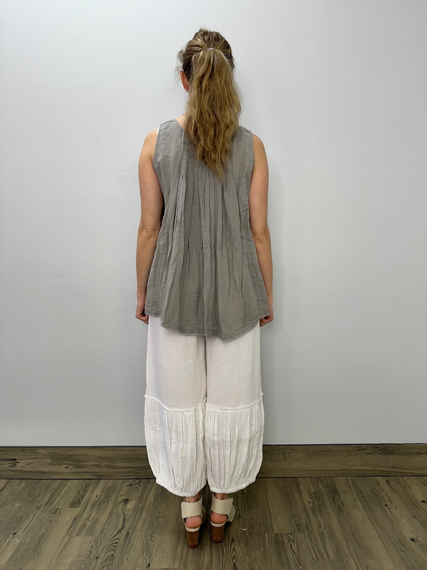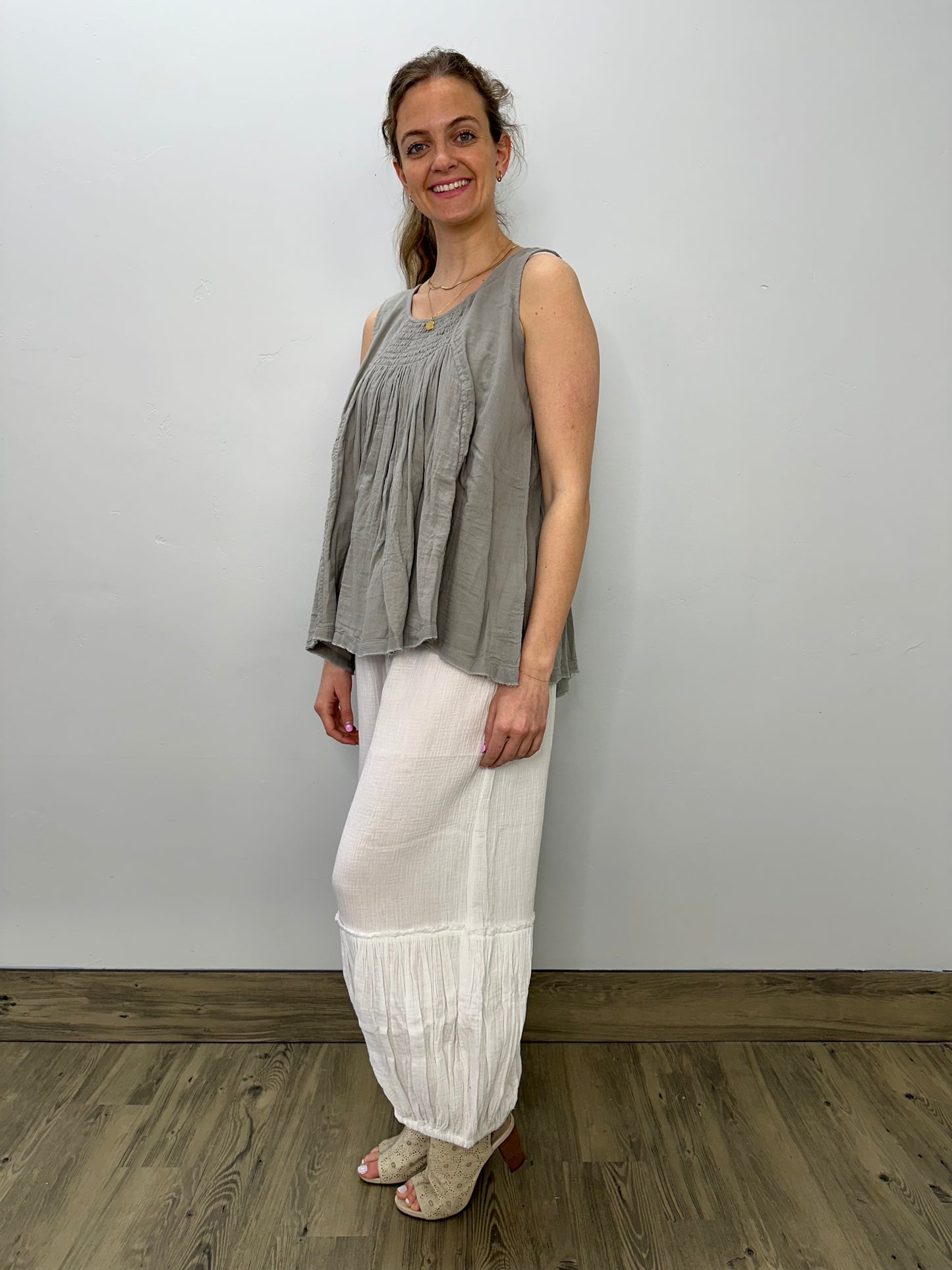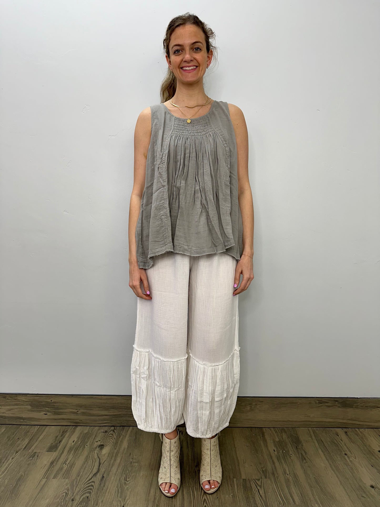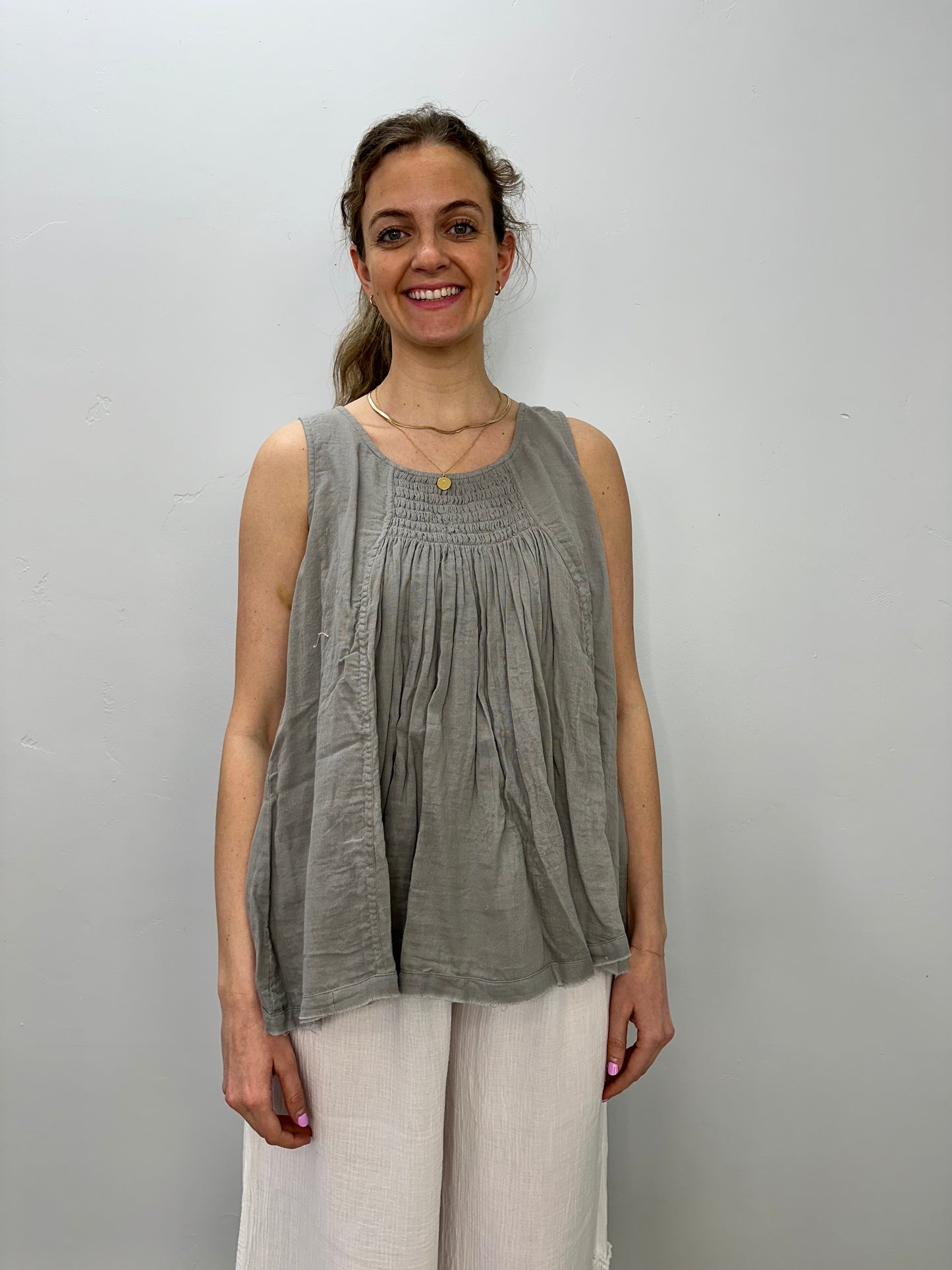 This Grey Pleated Smock Sleeveless Flare Top boasts a chic scoop neck design and elegant crochet details. Its lightweight construction makes it perfect for any occasion. Stay stylish and comfortable with this must-have addition to your wardrobe.