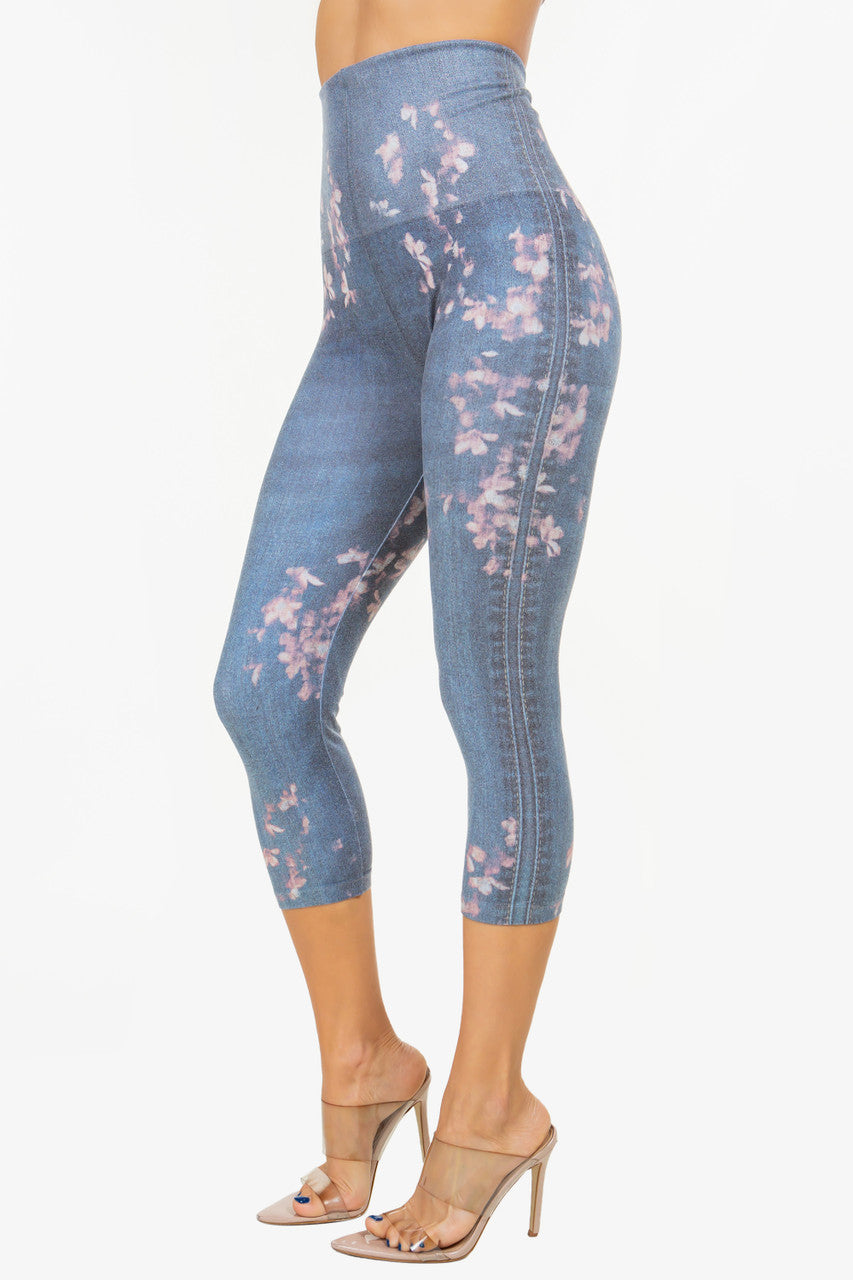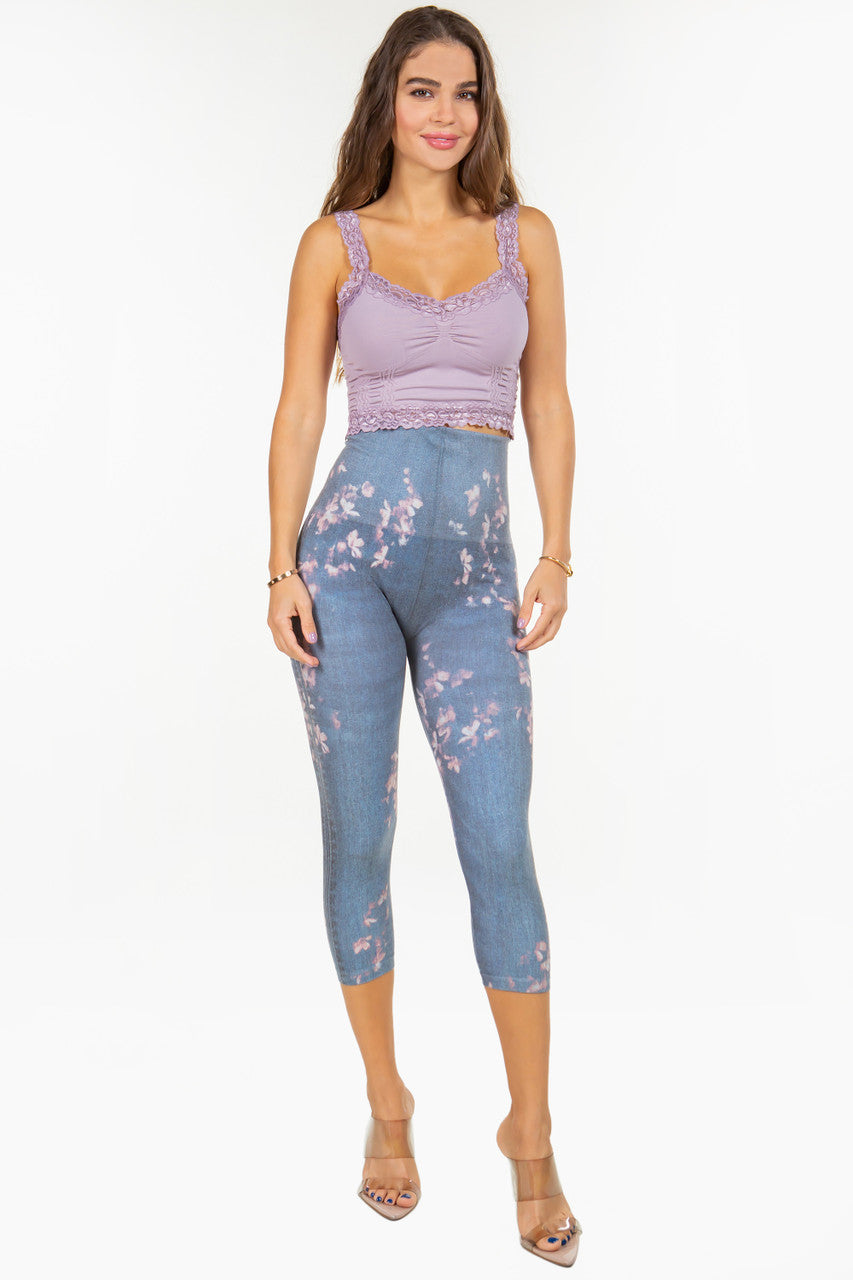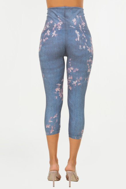 High Waist Light denim Crop Legging with Reverse Tie Dye Floral Print
