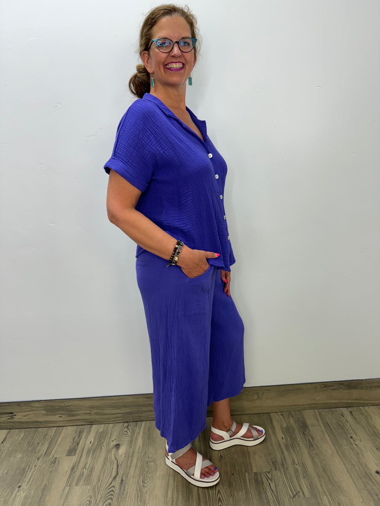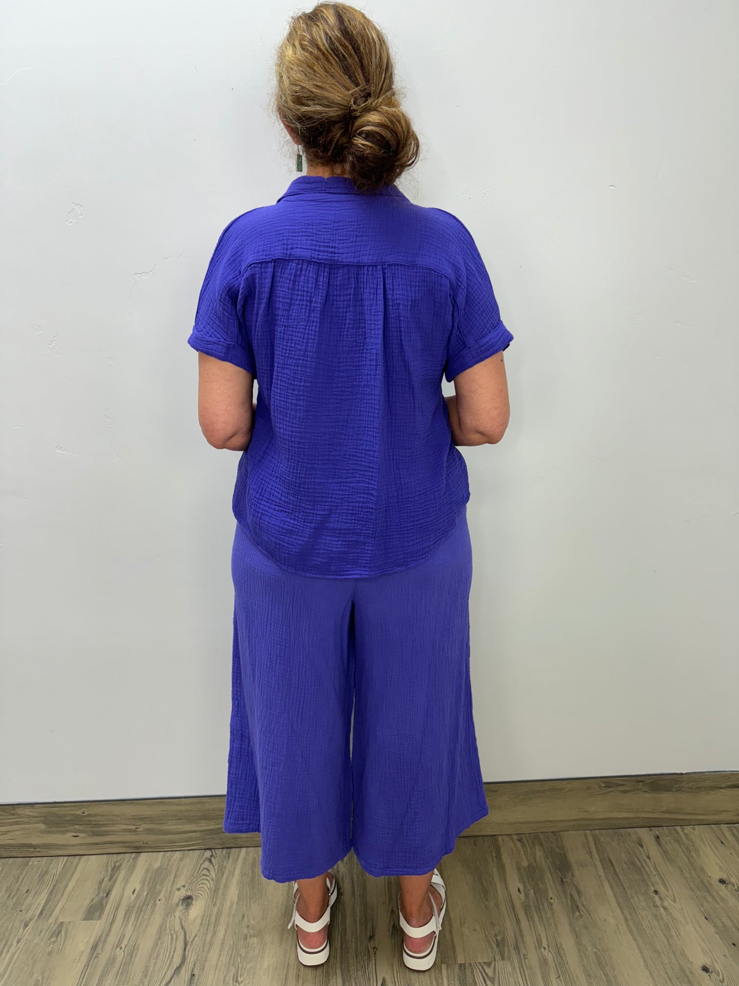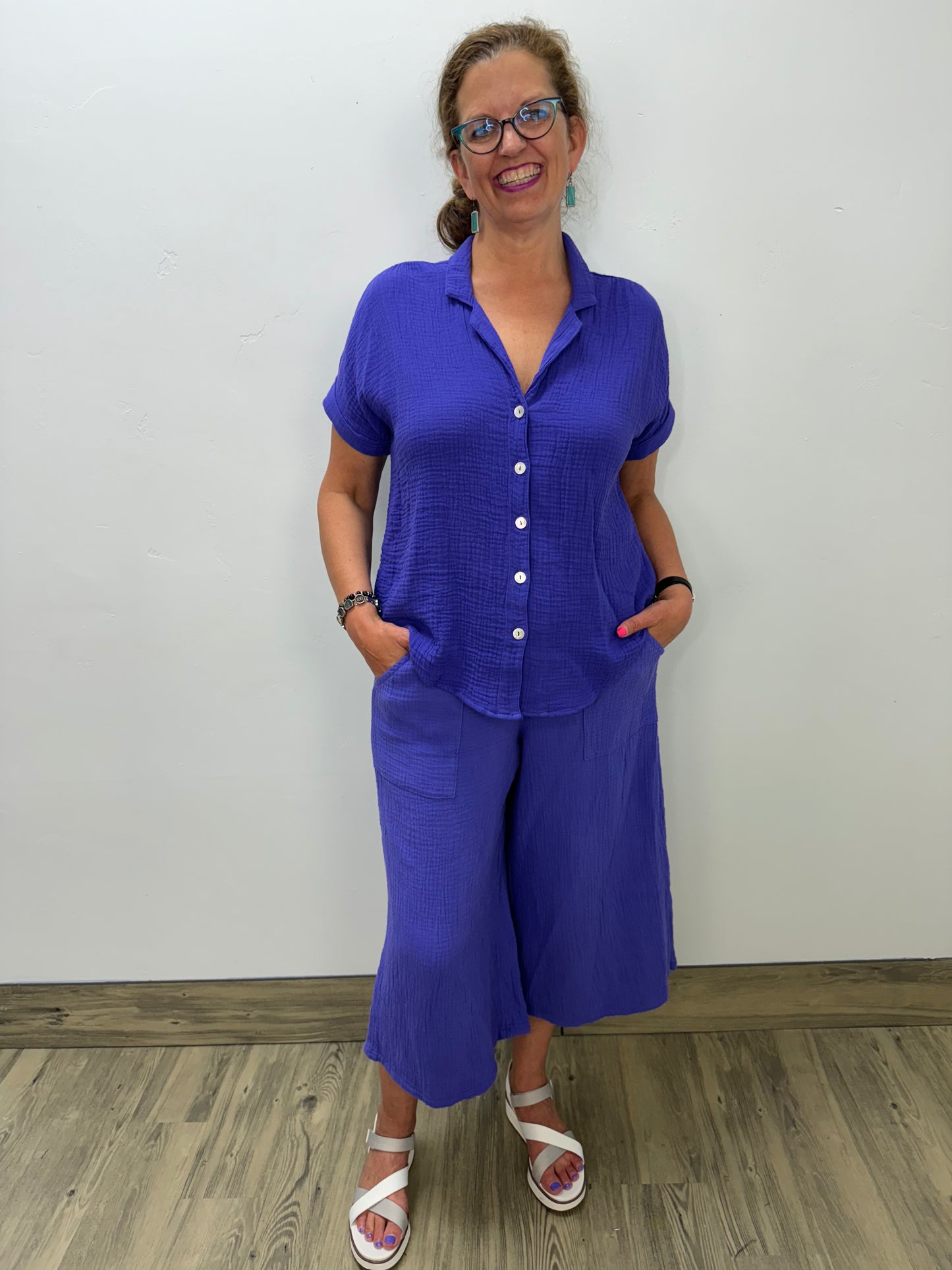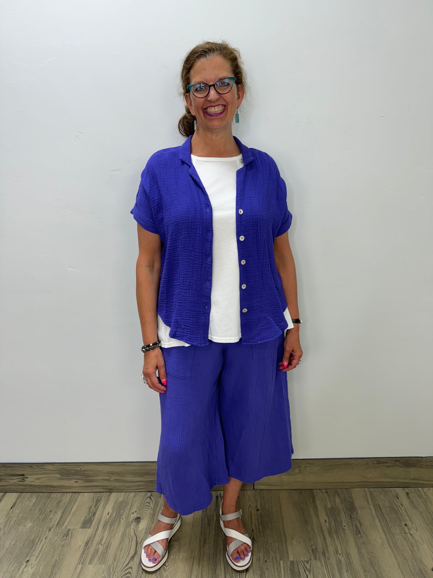 Iris Purple Cotton Gauze Short Sleeve Button Down