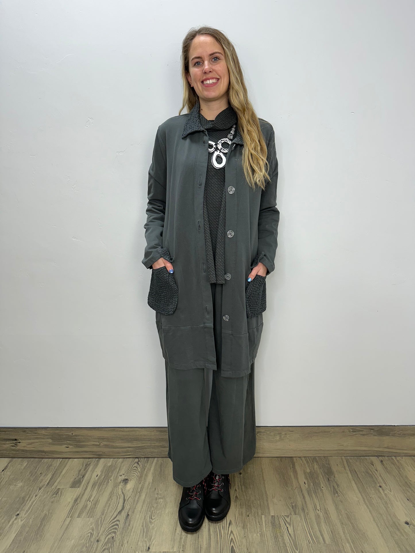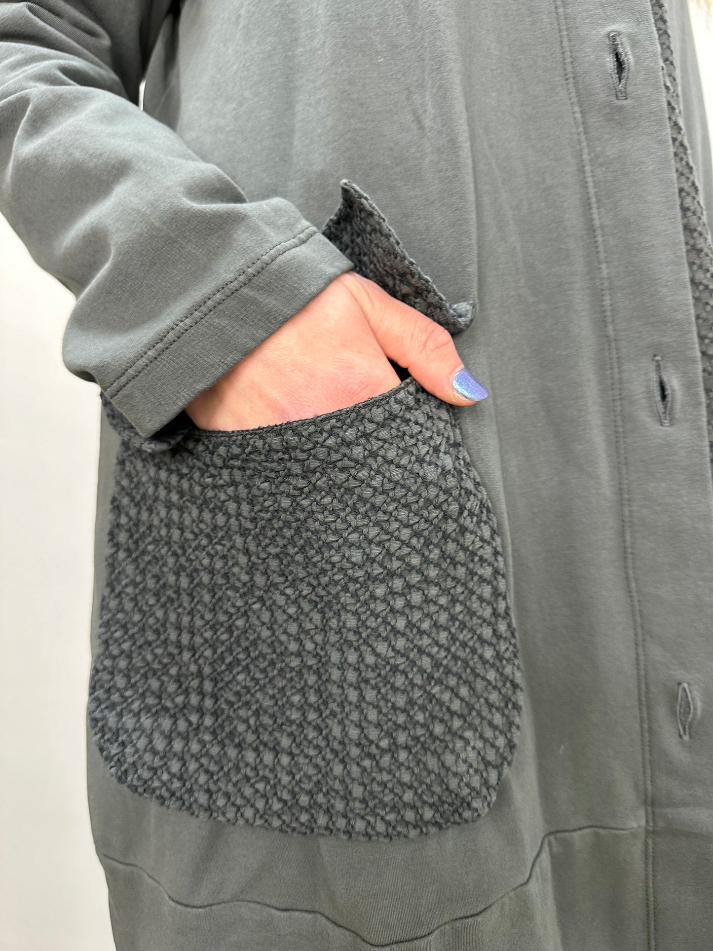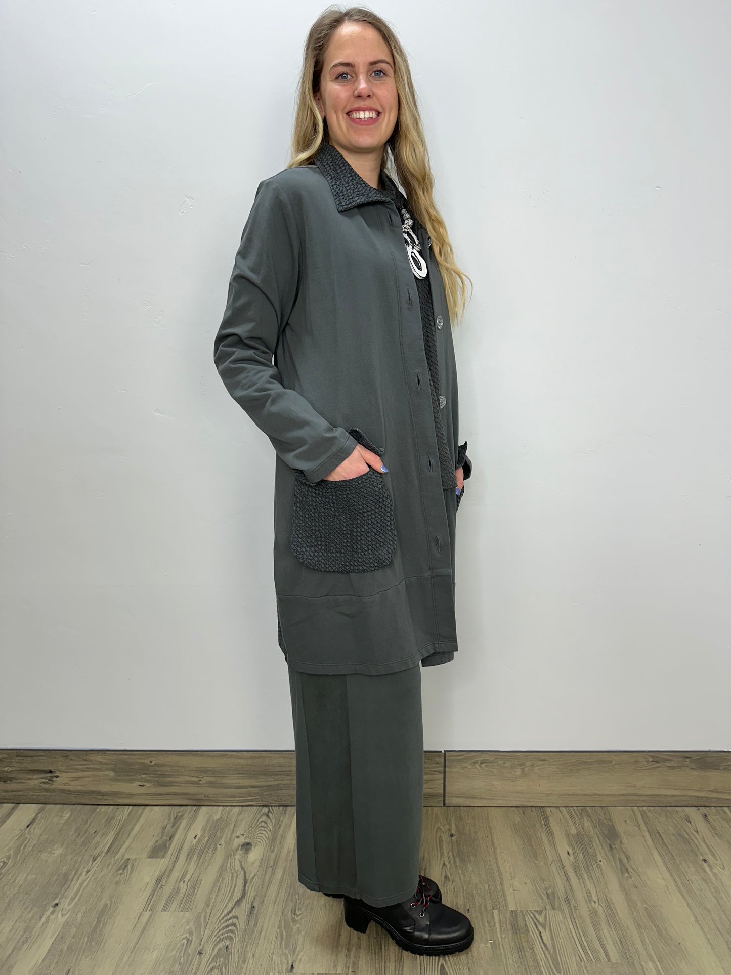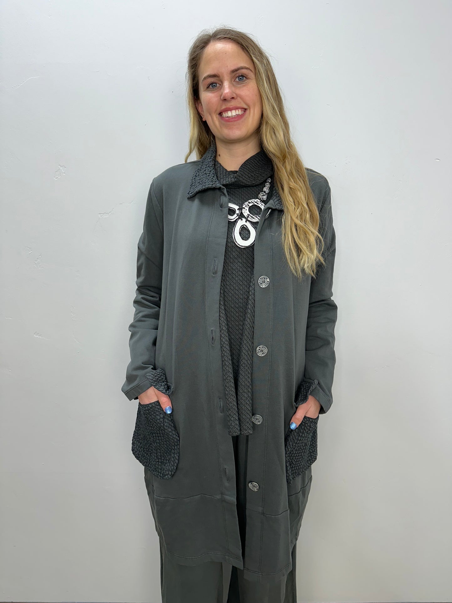 Regular price $132.30Introducing the new and improved Bee Coat! Wrap yourself in style and warmth with our Fenini Iron Grey Patch Button Down Coat! Made with luxuriously soft fabric, this coat features 5 metal buttons, two accent pockets, and a matching collar. Keep your essentials close at hand while making a fashion statement.