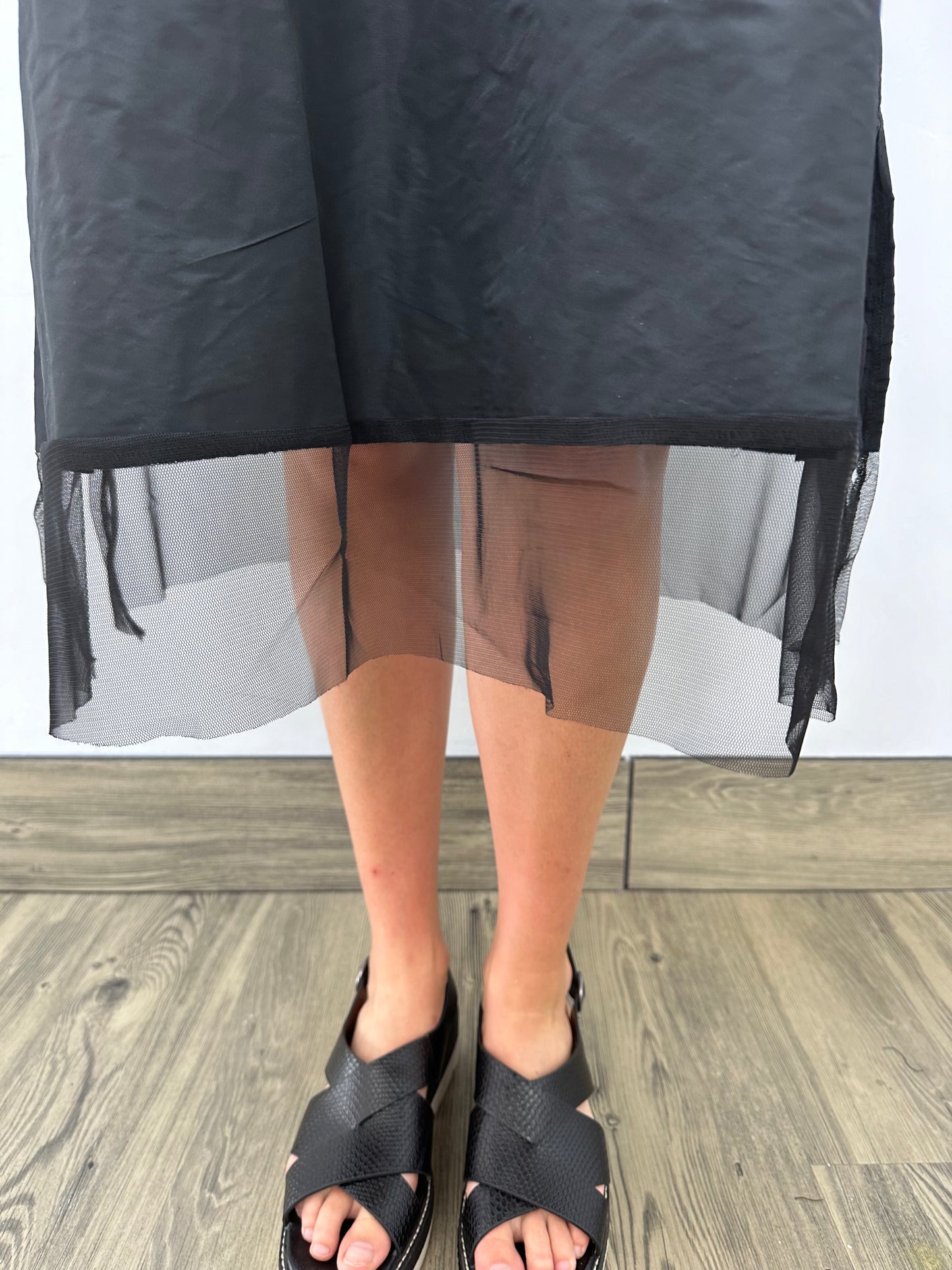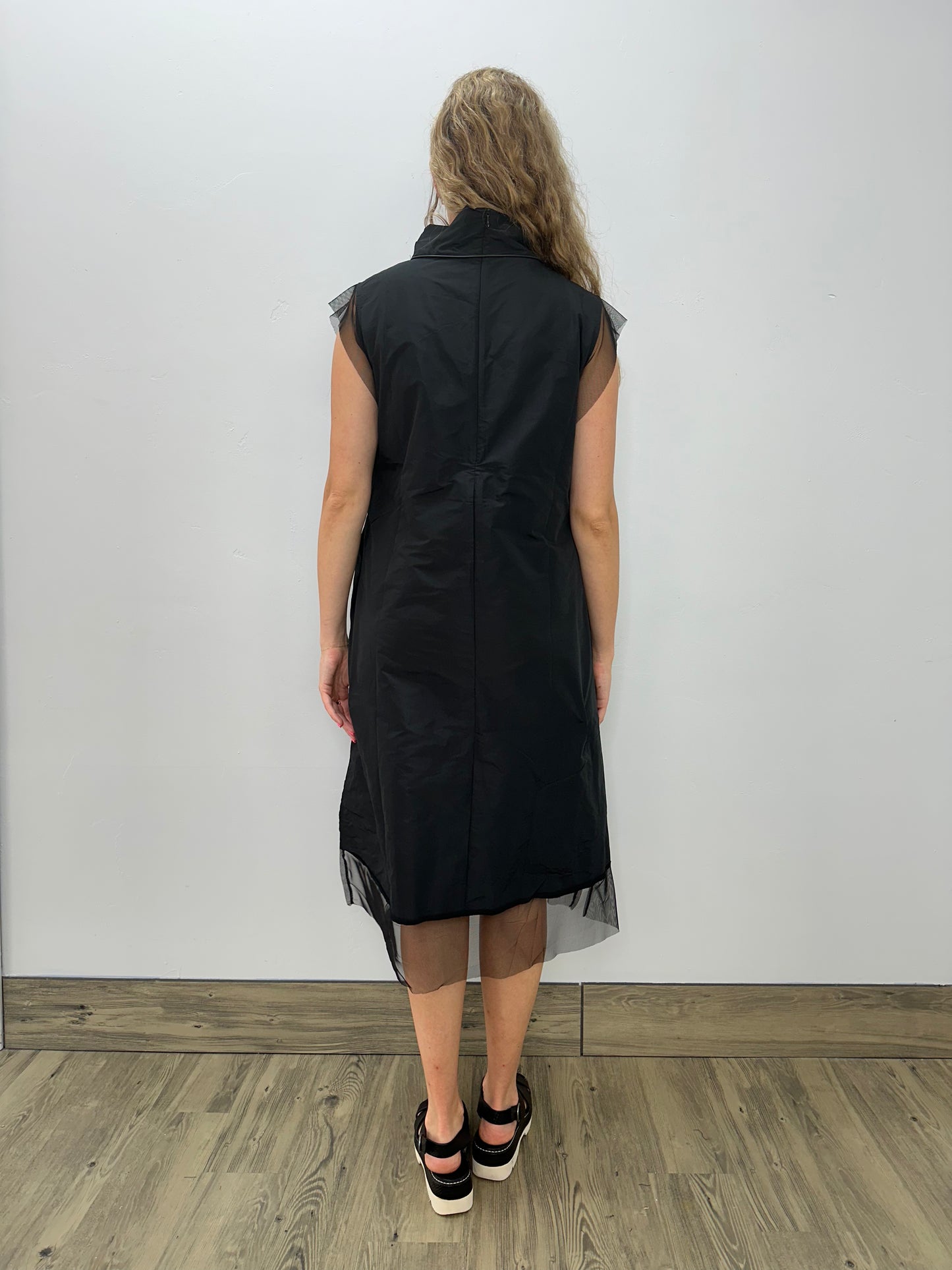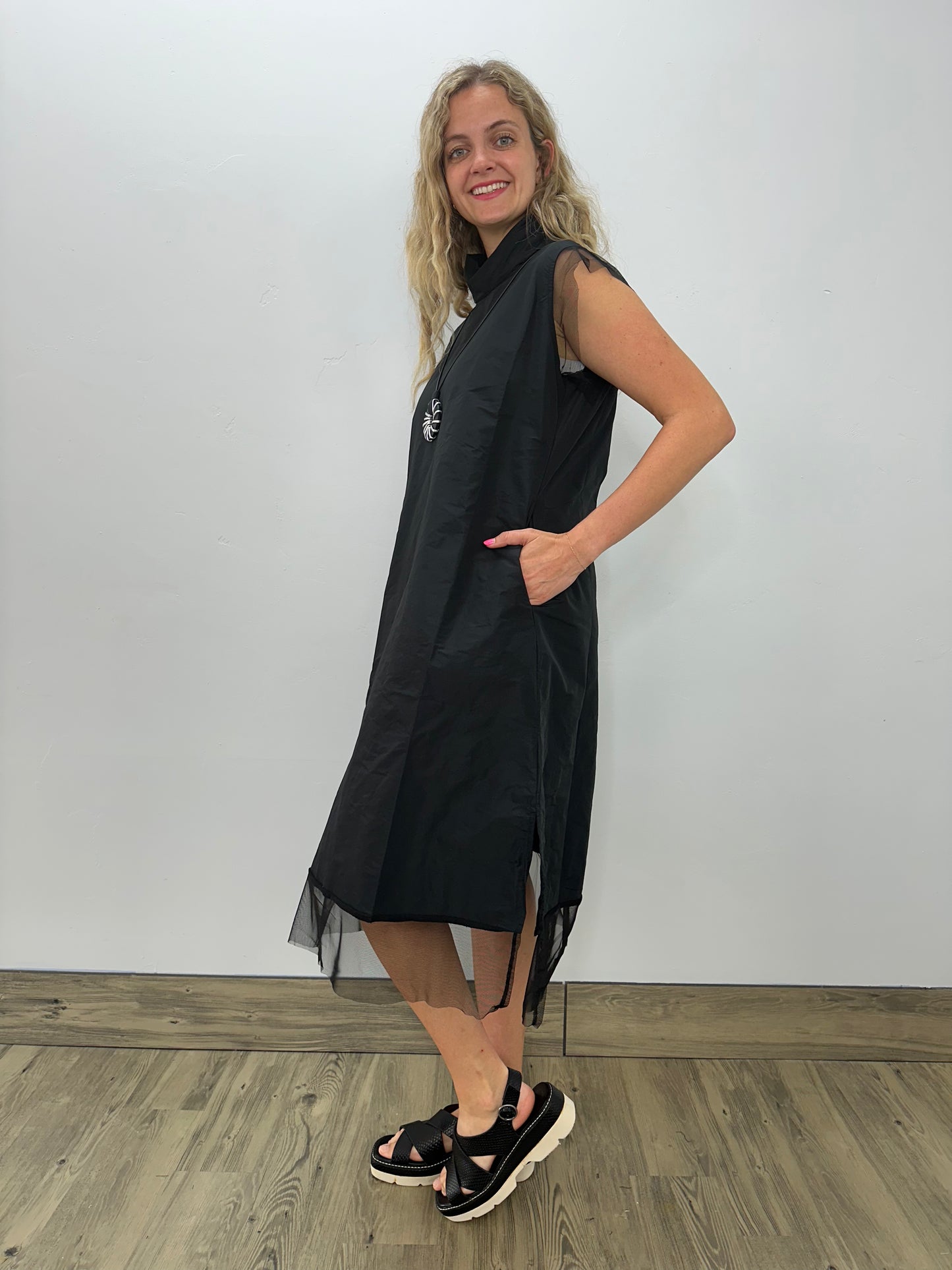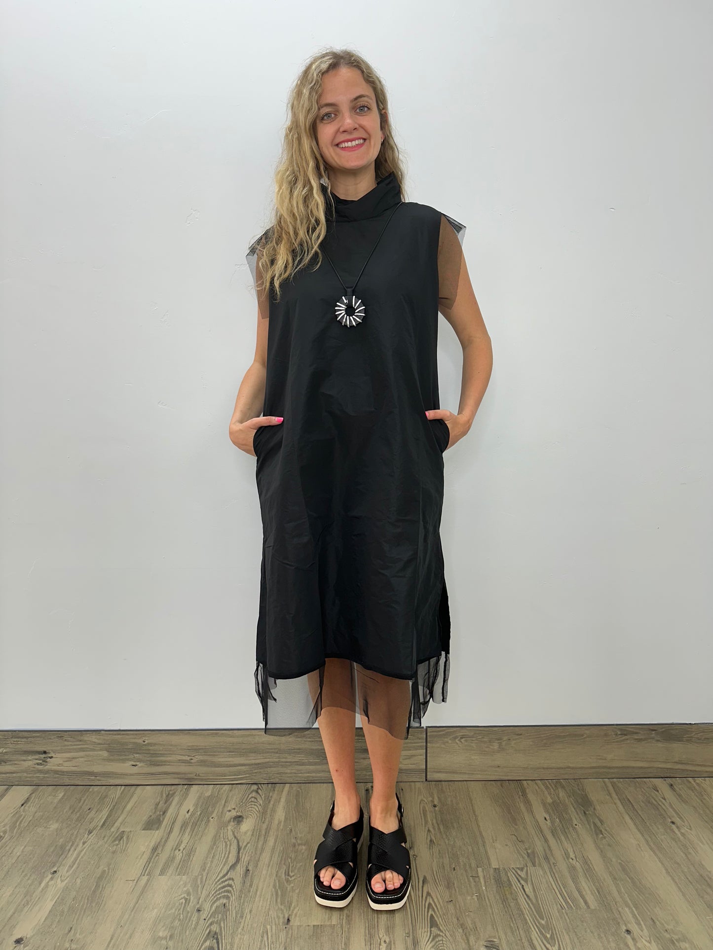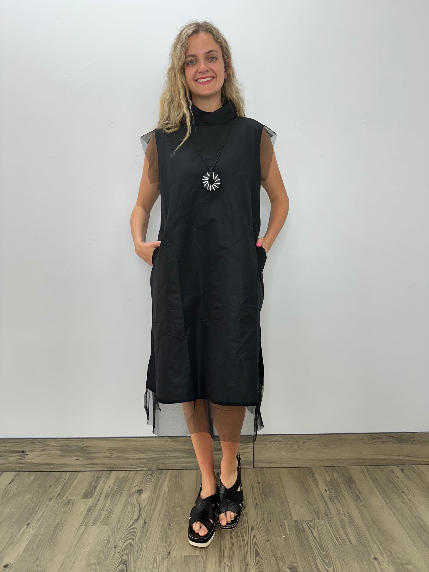 Unleash your inner artist with our Jet Black Amari Dress! The sleeveless design and mesh accents along the sleeve and bottom hemline add a touch of edginess, while the long length and cowl neck create a chic and sophisticated look. The back zipper allows for easy wear, making it perfect for any occasion. Stand out from the crowd and express your unique style with this artsy dress!