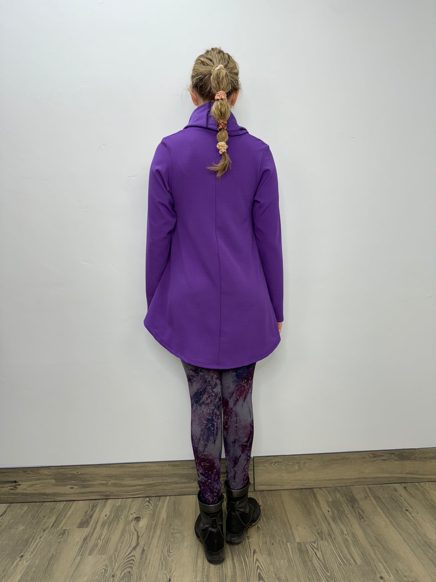 Designed by Twist Boutique owner Trish Bosman. This double knit cowl neck tunic offers a slimming yet loose fit from the bust to waistline. It then falls to a skirt like bottom with a shirttail hemline.