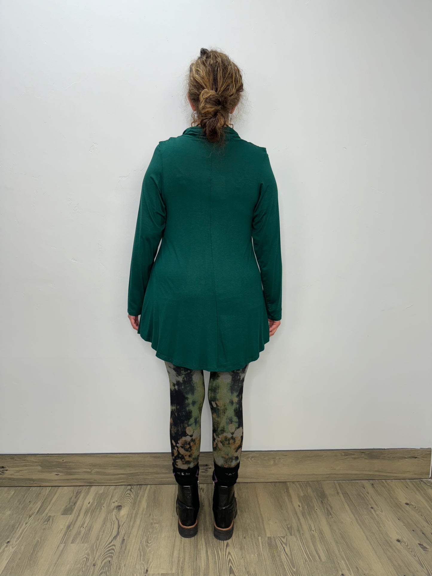 Designed by Twist Boutique owner Trish Bosman. This cowl neck tunic offers a slimming yet loose fit from the bust to waistline. It then falls to a skirt like bottom with a shirttail hemline.