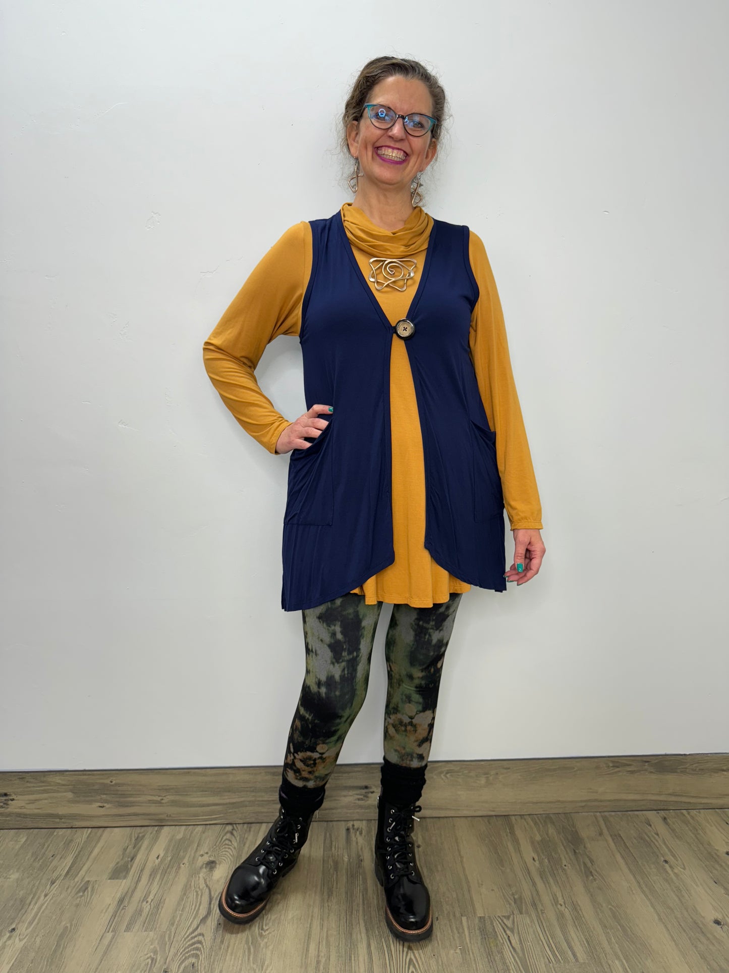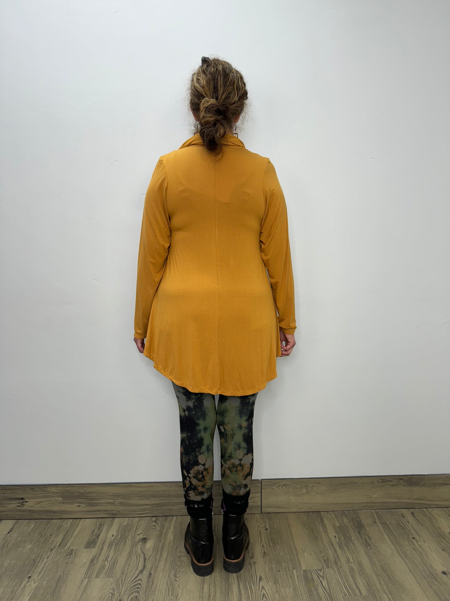 Designed by Twist Boutique owner Trish Bosman. This cowl neck tunic offers a slimming yet loose fit from the bust to waistline. It then falls to a skirt like bottom with a shirttail hemline.