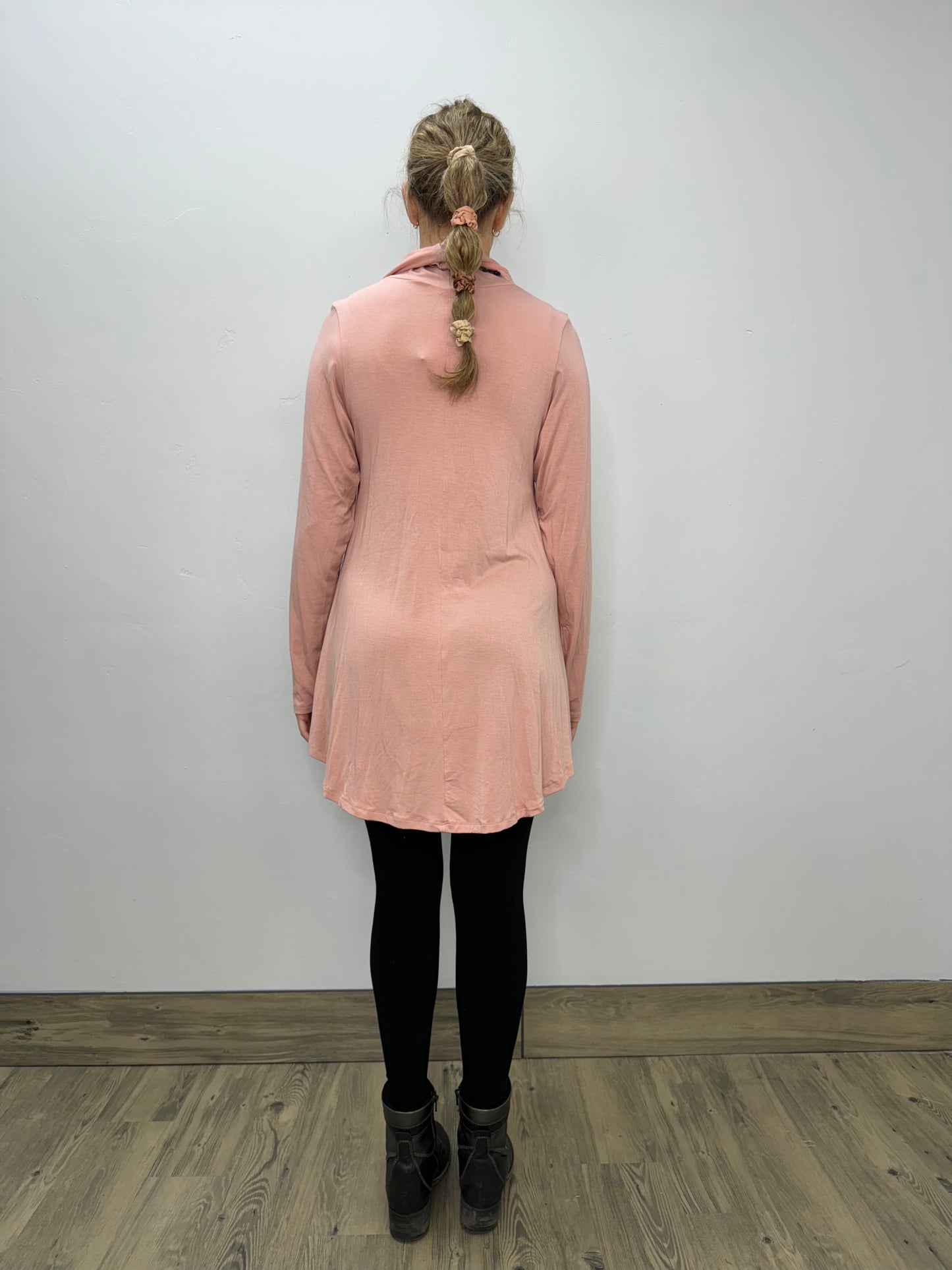 Designed by Twist Boutique owner Trish Bosman. This cowl neck tunic offers a slimming yet loose fit from the bust to waistline. It then falls to a skirt like bottom with a shirttail hemline.
