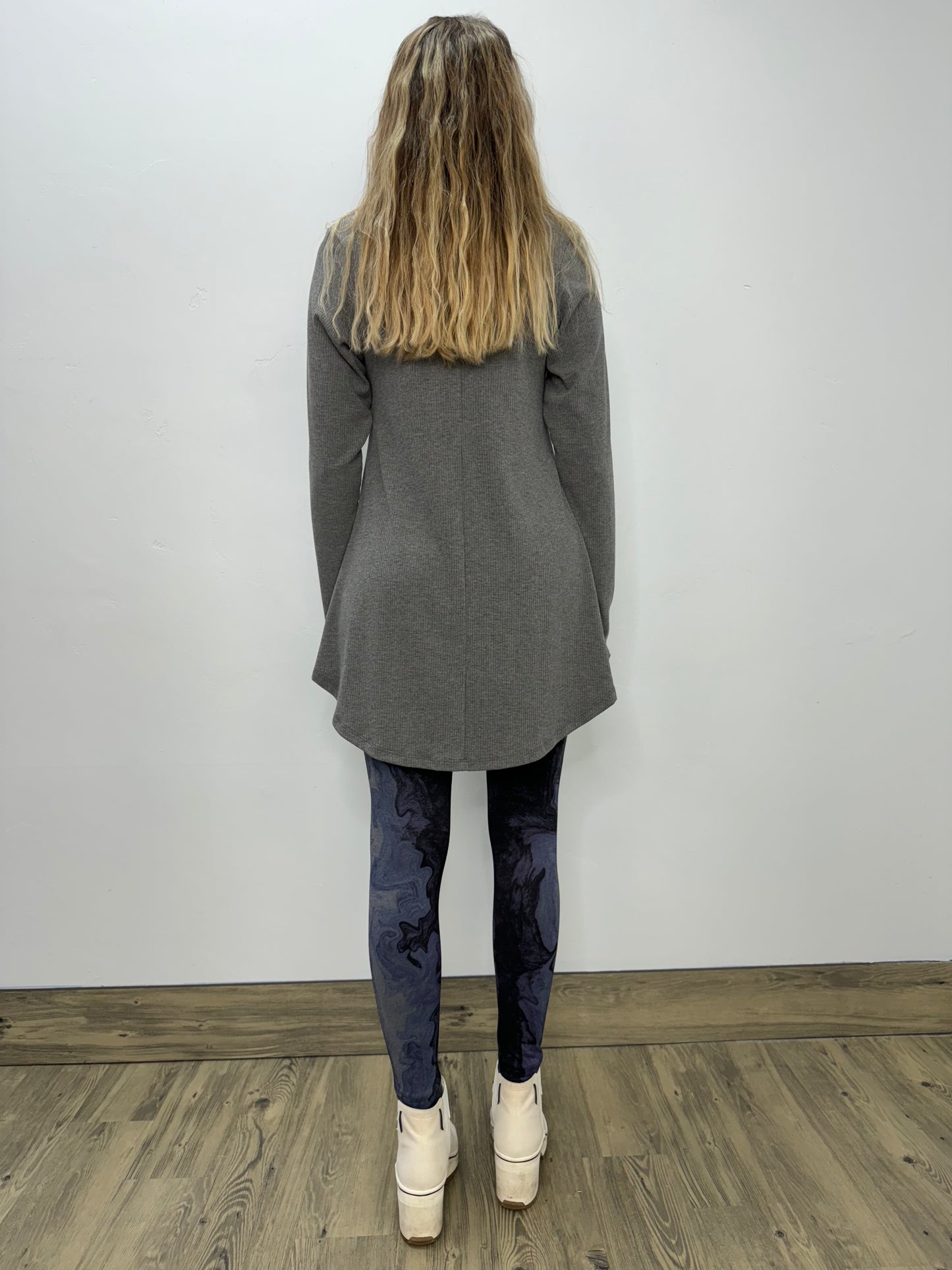Designed by Twist Boutique owner Trish Bosman. This ribbed cowl neck tunic offers a slimming yet loose fit from the bust to waistline. It then falls to a skirt like bottom with a shirttail hemline.