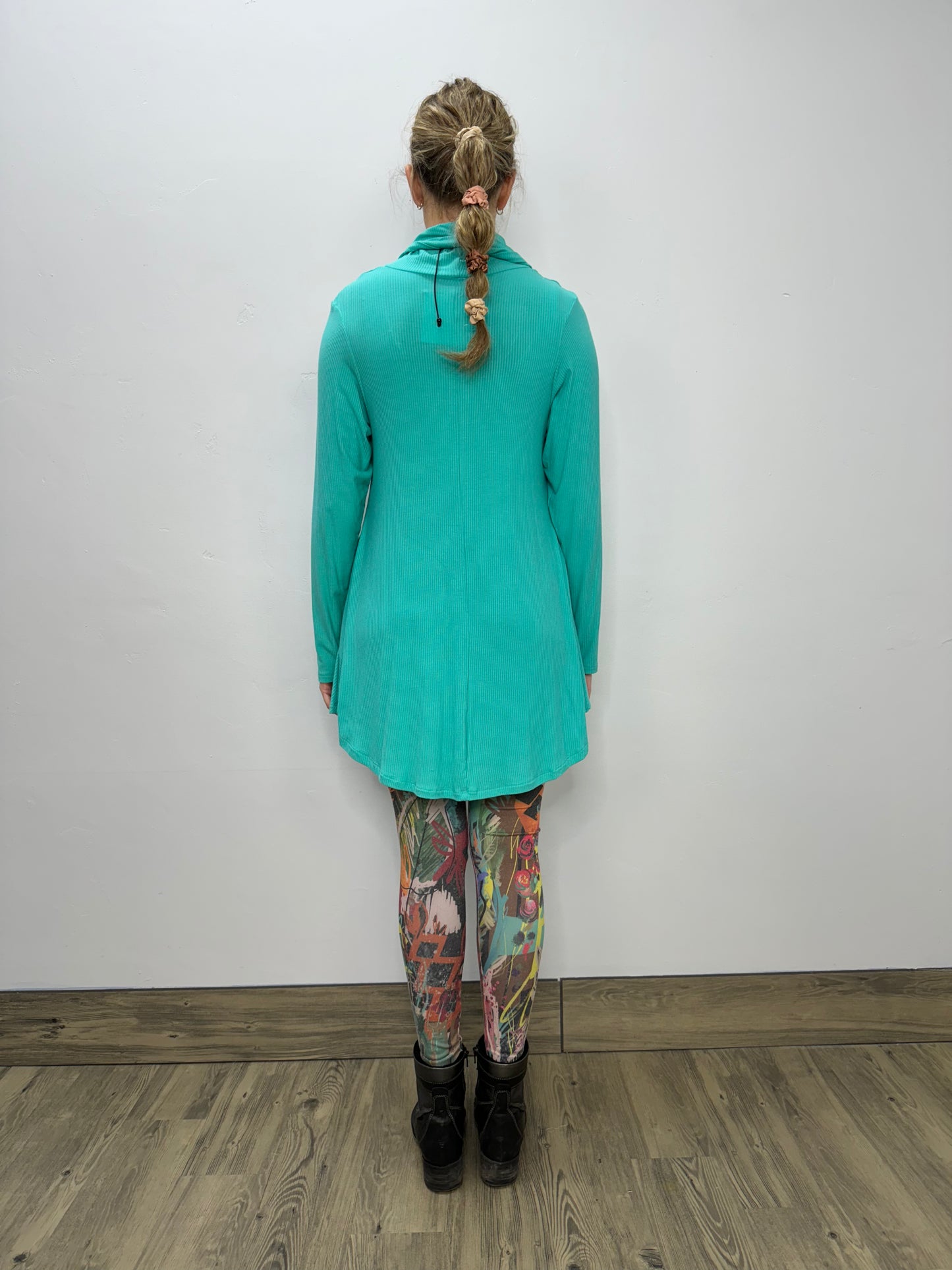 Designed by Twist Boutique owner Trish Bosman. This ribbed cowl neck tunic offers a slimming yet loose fit from the bust to waistline. It then falls to a skirt like bottom with a shirttail hemline.