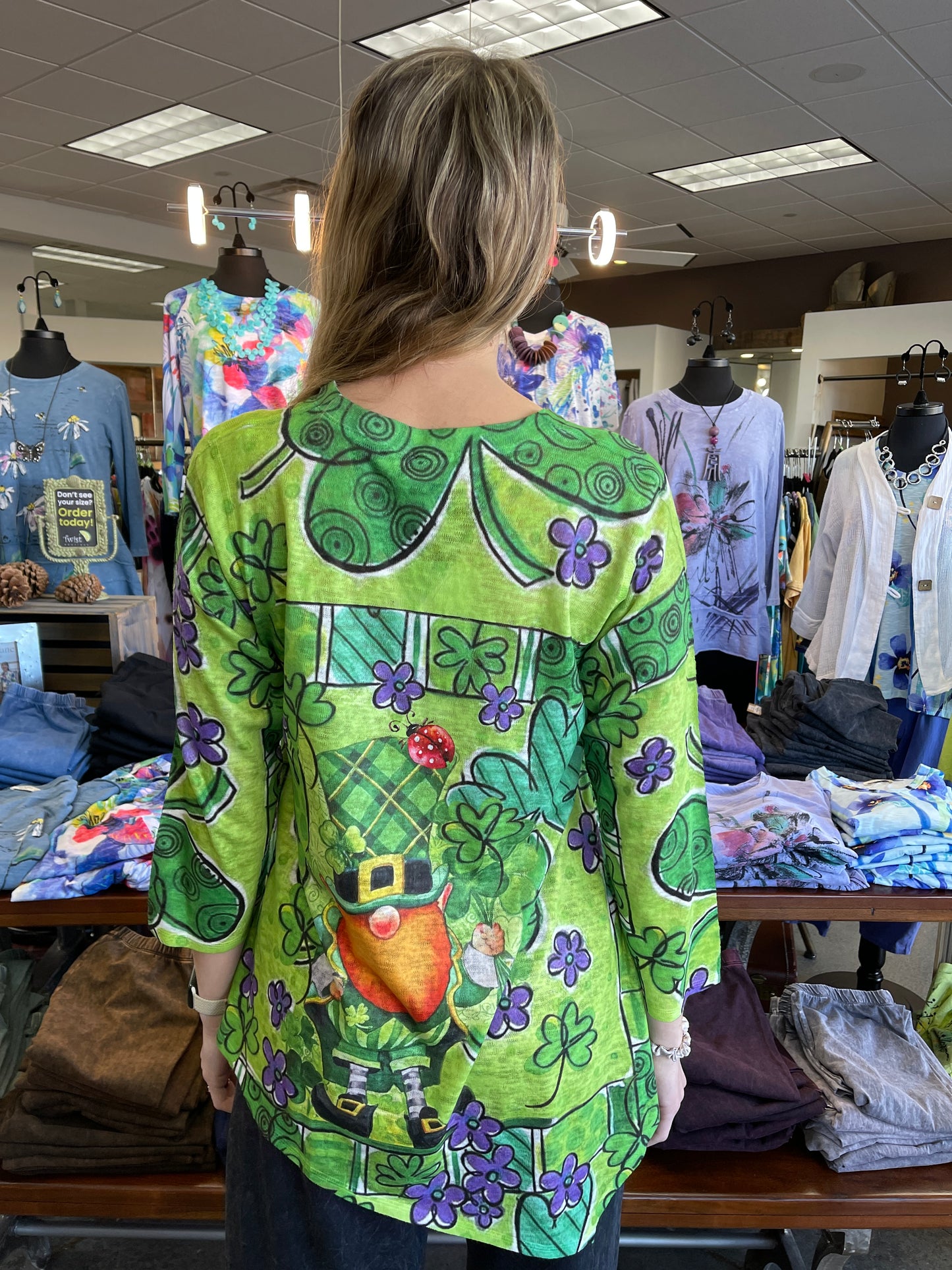 This Lucky Leprechaun V Neck Tunic will bring color and style to your wardrobe. With 3/4 sleeves and an asymmetric hemline, it's the perfect blend of comfort and fashion. The cute leprechaun design adds a touch of whimsy to this must-have piece.