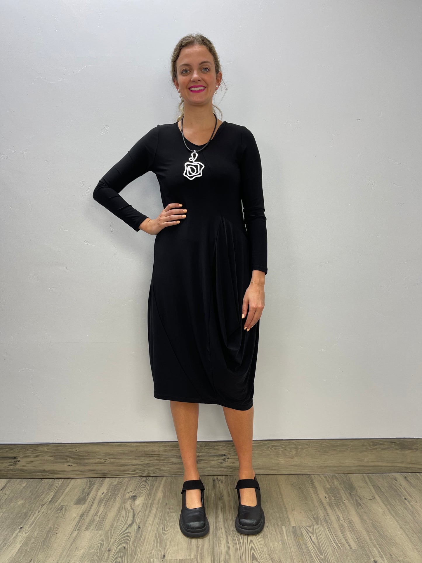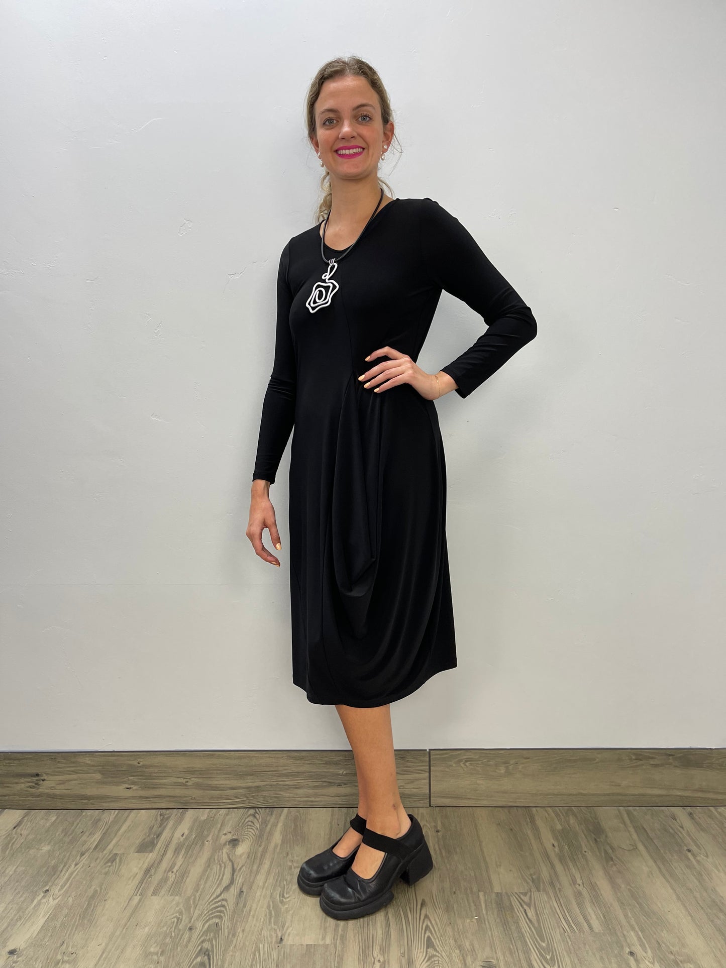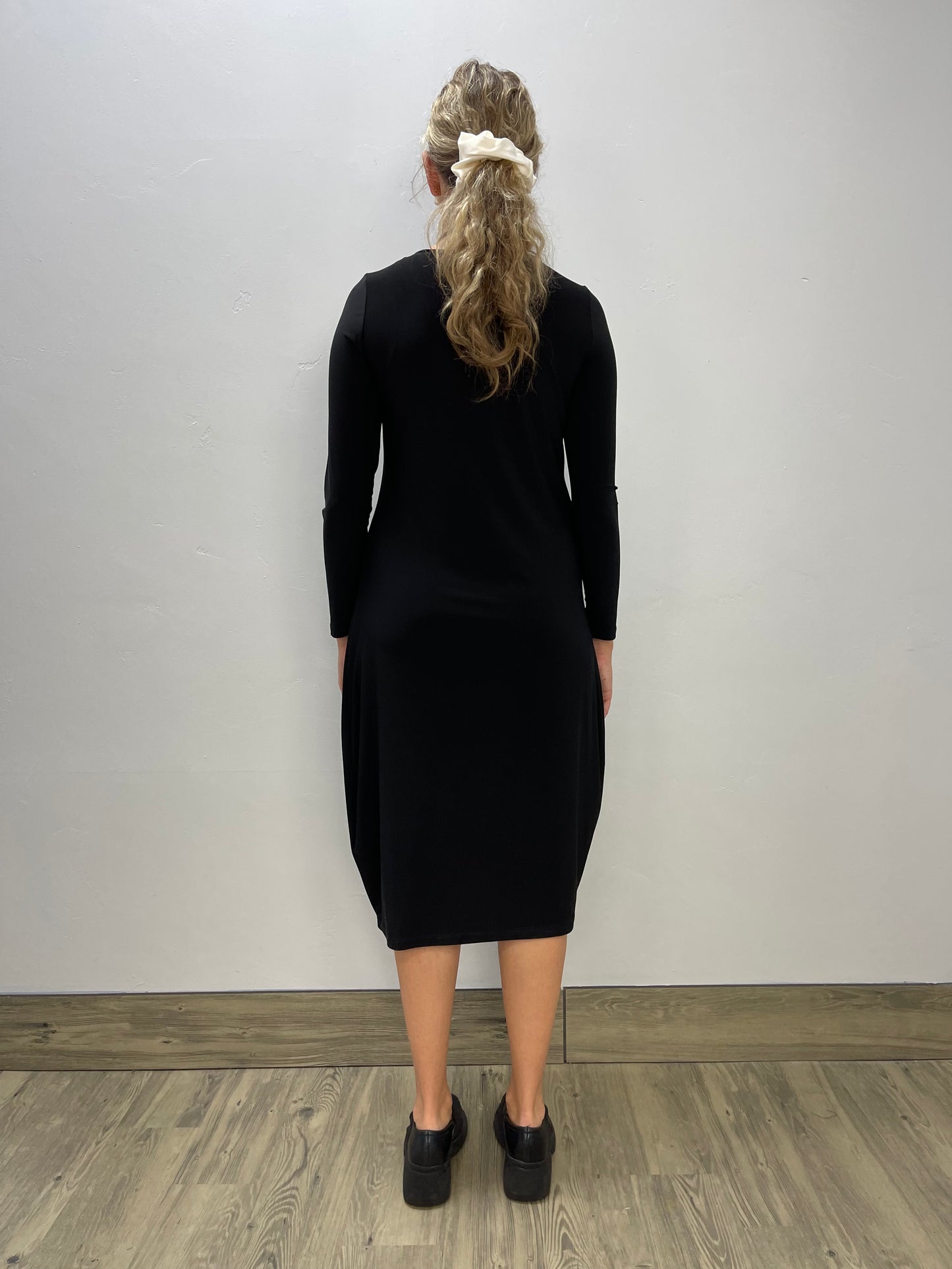 Ready to feel beautiful and stylish? Black Long Sleeve McKinley Dress offers a perfect combination of comfort and fashion. This black dress has long sleeves, a soft v neck, and ruching on the left side. This dress falls mid calf and can be worn alone with boots or with a legging for a cooler event.
